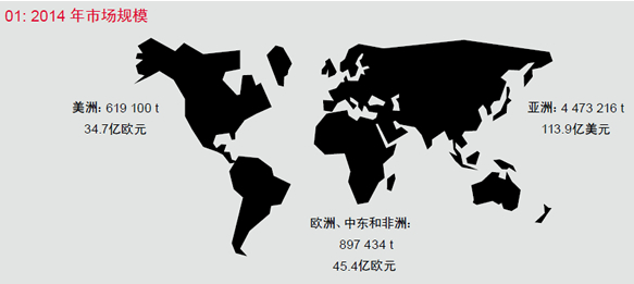 2014年市場規(guī)模,美洲:619100t,34.7億歐元;歐洲、中東和非洲:897434t,45.4億歐元;亞洲:4473216t,113.9億美元。