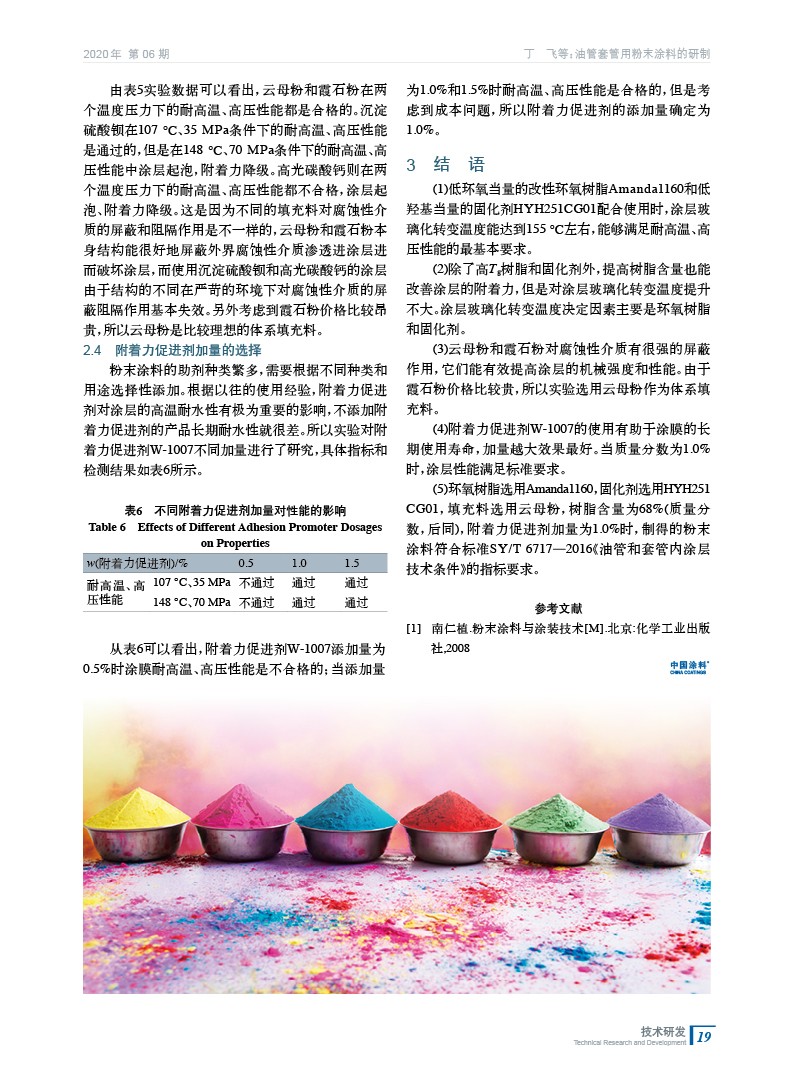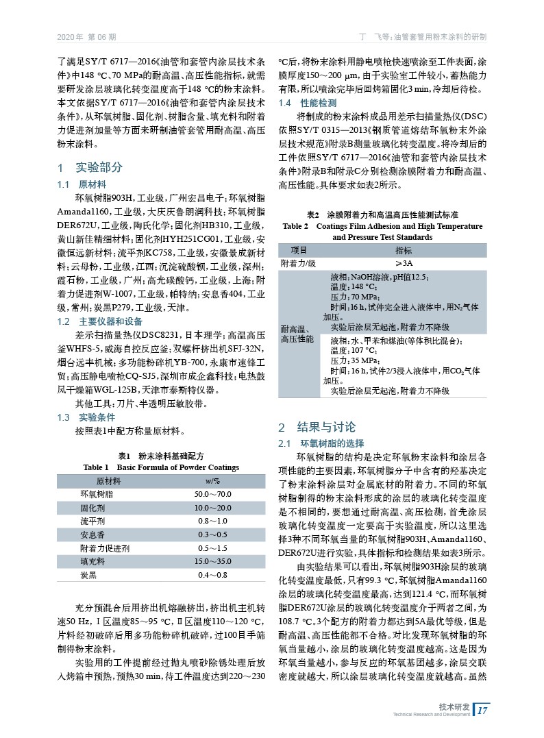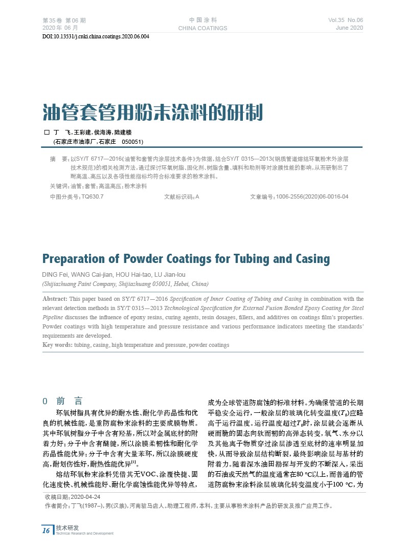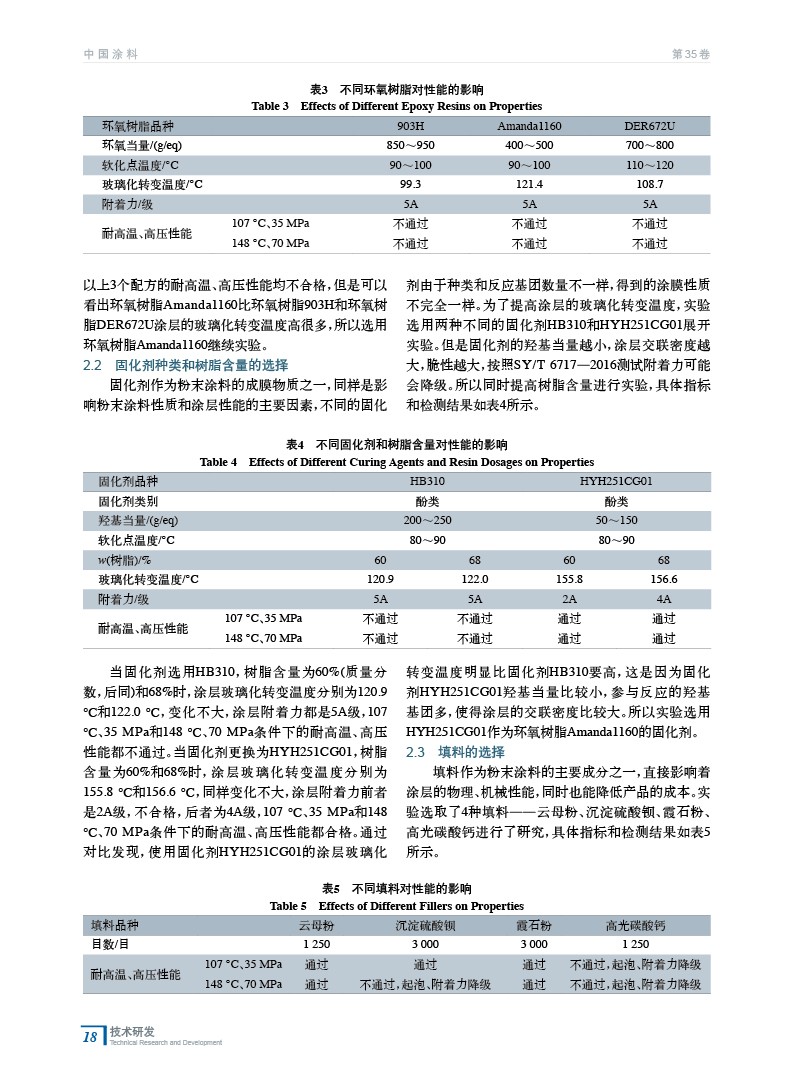 摘要:以SY/T 6717—2016《油管和套管內(nèi)涂層技術(shù)條件》為依據(jù),結(jié)合SY/T 0315—2013《鋼質(zhì)管道熔結(jié)環(huán)氧粉末外涂層技術(shù)規(guī)范》的相關(guān)檢測(cè)方法,通過探討環(huán)氧樹脂、固化劑、樹脂含量、填料和助劑等對(duì)涂膜性能的影響,從而研制出了耐高溫、高壓以及各項(xiàng)性能指標(biāo)均符合標(biāo)準(zhǔn)要求的粉末涂料。
