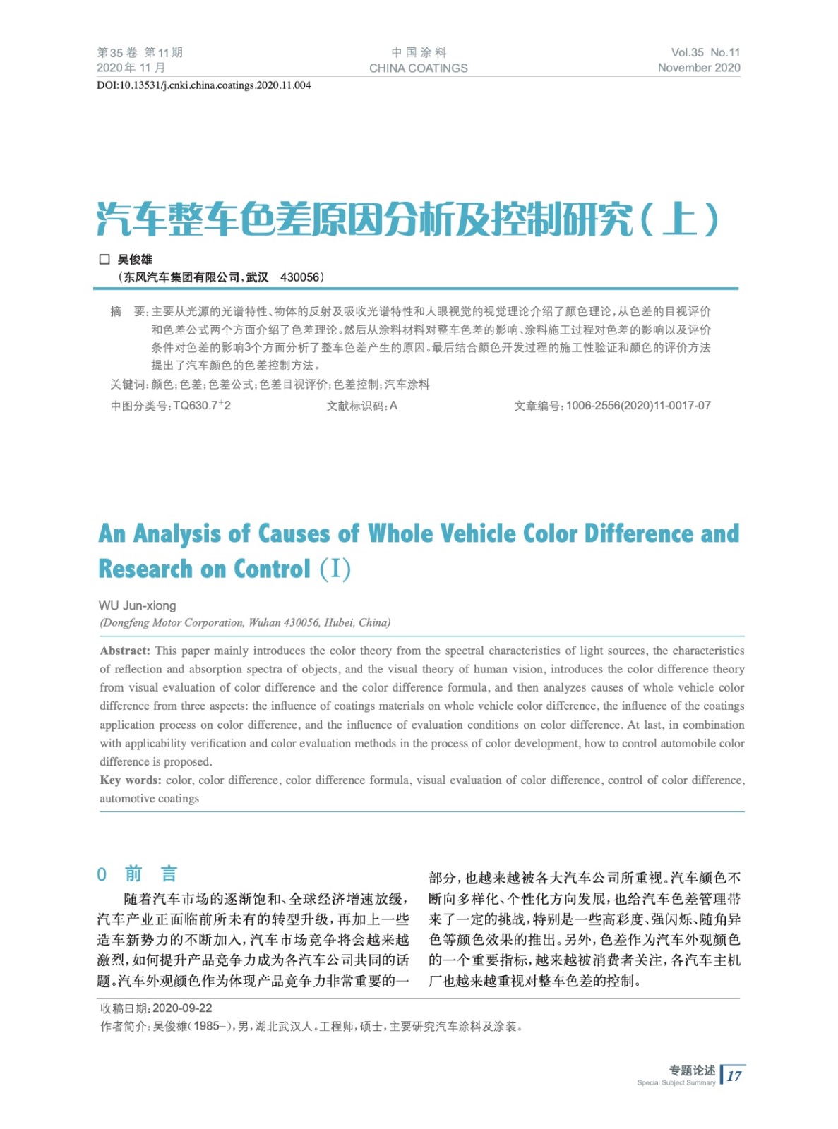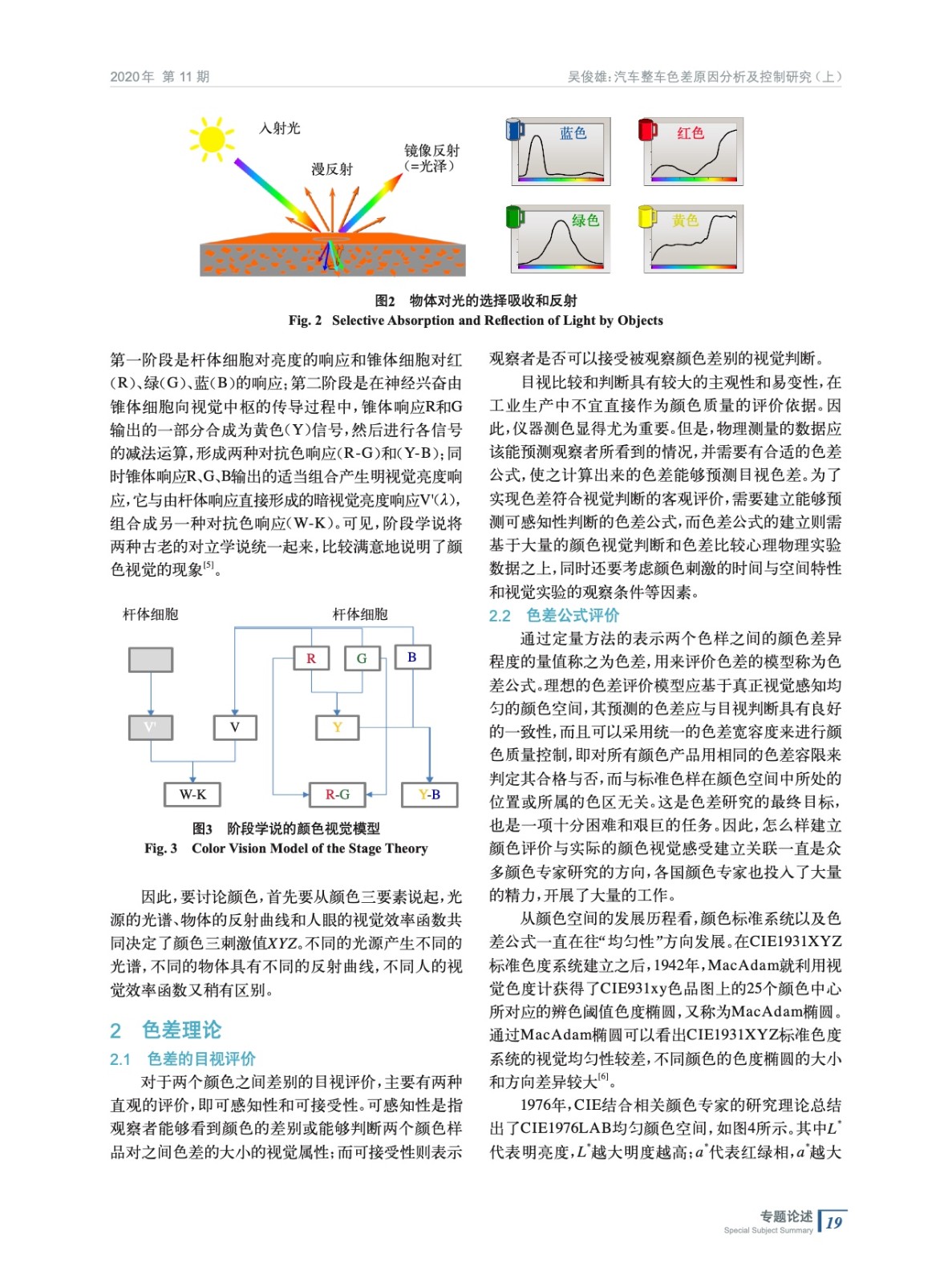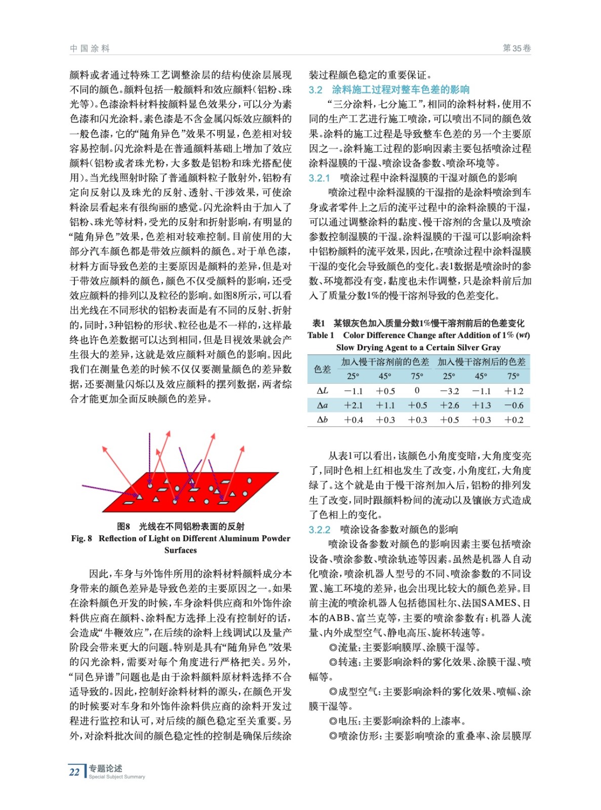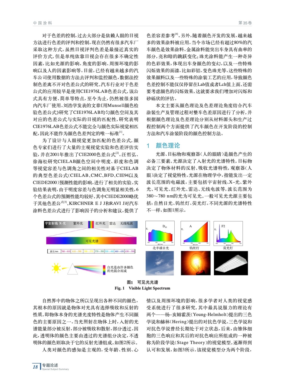 摘要:主要從光源的光譜特性、物體的反射及吸收光譜特性和人眼視覺(jué)的視覺(jué)理論介紹了顏色理論,從色差的目視評(píng)價(jià)和色差公式兩個(gè)方面介紹了色差理論。然后從涂料材料對(duì)整車(chē)色差的影響、涂料施工過(guò)程對(duì)色差的影響以及評(píng)價(jià)條件對(duì)色差的影響3個(gè)方面分析了整車(chē)色差產(chǎn)生的原因。最后結(jié)合顏色開(kāi)發(fā)過(guò)程的施工性驗(yàn)證和顏色的評(píng)價(jià)方法提出了汽車(chē)顏色的色差控制方法。