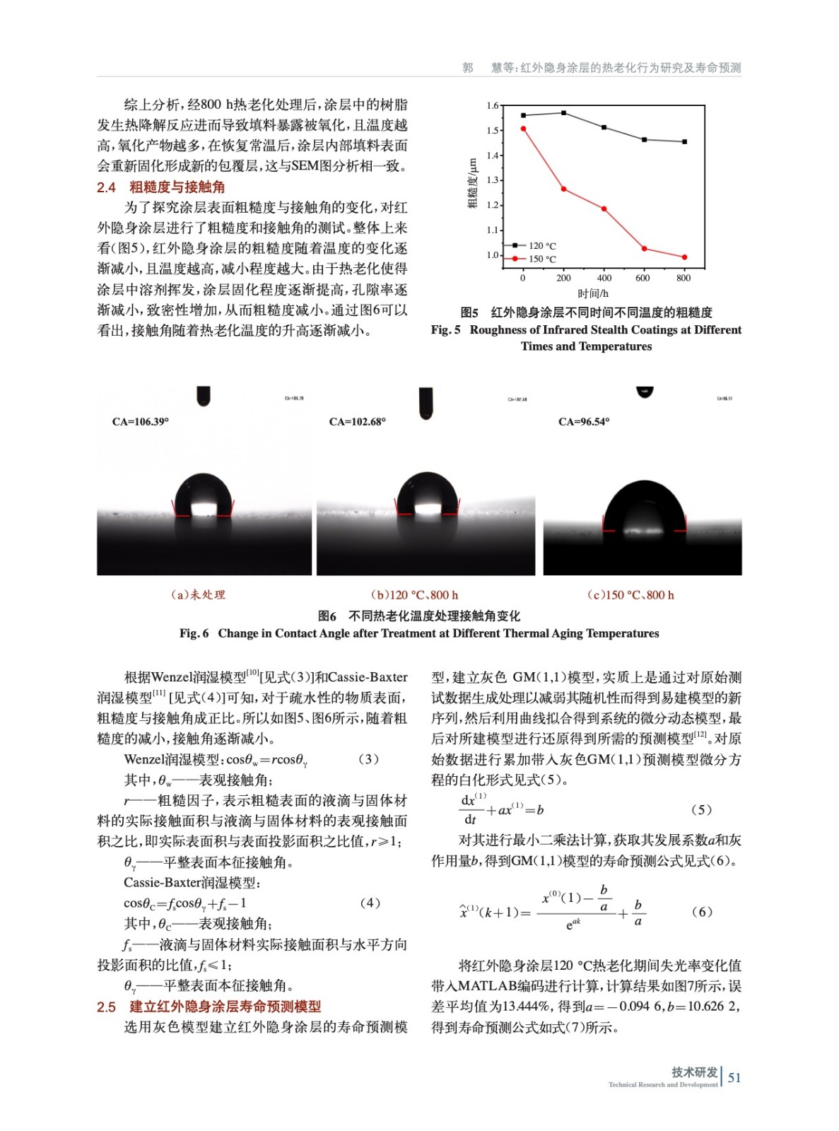 摘要:研究了熱老化對實驗室自制紅外隱身涂層性能的影響規(guī)律,建立了相應的壽命預測模型。結果表明,隨著熱老化時間的延長,涂層中鋁粉出現(xiàn)熱氧化,高分子樹脂發(fā)生熱分解;隨著熱老化溫度的上升,引起表面結構改變,導致粗糙度下降,接觸角下降。最后,根據(jù)紅外隱身涂層熱老化試驗的光澤度值,應用灰色模型實現(xiàn)對紅外隱身涂層使用壽命的準確預測,誤差平均值為13.444%。