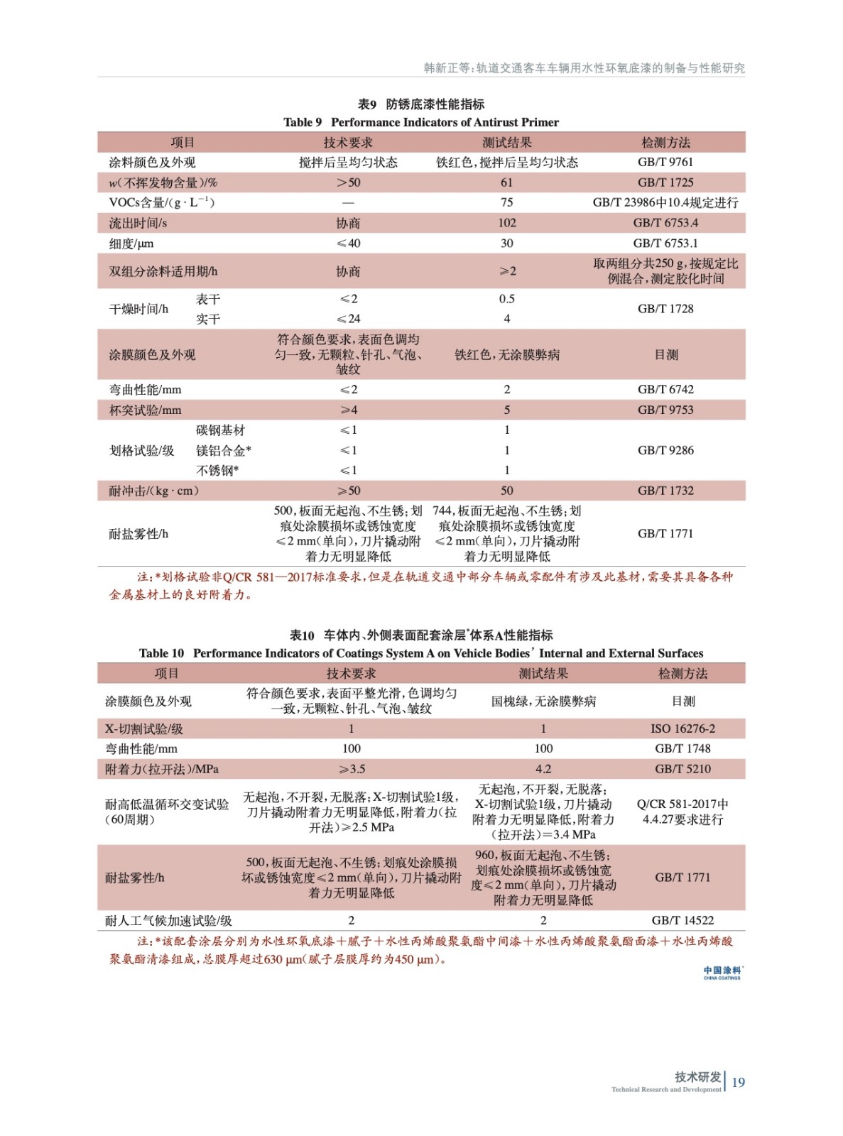 摘要:通過對樹脂、固化劑、防銹顏料和附著力促進劑的篩選,制備了應(yīng)用于軌道交通客車車輛防腐的水性環(huán)氧底漆。其性能符合Q/CR 581—2017《鐵路客車用涂料技術(shù)條件》,該底漆VOCs含量較低,耐鹽霧性佳,具備極佳的環(huán)境友好性能和防腐性能;在碳鋼、不銹鋼、鋁合金3種底材上的附著力極好;與原子灰膩子的配套性極佳,是軌道交通客車配套涂裝應(yīng)用中VOCs減排、防腐蝕的優(yōu)選產(chǎn)品。