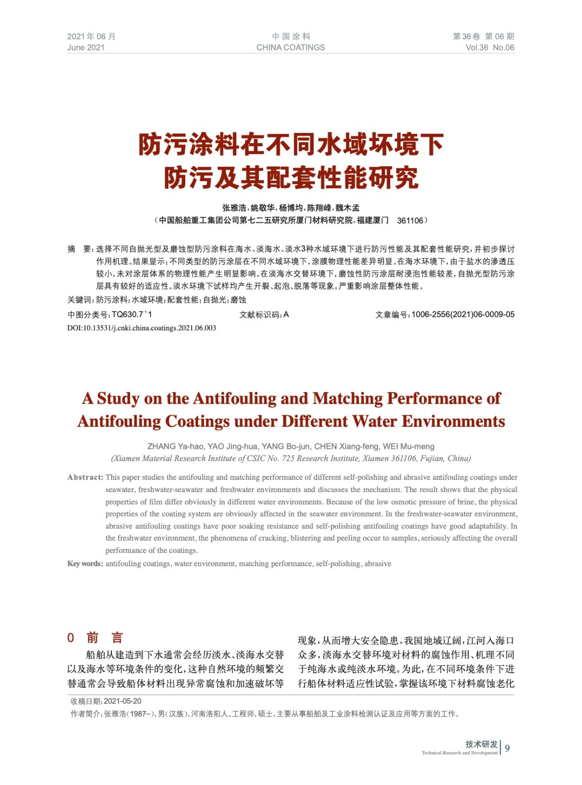 摘要:選擇不同自拋光型及磨蝕型防污涂料在海水、淡海水、淡水3種水域環(huán)境下進(jìn)行防污性能及其配套性能研究,并初步探討作用機(jī)理。結(jié)果顯示:在海水環(huán)境下,由于鹽水的滲透壓較小,未對(duì)涂層體系的物理性能產(chǎn)生明顯影響。在淡海水交替環(huán)境下,磨蝕性防污涂層耐浸泡性能較差,自拋光型防污涂層具有較好的適應(yīng)性。淡水環(huán)境下試樣均產(chǎn)生開裂、起泡、脫落等現(xiàn)象,嚴(yán)重影響涂層整體性能。