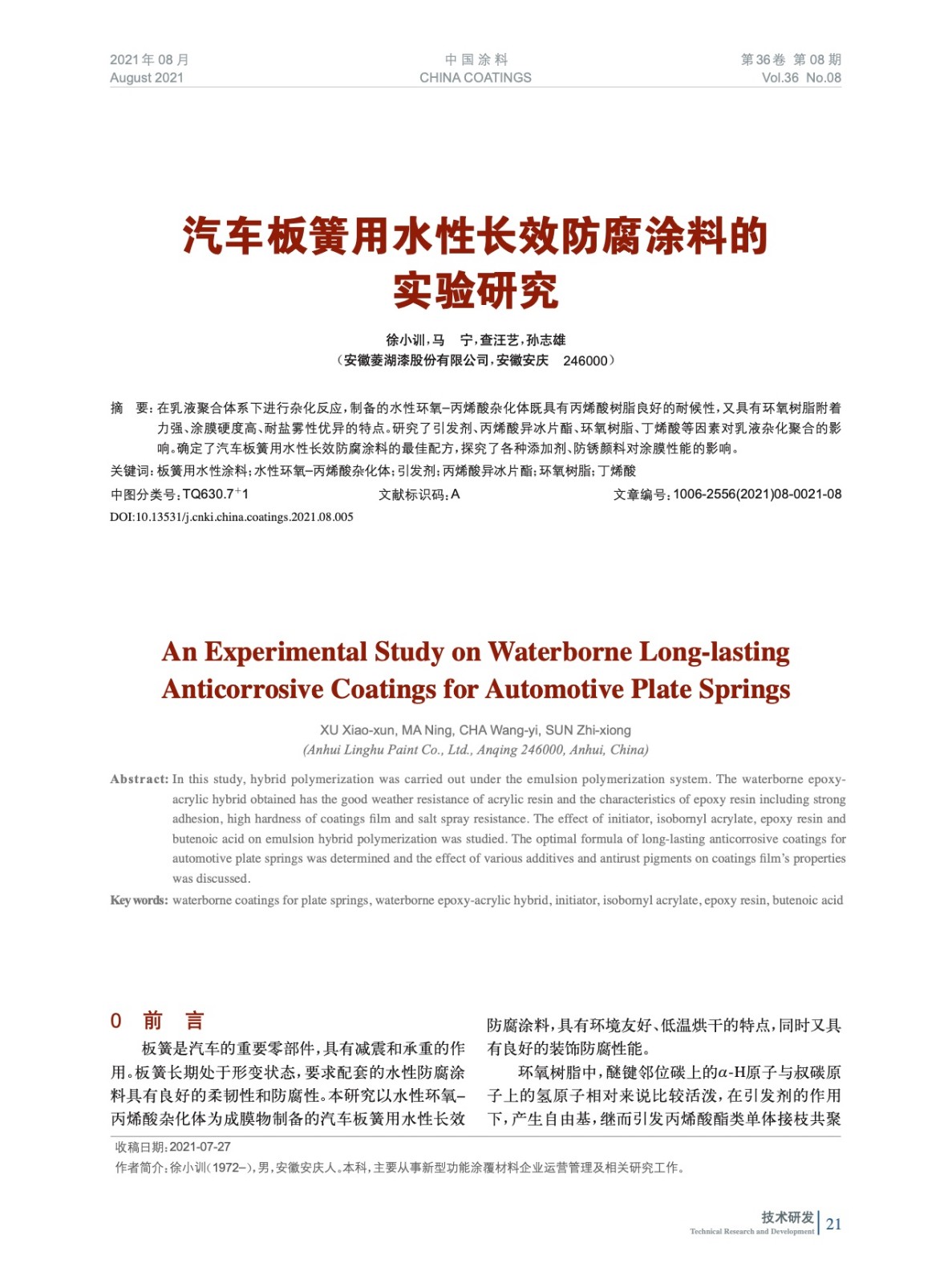 本文系作者@徐小訓,馬 寧,查汪藝,孫志雄 授權中國涂料網(wǎng)發(fā)表,并經(jīng)中國涂料網(wǎng)編輯,未經(jīng)允許不得轉(zhuǎn)載,如需轉(zhuǎn)載請聯(lián)系chinacoatingnet@vip.163.com