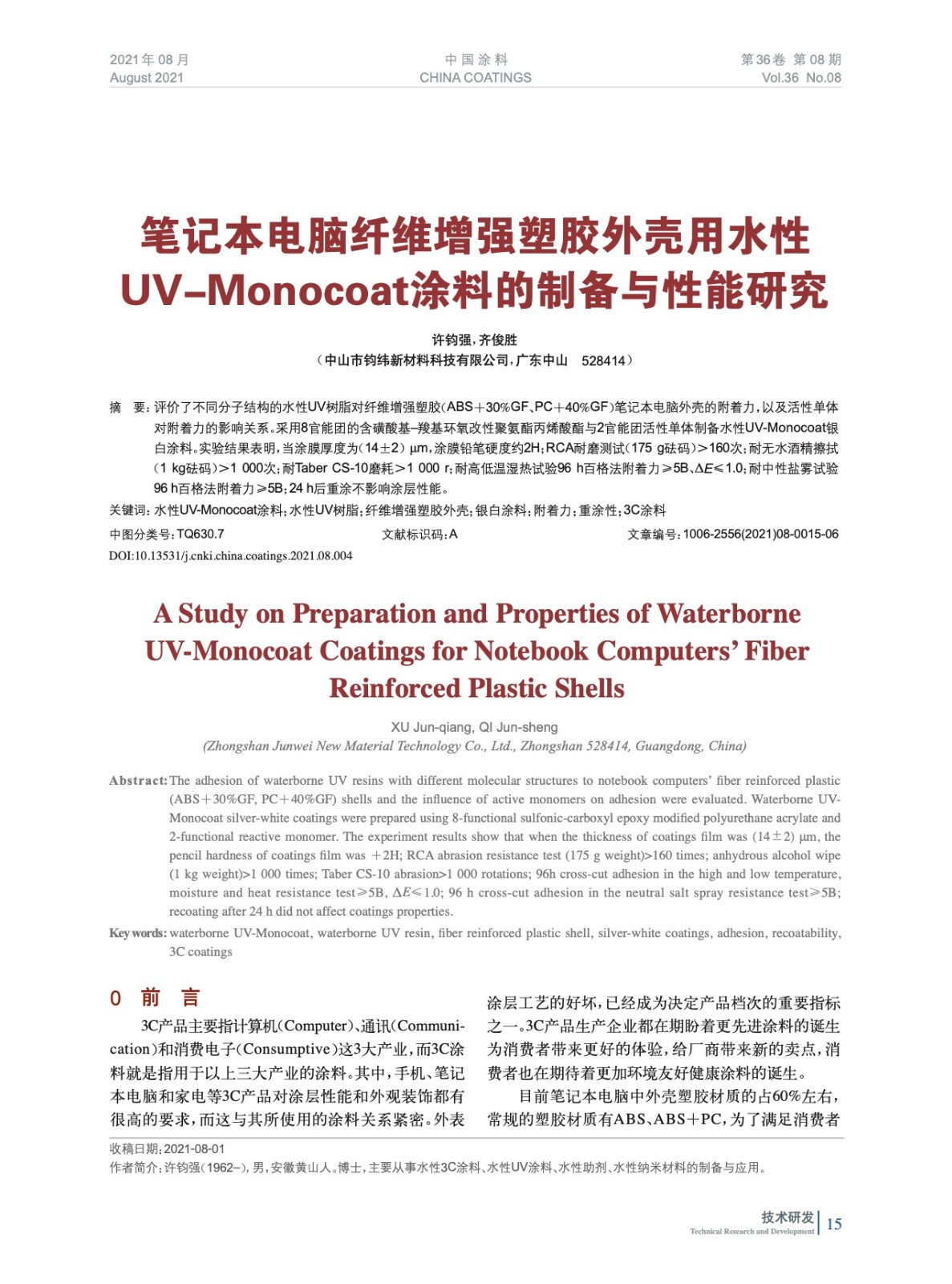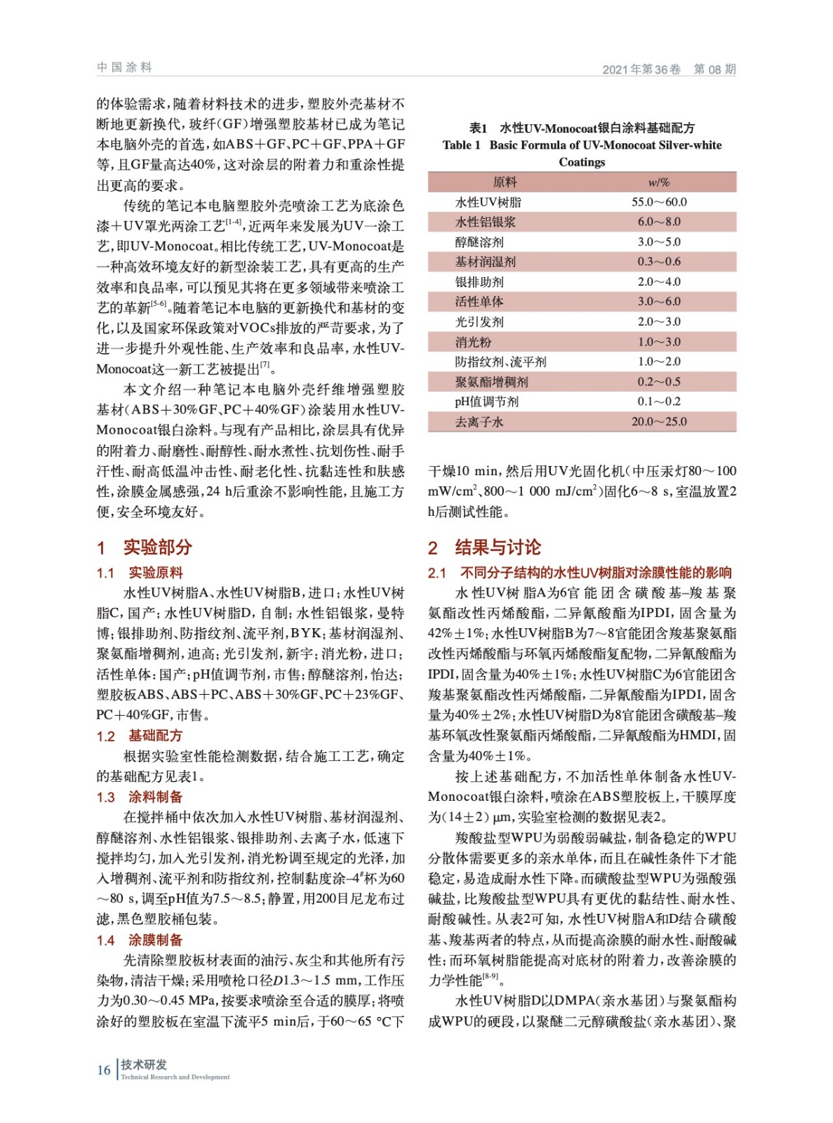 筆記本電腦纖維增強(qiáng)塑膠外殼用水性UVMonocoat涂料的制備與性能研究