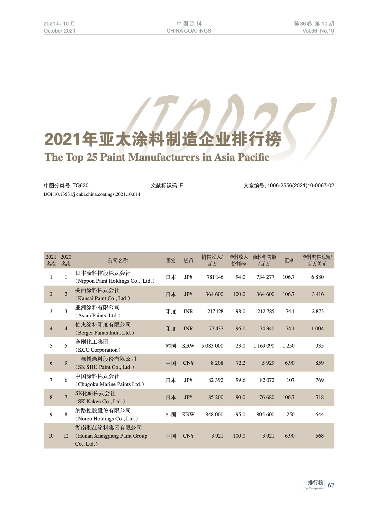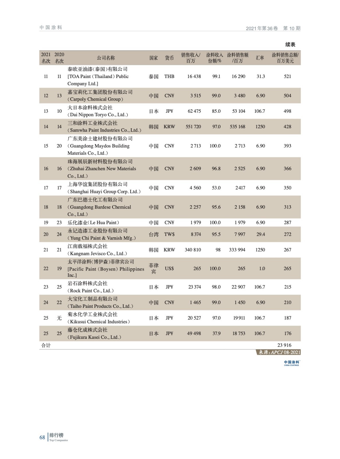 2021年亞太涂料制造企業(yè)排行榜(TOP25)