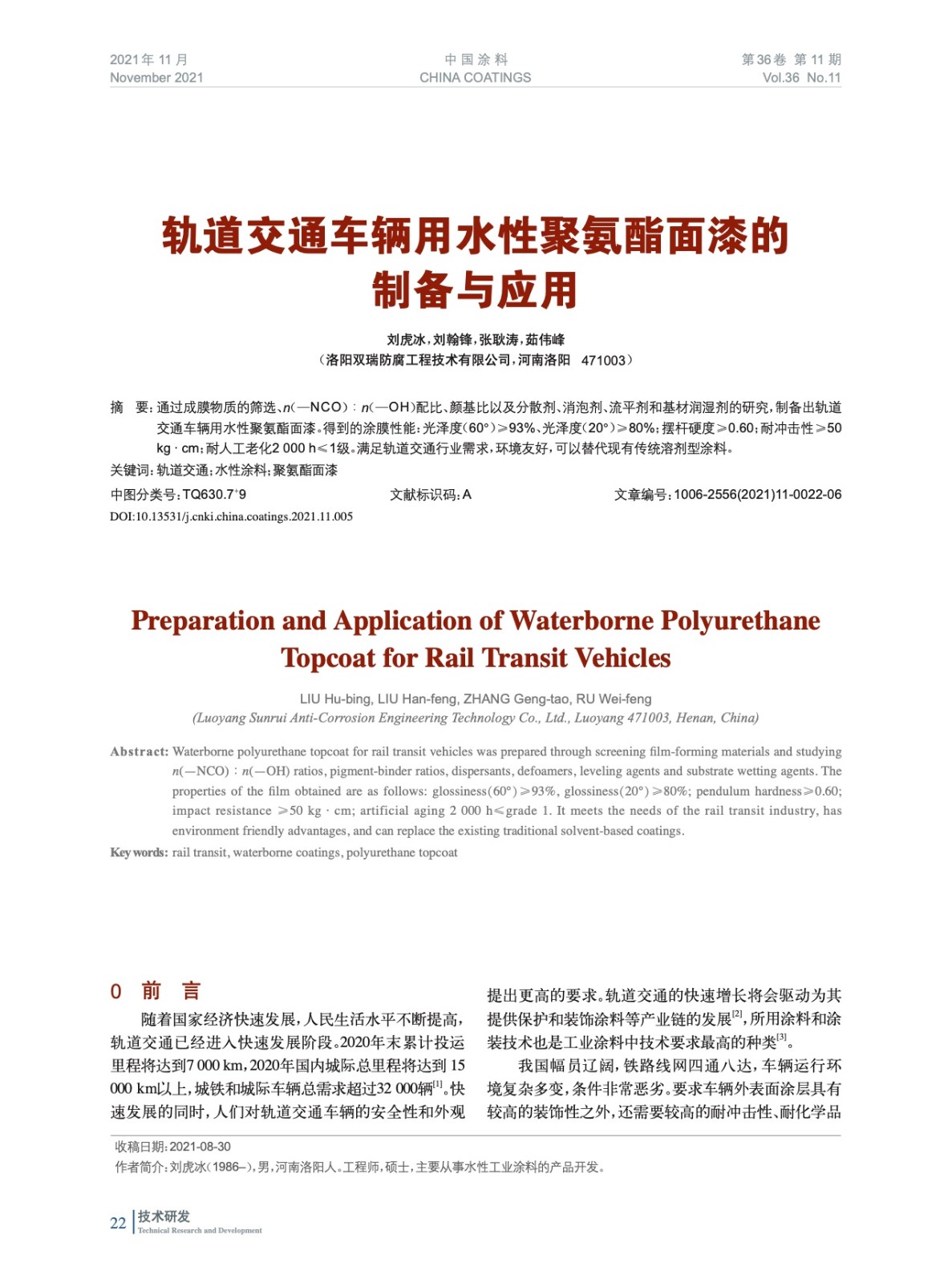 摘要:通過成膜物質的篩選、n(—NCO)︰n(—OH)配比、顏基比以及分散劑、消泡劑、流平劑和基材潤濕劑的研究,制備出軌道交通車輛用水性聚氨酯面漆。得到的涂膜性能:光澤度(60°)≥93%、光澤度(20°)≥80%;擺桿硬度≥0.60;耐沖擊性≥50 kg·cm;耐人工老化2 000 h≤1級。滿足軌道交通行業(yè)需求,環(huán)境友好,可以替代現(xiàn)有傳統(tǒng)溶劑型涂料。