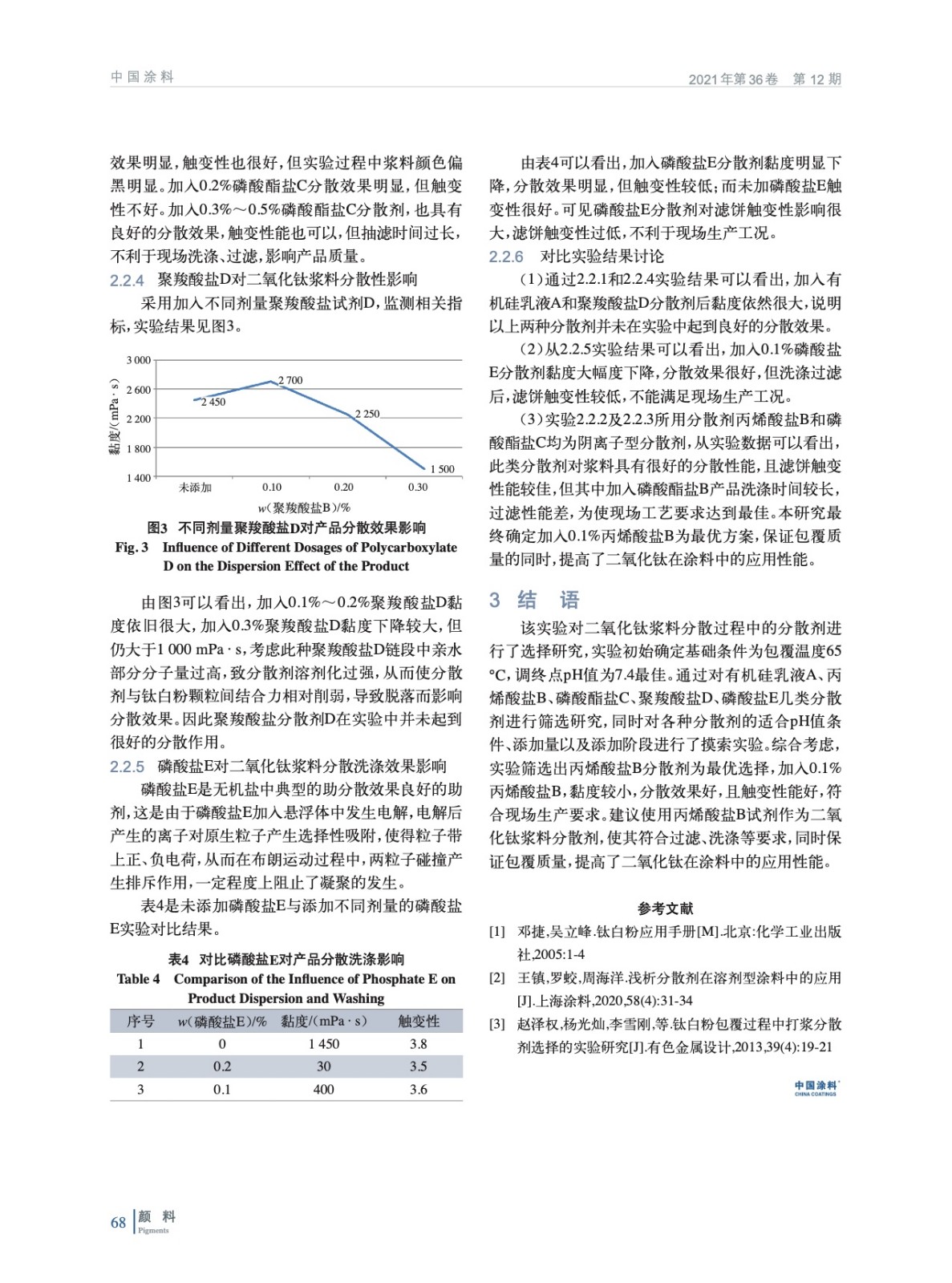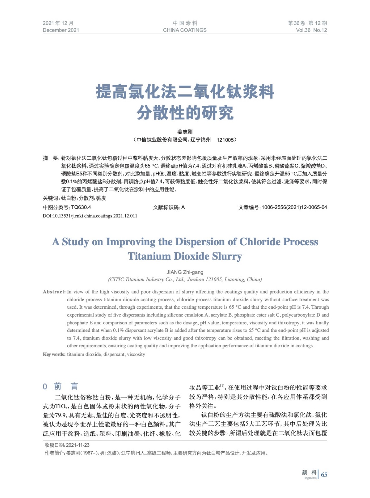 摘要:采用未經(jīng)表面處理的氯化法二氧化鈦漿料,通過實(shí)驗(yàn)確定包覆溫度為65 ℃,調(diào)終點(diǎn)pH值為7.4,通過對5種不同類別分散劑,對比添加量、pH值、溫度、黏度、觸變性等參數(shù)進(jìn)行實(shí)驗(yàn)研究,最終確定升溫65 ℃后加入質(zhì)量分?jǐn)?shù)0.1%的丙烯酸鹽B分散劑,再調(diào)終點(diǎn)pH值7.4,可獲得黏度低、觸變性好二氧化鈦漿料,使其符合過濾、洗滌等要求,同時(shí)保證了包覆質(zhì)量,提高了二氧化鈦在涂料中的應(yīng)用性能。