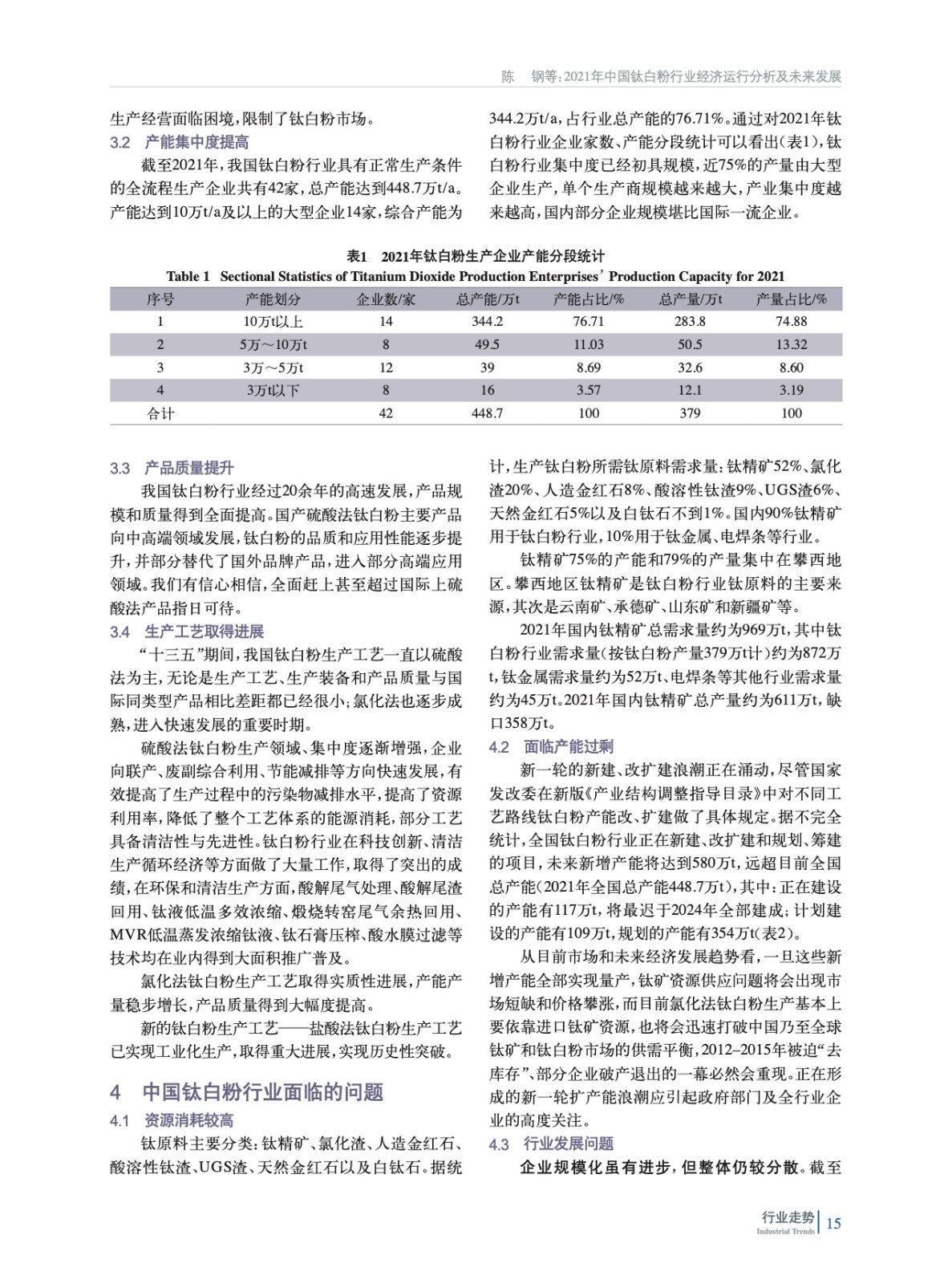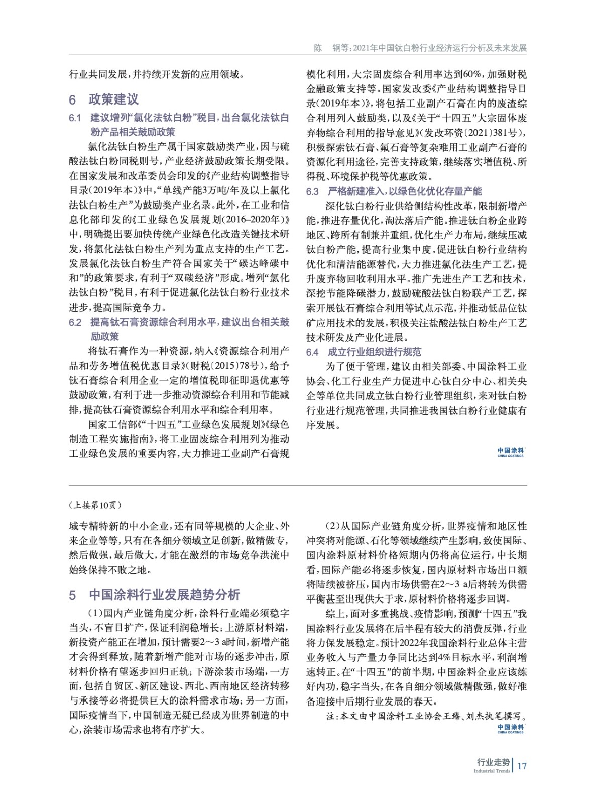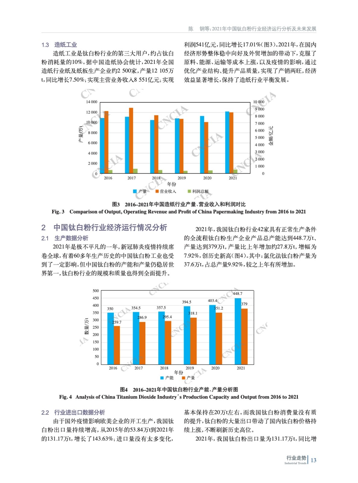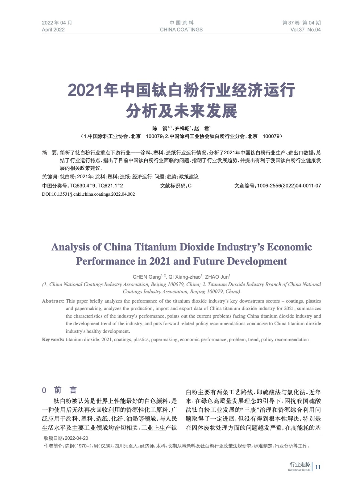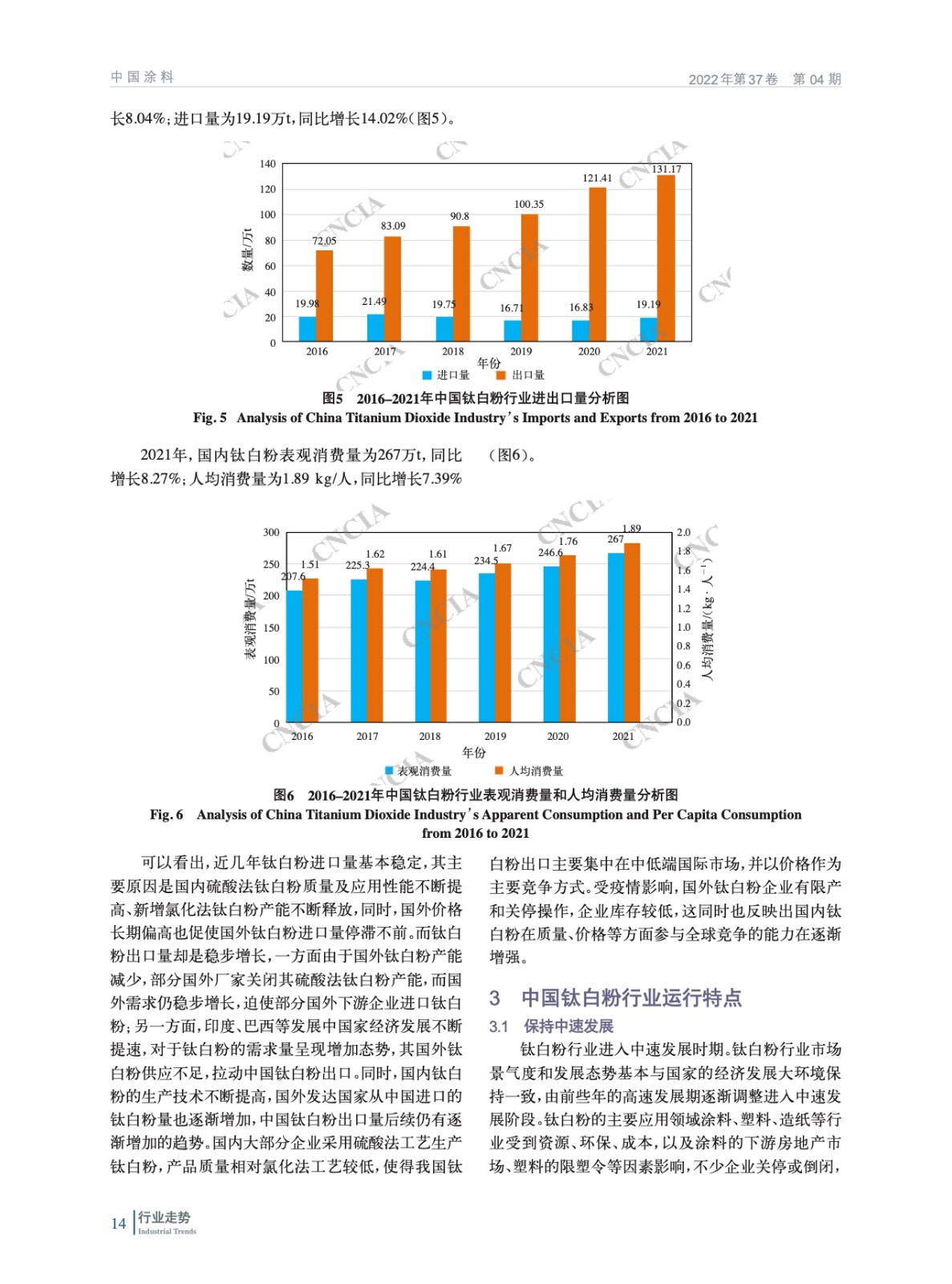 摘要:簡析了鈦白粉行業(yè)重點下游行業(yè)——涂料、塑料、造紙行業(yè)運行情況,分析了2021年中國鈦白粉行業(yè)生產(chǎn)、進(jìn)出口數(shù)據(jù),總結(jié)了行業(yè)運行特點,指出了目前中國鈦白粉行業(yè)面臨的問題,指明了行業(yè)發(fā)展趨勢,并提出有利于我國鈦白粉行業(yè)健康發(fā)展的相關(guān)政策建議。