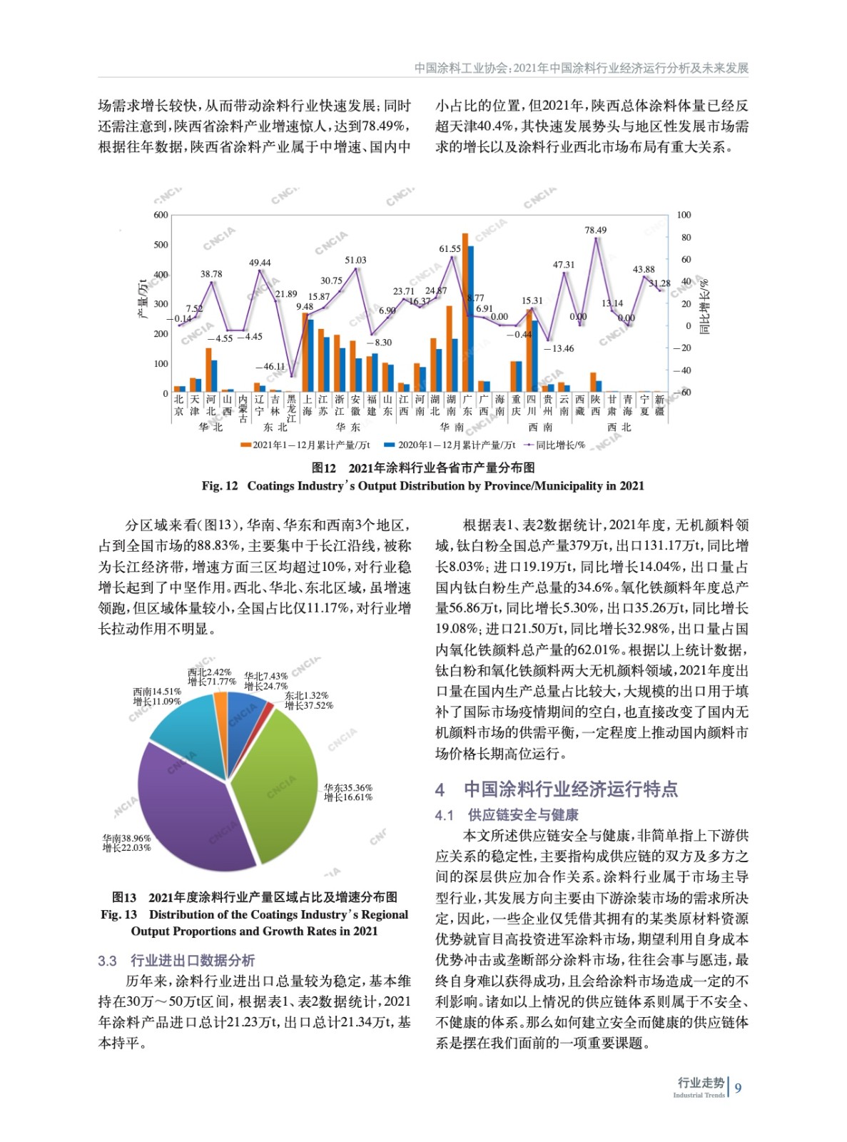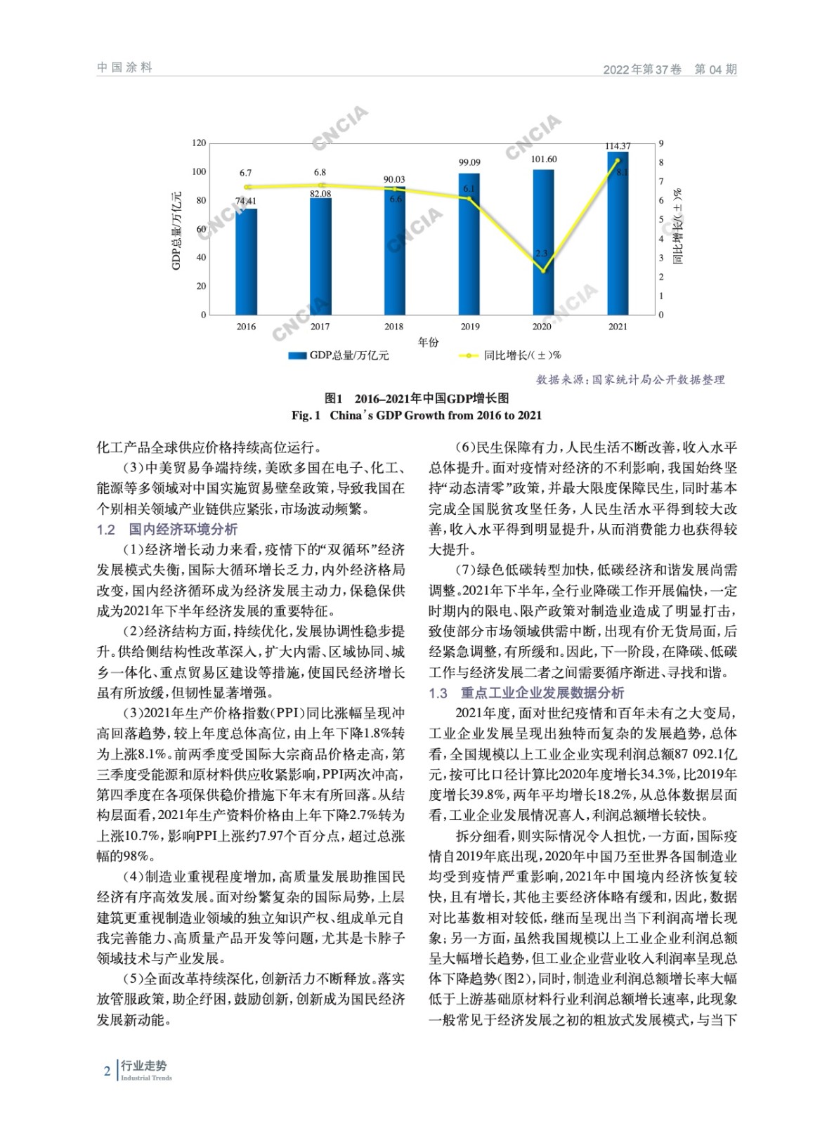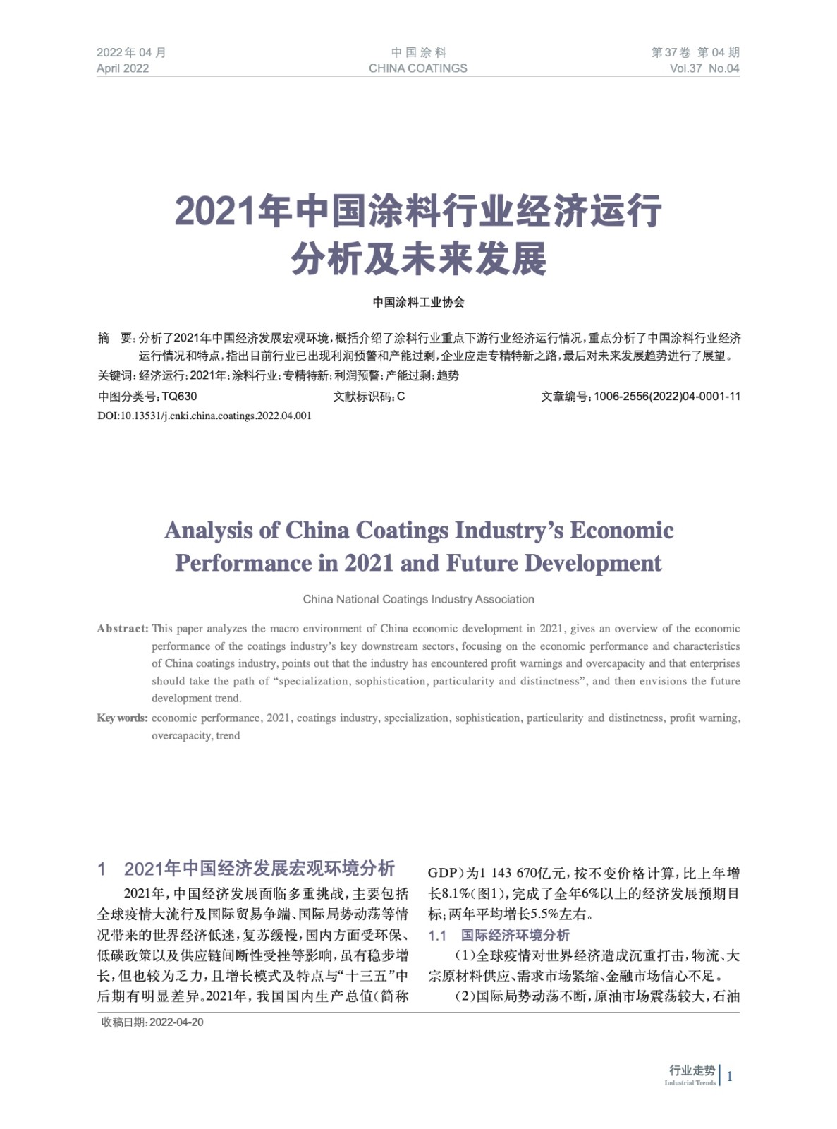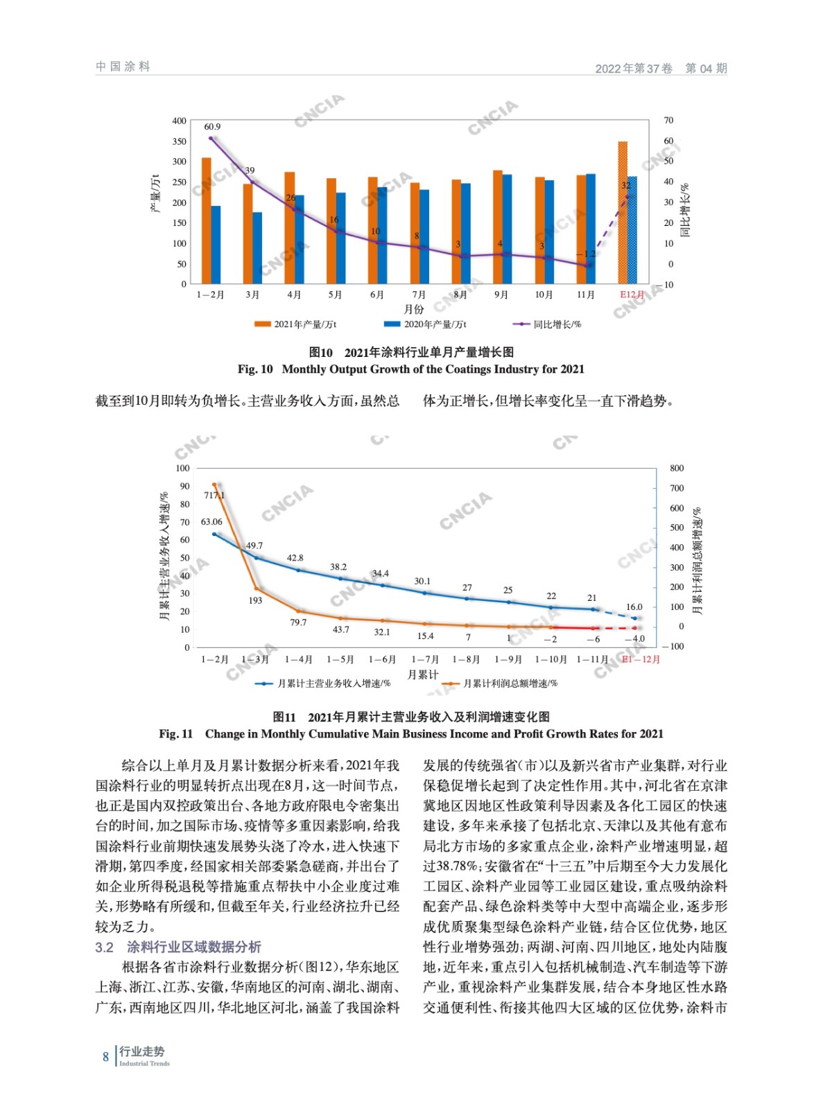摘要:分析了2021年中國經(jīng)濟發(fā)展宏觀環(huán)境,概括介紹了涂料行業(yè)重點下游行業(yè)經(jīng)濟運行情況,重點分析了中國涂料行業(yè)經(jīng)濟運行情況和特點,指出目前行業(yè)已出現(xiàn)利潤預(yù)警和產(chǎn)能過剩,企業(yè)應(yīng)走專精特新之路,最后對未來發(fā)展趨勢進行了展望。