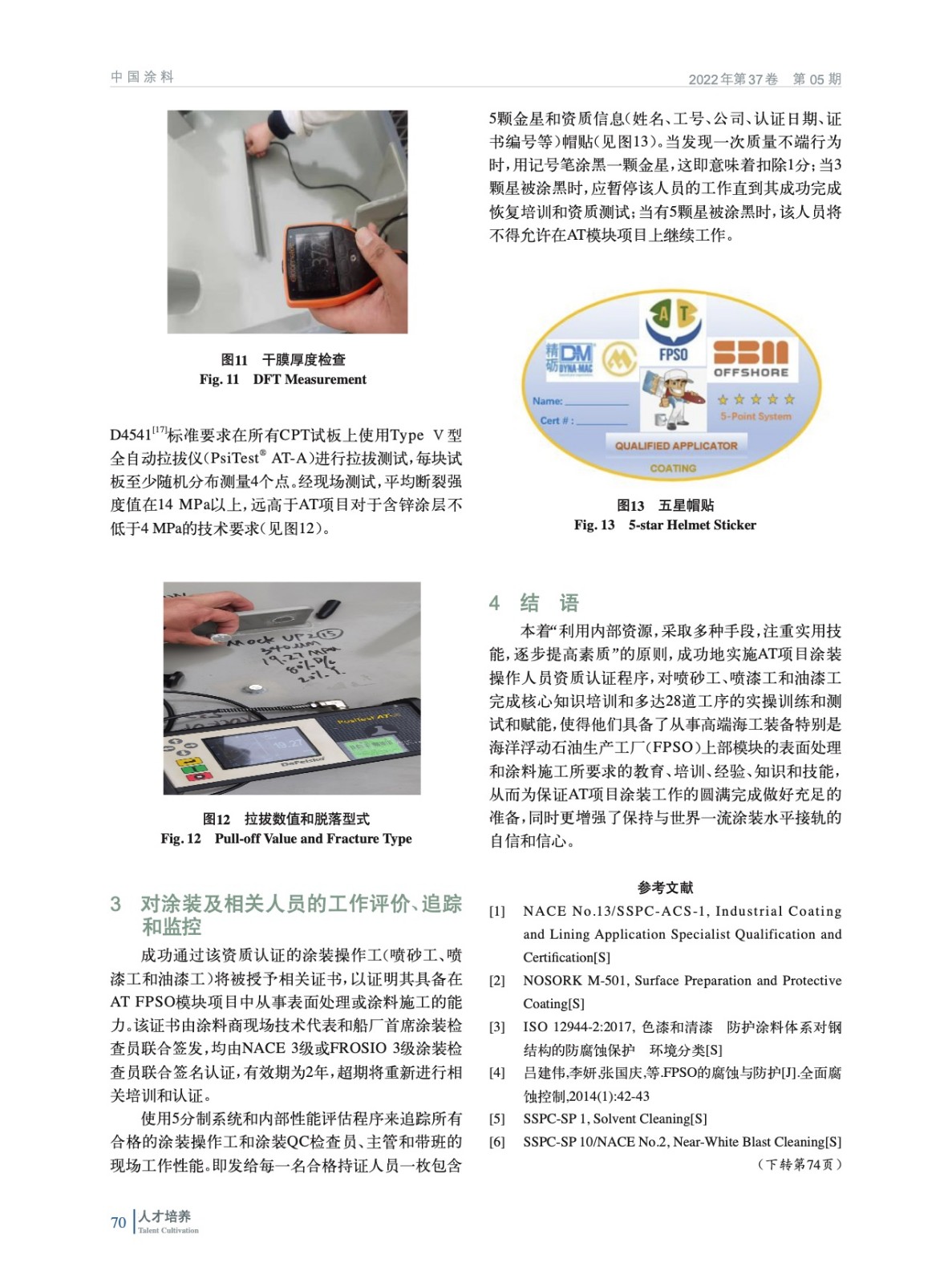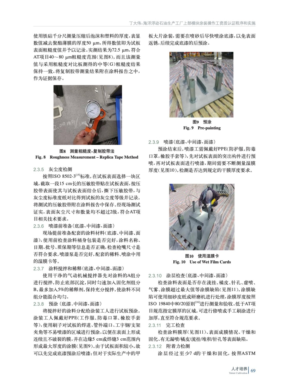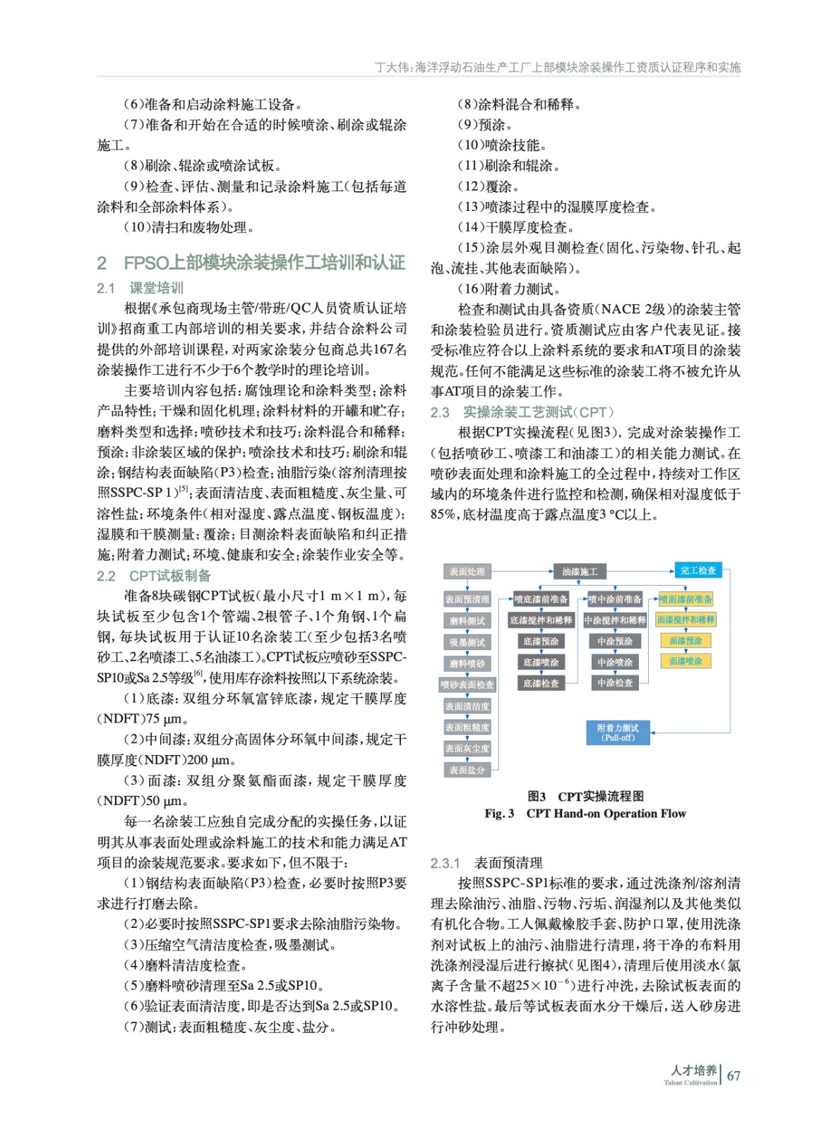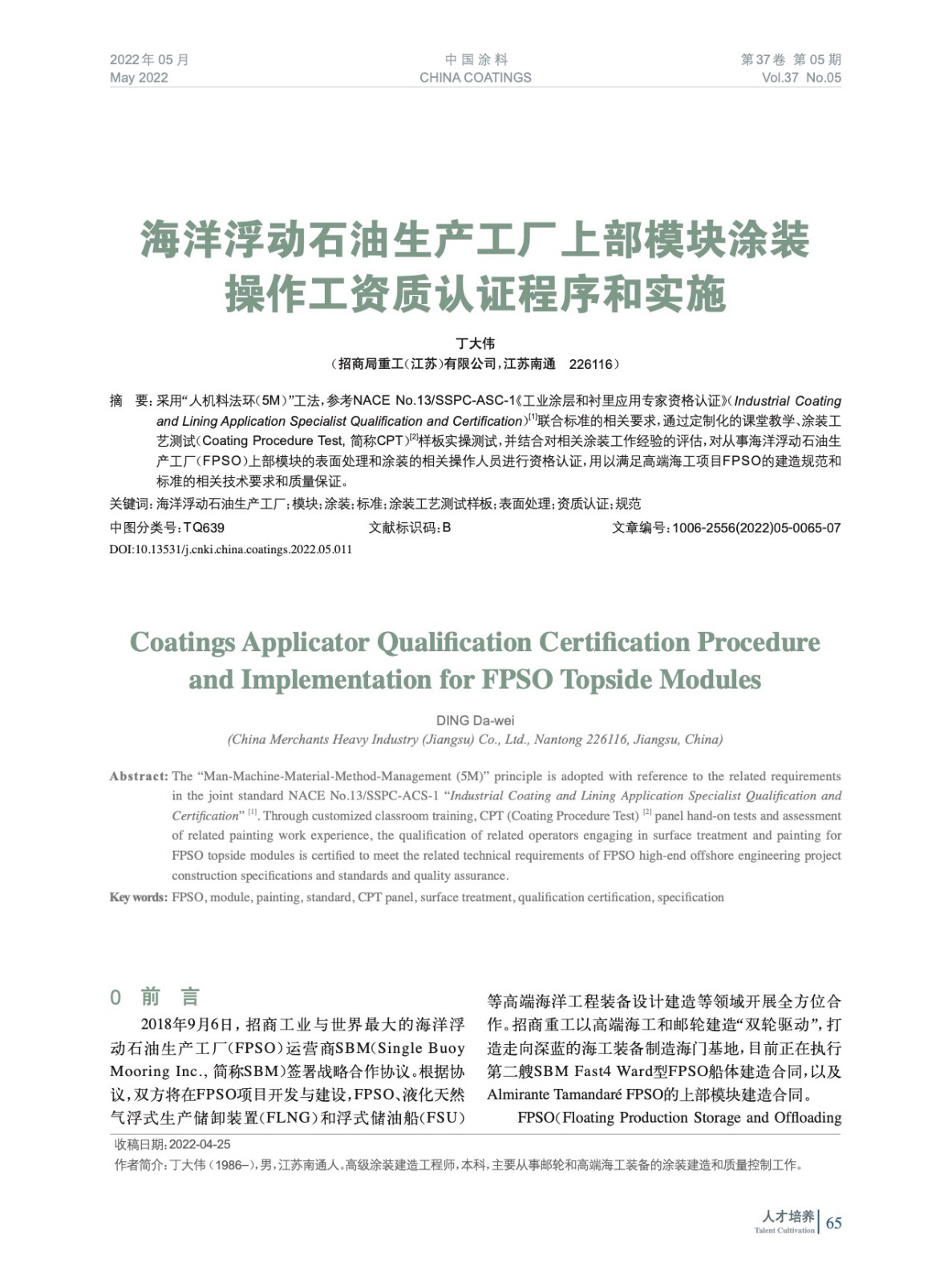 摘要:采用“人機料法環(huán)(5M)”工法,參考NACE No.13/SSPC-ASC-1《工業(yè)涂層和襯里應(yīng)用專家資格認證》聯(lián)合標準的相關(guān)要求,通過定制化的課堂教學(xué)、涂裝工藝測試樣板實操測試,并結(jié)合對相關(guān)涂裝工作經(jīng)驗的評估,對從事海洋浮動石油生產(chǎn)工廠(FPSO)上部模塊的表面處理和涂裝的相關(guān)操作人員進行資格認證,用以滿足高端海工項目FPSO的建造規(guī)范和標準的相關(guān)技術(shù)要求和質(zhì)量保證。