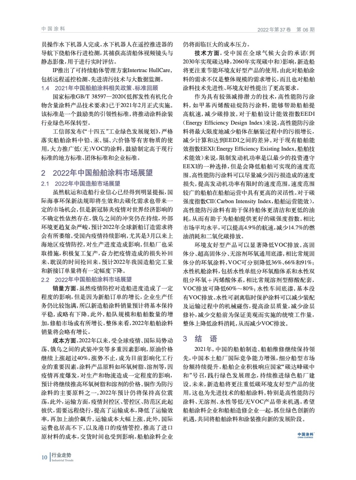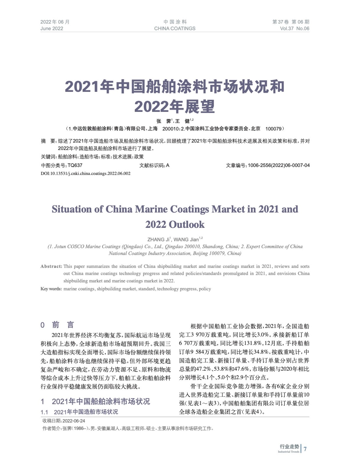 摘要:綜述了2021年中國造船市場及船舶涂料市場狀況,回顧梳理了2021年中國船舶涂料技術(shù)進展及相關(guān)政策和標準,并對2022年中國造船及船舶涂料市場進行了展望。