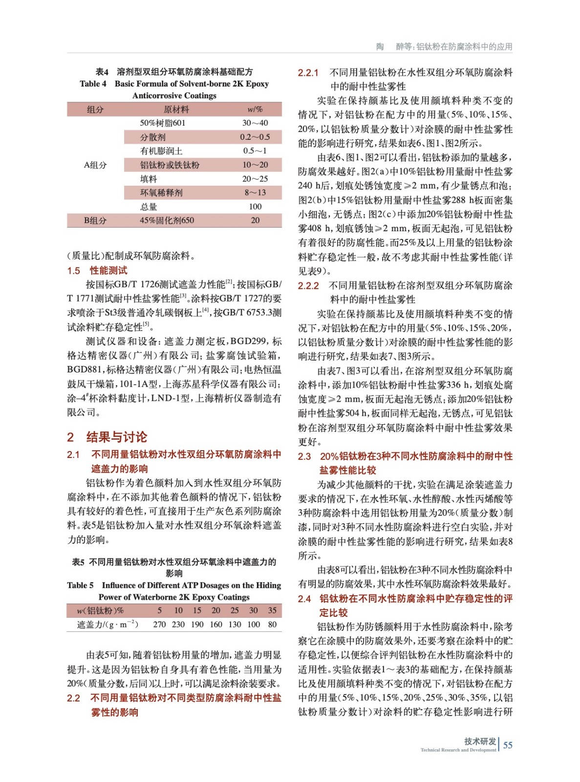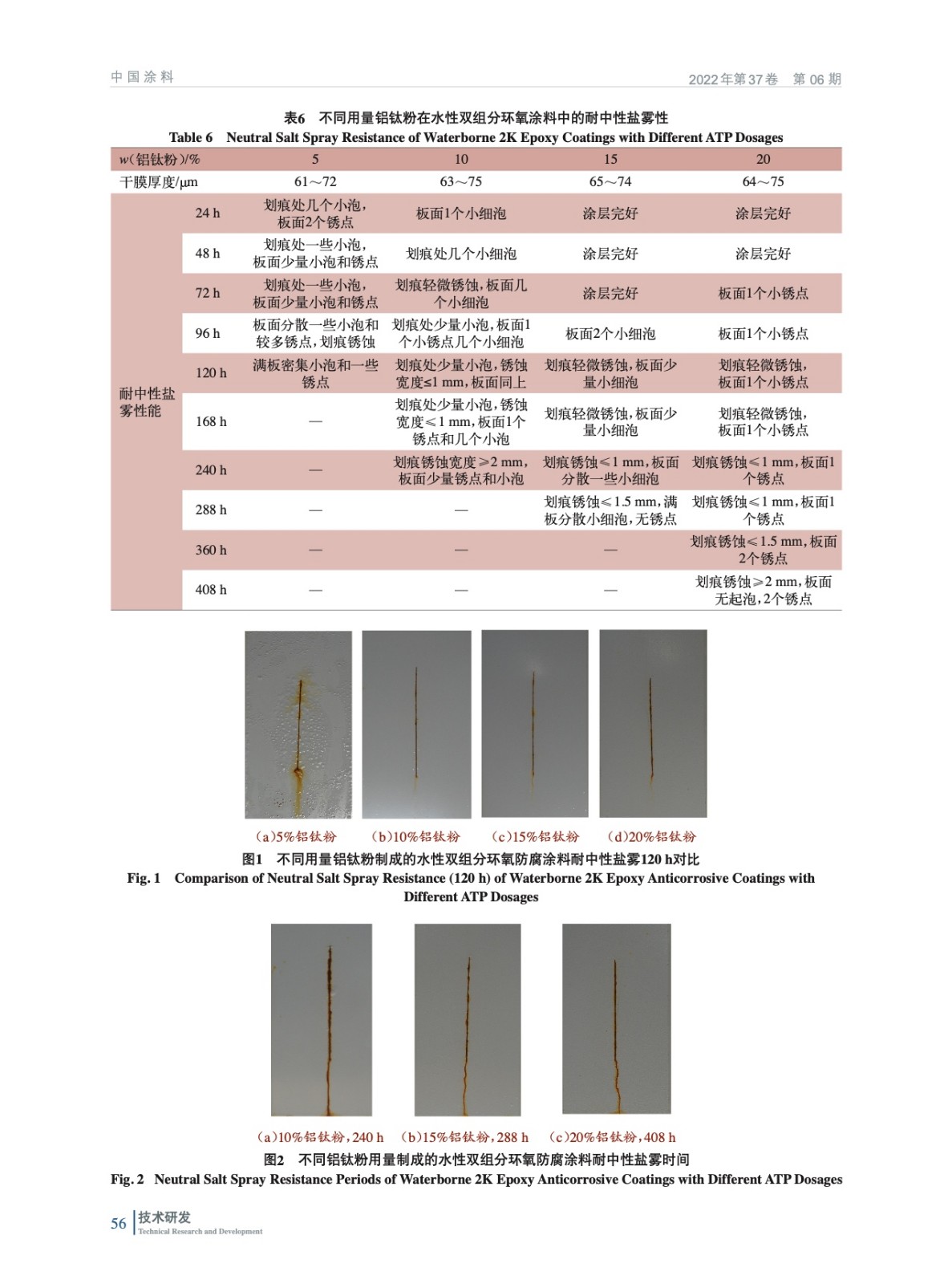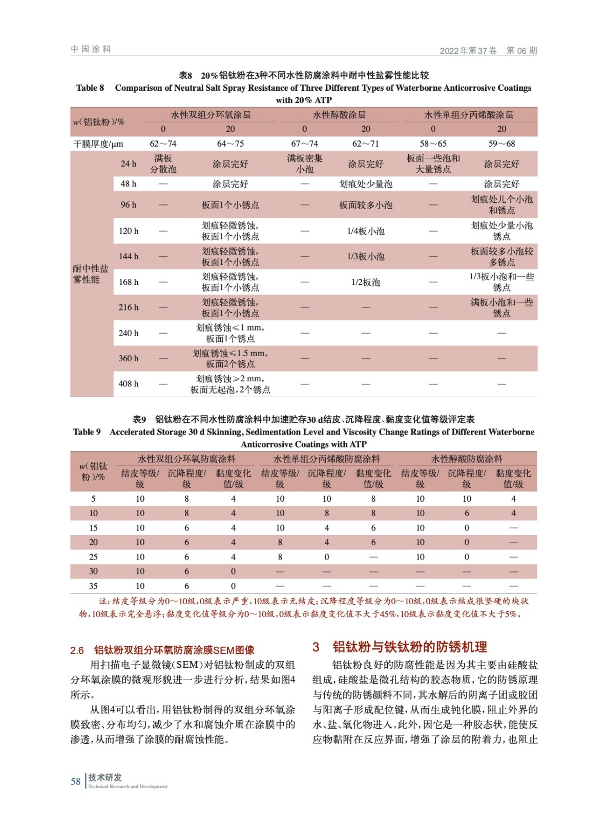 摘要:通過對(duì)鋁鈦粉在各類防腐涂料中的應(yīng)用實(shí)驗(yàn),結(jié)果表明鋁鈦粉具有良好的防腐性能,其用量在20%時(shí),涂料綜合性能良好,水性雙組分環(huán)氧防腐涂料可耐中性鹽霧408 h,水性醇酸防腐涂料可耐中性鹽霧168 h,水性單組分丙烯酸防腐涂料中達(dá)216 h,溶劑型雙組分環(huán)氧防腐涂料中達(dá)500 h。且通過鋁鈦粉和鐵鈦粉的雙組分環(huán)氧防腐涂料耐中性鹽霧性能對(duì)比實(shí)驗(yàn),結(jié)果表明鋁鈦粉的防腐性更優(yōu)。