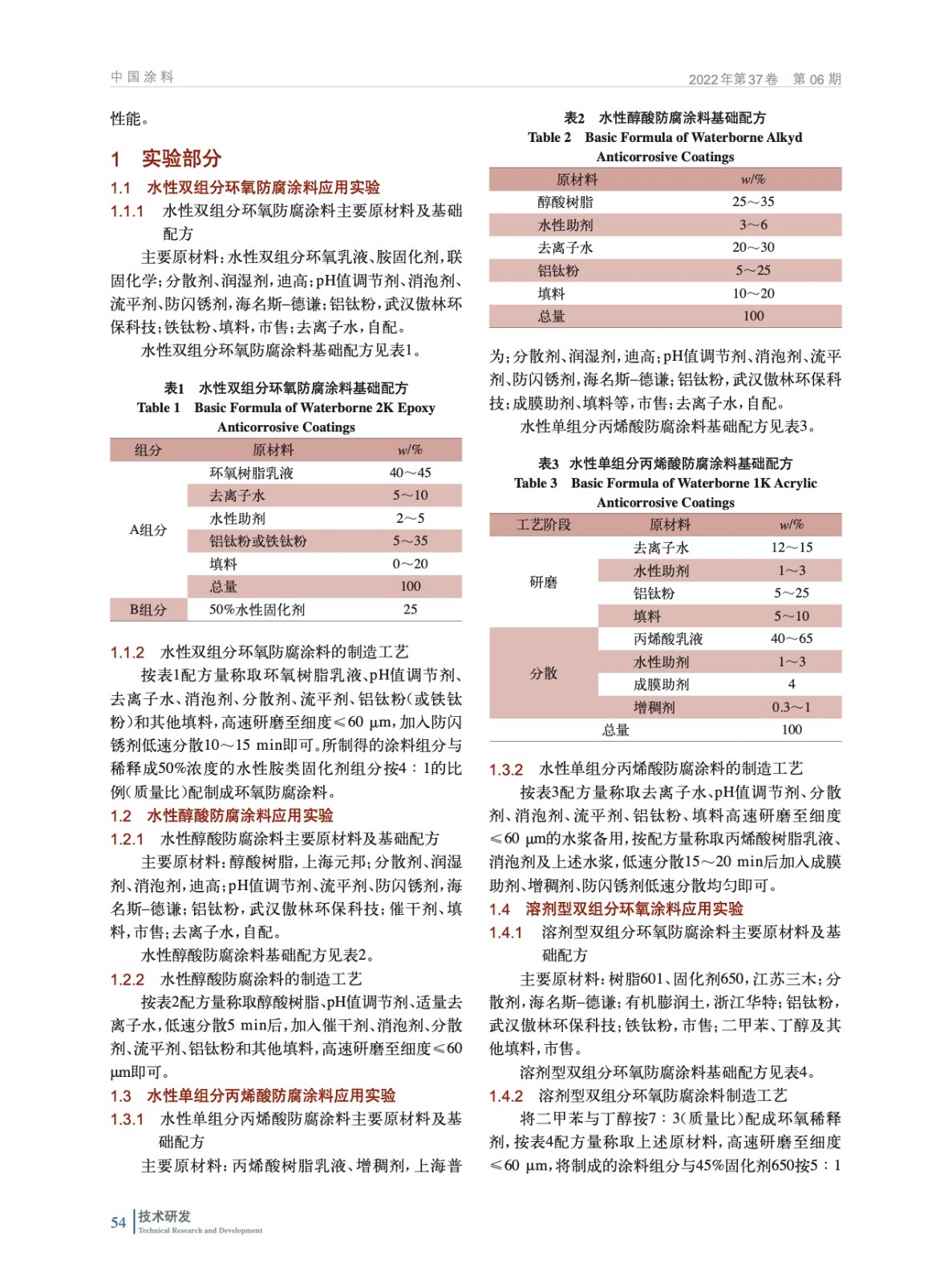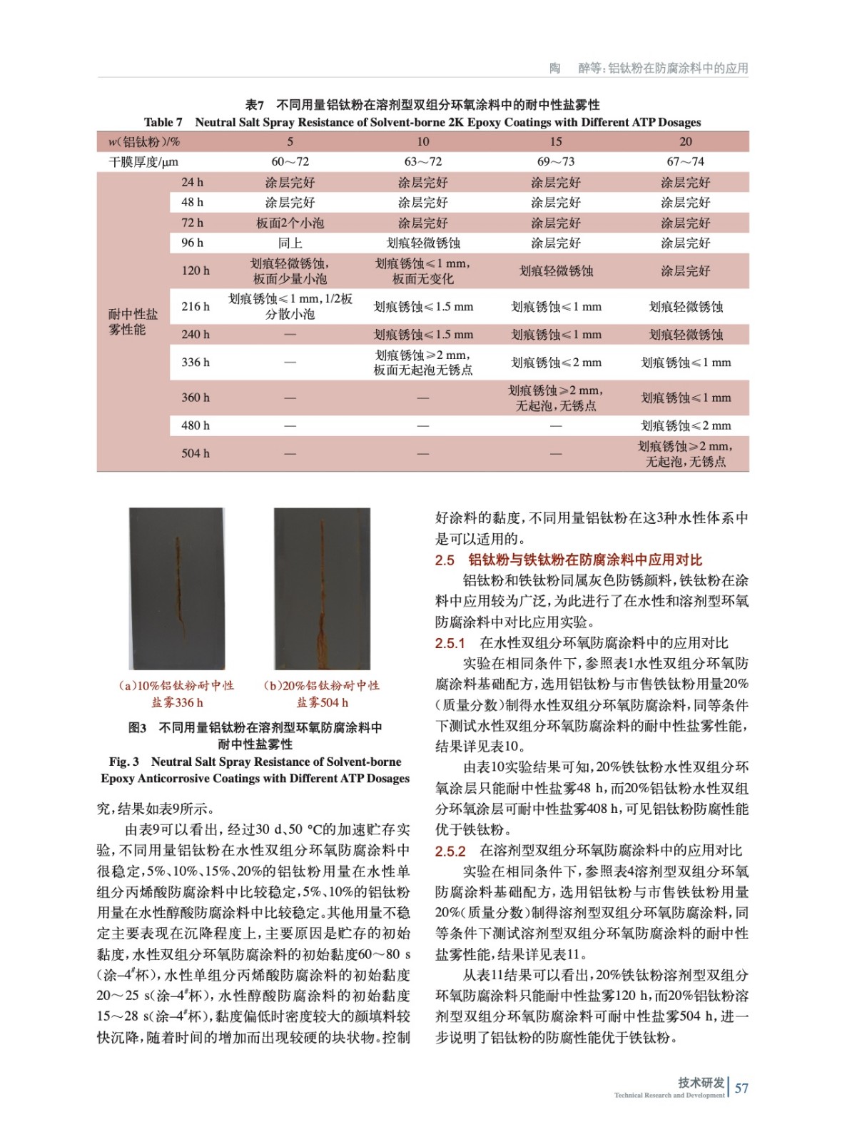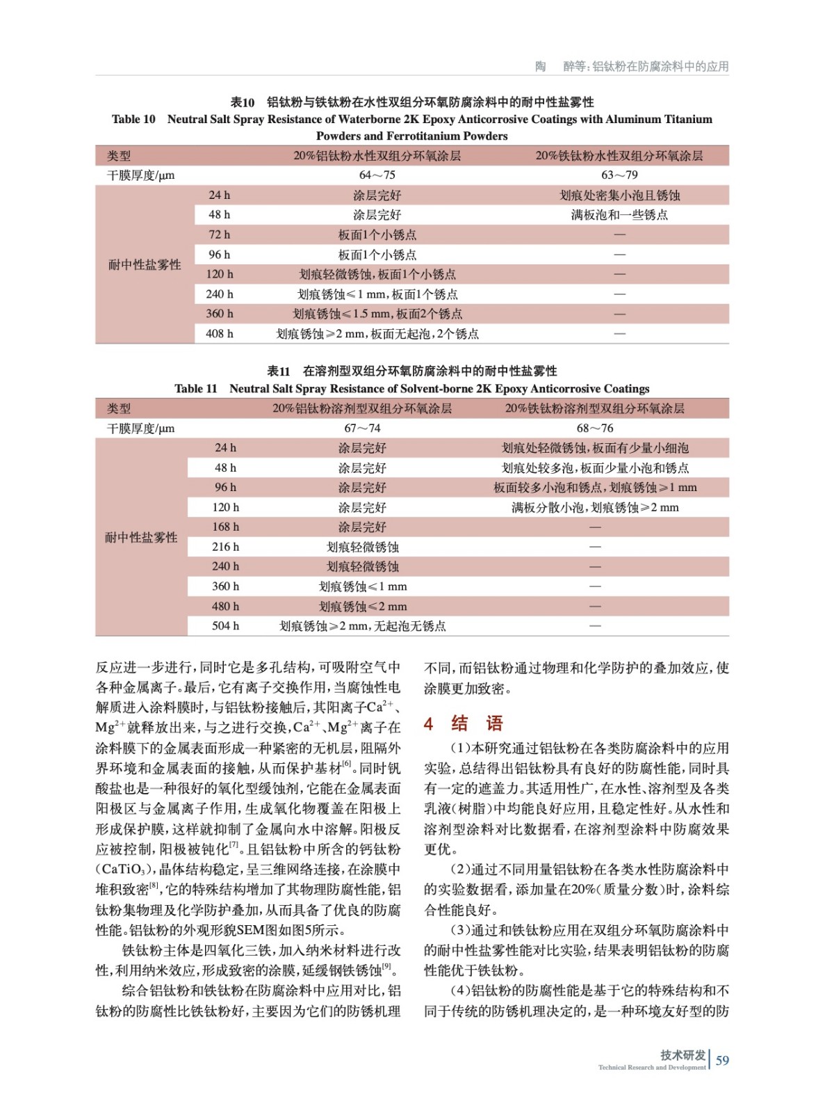 摘要:通過對(duì)鋁鈦粉在各類防腐涂料中的應(yīng)用實(shí)驗(yàn),結(jié)果表明鋁鈦粉具有良好的防腐性能,其用量在20%時(shí),涂料綜合性能良好,水性雙組分環(huán)氧防腐涂料可耐中性鹽霧408 h,水性醇酸防腐涂料可耐中性鹽霧168 h,水性單組分丙烯酸防腐涂料中達(dá)216 h,溶劑型雙組分環(huán)氧防腐涂料中達(dá)500 h。且通過鋁鈦粉和鐵鈦粉的雙組分環(huán)氧防腐涂料耐中性鹽霧性能對(duì)比實(shí)驗(yàn),結(jié)果表明鋁鈦粉的防腐性更優(yōu)。