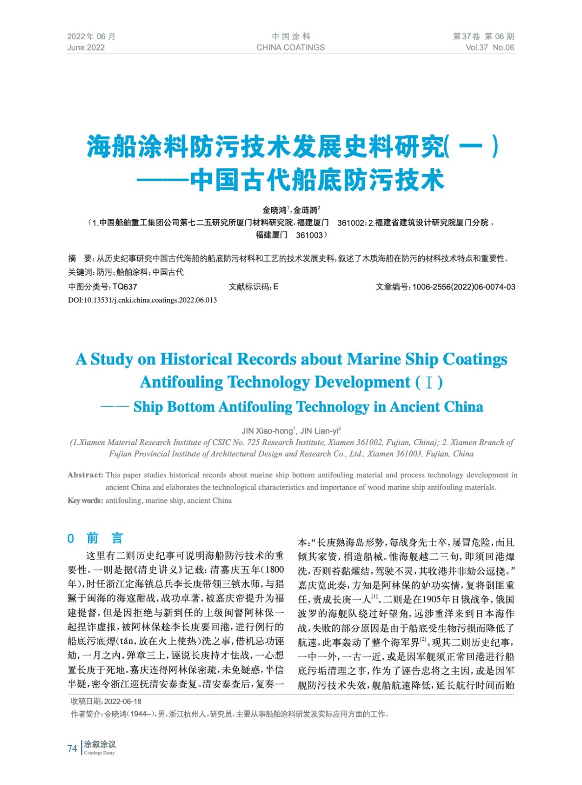 從歷史紀事研究中國古代海船的船底防污材料和工藝的技術發(fā)展史料,敘述了木質海船在防污的材料技術特點和重要性。