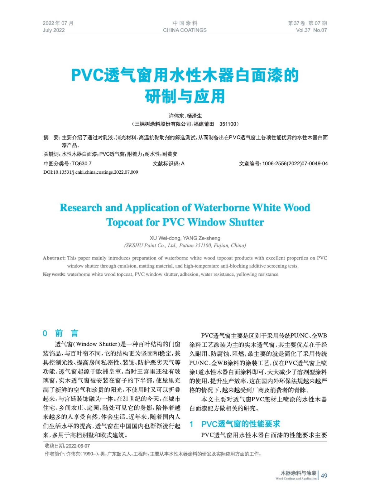 PVC透氣窗用水性木器白面漆的研制與應(yīng)用