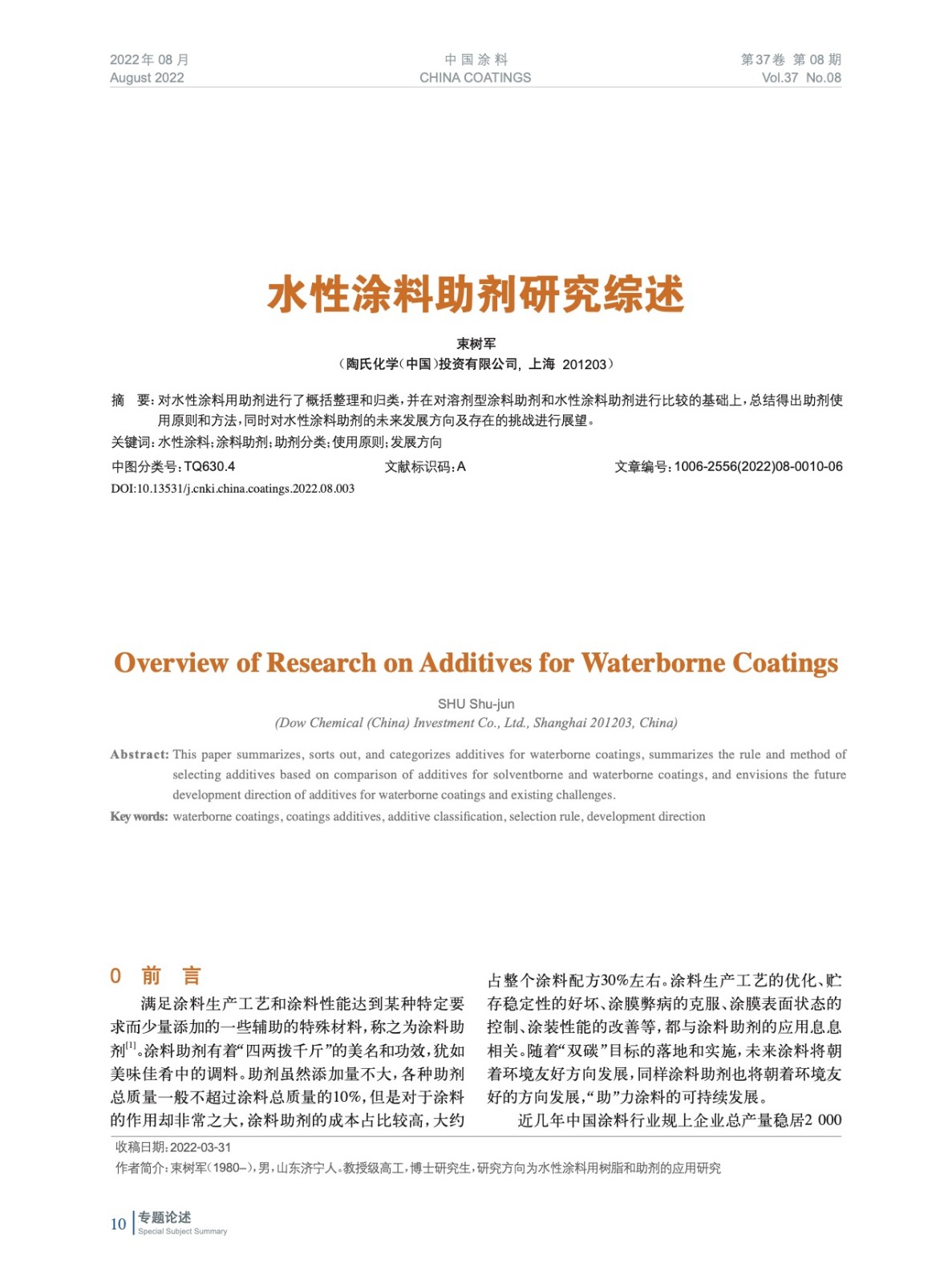 摘要:對(duì)水性涂料用助劑進(jìn)行了概括整理和歸類(lèi),并在對(duì)溶劑型涂料助劑和水性涂料助劑進(jìn)行比較的基礎(chǔ)上,總結(jié)得出助劑使用原則和方法,同時(shí)對(duì)水性涂料助劑的未來(lái)發(fā)展方向及存在的挑戰(zhàn)進(jìn)行展望。