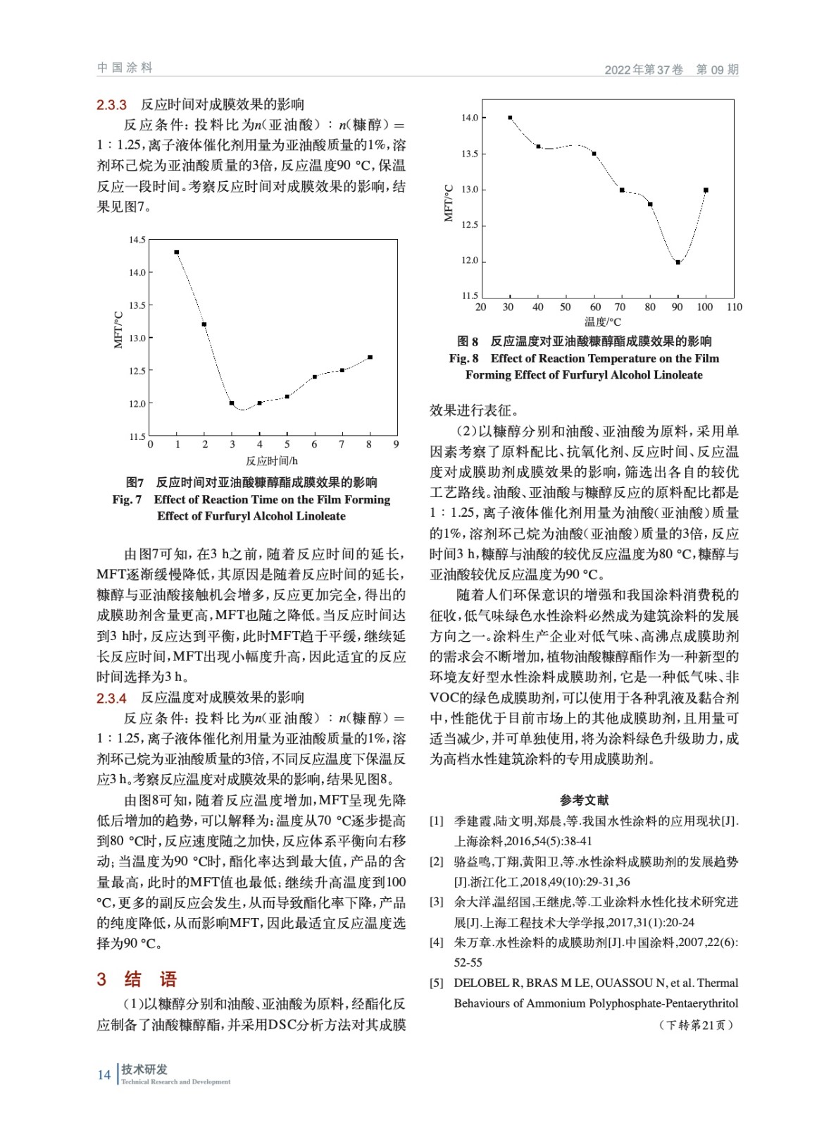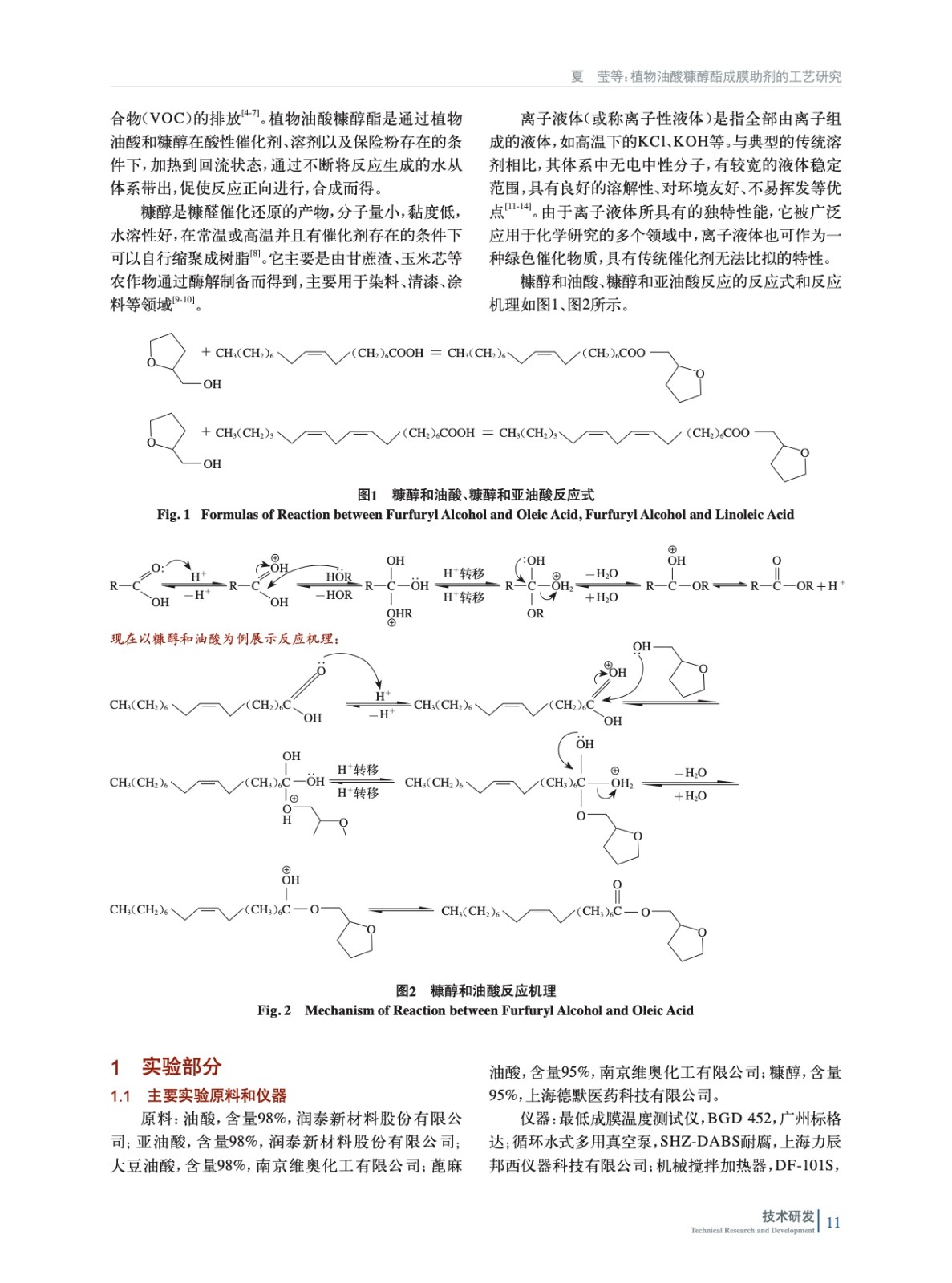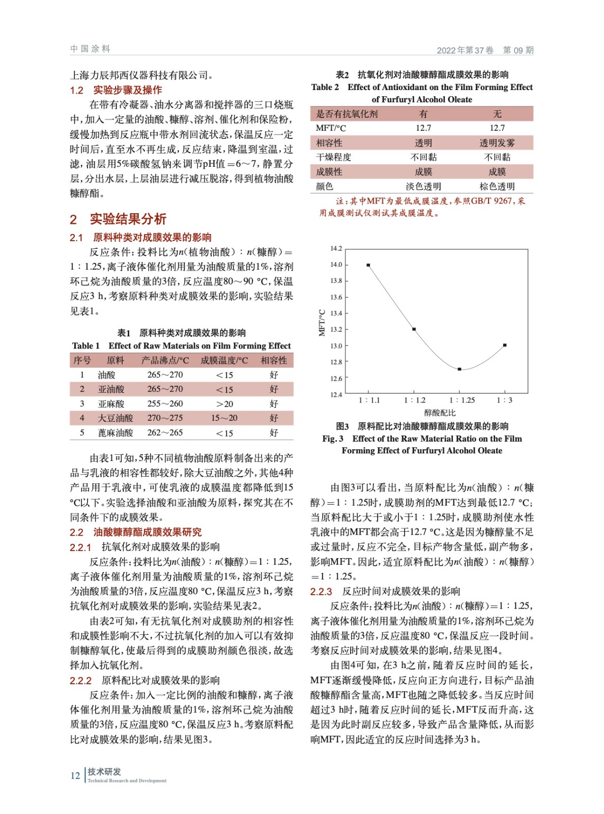 摘要:以糠醇和亞油酸、糠醇和油酸為原料,在催化劑、帶水劑存在的條件下加熱到一定溫度進(jìn)行酯化反應(yīng),合成得到的是一種環(huán)境友好型水性涂料成膜助劑??疾炝朔磻?yīng)溫度、反應(yīng)時(shí)間、原料配比、催化劑用量、原料種類對(duì)成膜助劑在水性乳液中成膜效果的影響。結(jié)果表明,與其他植物油酸相比,以亞油酸和油酸為原料制備的糠醇酯具有更好的成膜效果,相容性較好。
