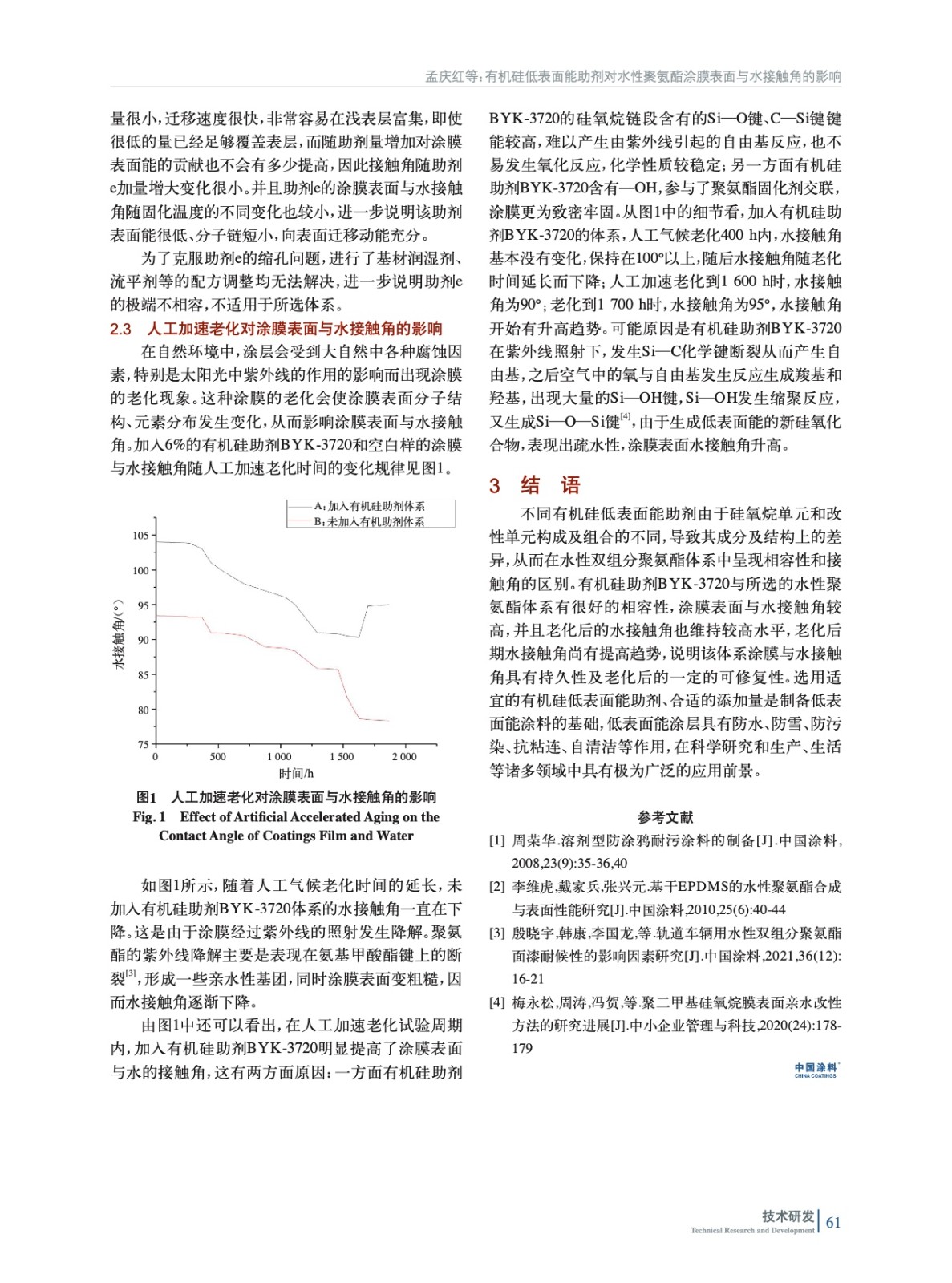 摘要:研究了有機硅低表面能助劑不同種類及用量對涂膜表面與水接觸角的影響,以及在人工加速老化過程中涂膜與水接觸角的變化規(guī)律。結果表明:在所選擇的水性羥基聚氨酯體系中有機硅低表面能助劑BYK-3720呈現(xiàn)了良好的綜合性能,質(zhì)量分數(shù)達到配方總量的6%時效果最佳,表面與水接觸角達到104°,并且在人工加速老化過程中,涂膜表面與水接觸角明顯更高,并且在老化后期涂膜表面與水接觸角有提高趨勢。