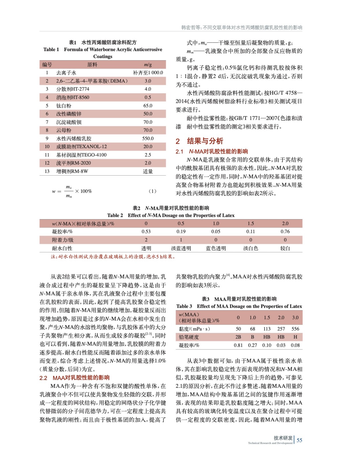 摘要:研究了N–羥甲基丙烯酰胺、甲基丙烯酸、硅烷偶聯(lián)劑以及磷酸酯功能單體4種不同交聯(lián)單體對(duì)丙烯酸乳膠的性能影響。數(shù)據(jù)表明,適量加入N-MA會(huì)提高乳膠的穩(wěn)定性,過(guò)多加入則會(huì)導(dǎo)致乳膠凝膠量增多,同時(shí)引起乳膠膜耐水性下降;MAA質(zhì)量分?jǐn)?shù)為2.0%時(shí),對(duì)提高聚合物交聯(lián)密度和涂膜硬度有作用;硅烷偶聯(lián)劑質(zhì)量分?jǐn)?shù)為0.3%時(shí),且采用后加入方式有利于提高乳膠穩(wěn)定性;磷酸酯功能單體對(duì)改善涂膜耐鹽霧性能效果顯著。