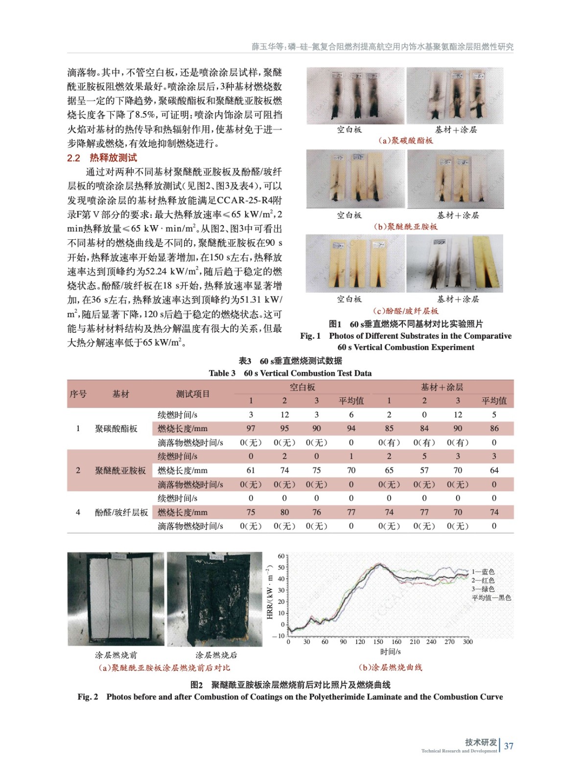 摘要:針對飛機內(nèi)飾對水性聚氨酯涂層高阻燃要求,采用磷改性水性聚氨酯乳液搭配P-Si-N(磷–硅–氮)系復(fù)合無鹵阻燃劑體系開發(fā)了新型高阻燃水性聚氨酯涂層,涂覆在聚碳酸酯板、聚醚酰亞胺及酚醛/玻纖層板3種基材上,與空白板進行燃燒對比實驗,測試結(jié)果達到了《中國民用航空規(guī)章 第25部 運輸類飛機適航標(biāo)準(zhǔn)》[CCAR-25-R4]附錄F部分關(guān)于內(nèi)飾阻燃的要求,涂層具有阻燃效率高、無熔融滴落物、無毒及無腐蝕性氣體釋放、低煙等特點,經(jīng)驗證可完全應(yīng)用在航空內(nèi)飾上推廣使用。