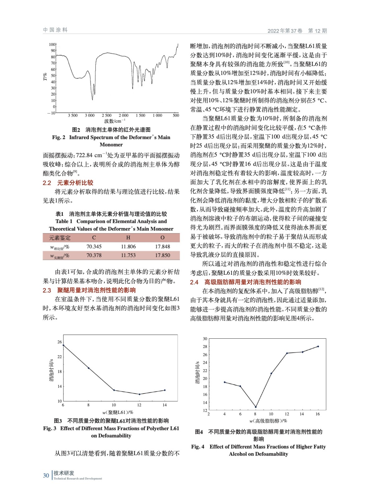 摘要:采用直接酯化法合成消泡劑主單體,通過紅外光譜分析產(chǎn)物的特征峰和元素分析,再對合成的主單體進(jìn)行復(fù)配制備出水性涂料用水基消泡劑,對聚醚、高級脂肪醇、液體石蠟的用量等影響消泡劑性能的因素進(jìn)行分析研究,確定出最佳合成工藝條件。結(jié)果表明,使用聚醚、硬脂酸單甘油酯、高級脂肪醇、液體石蠟、納米粒子、乳化劑、助乳化劑等原料可制備出性能優(yōu)良的環(huán)境友好型水基涂料消泡劑;最佳使用量為:聚醚和高級脂肪醇分別采用10%和8%的質(zhì)量分?jǐn)?shù)加入;采用液體石蠟作為擴散劑,可降低消泡劑的黏度,提高滲入和擴散能力,加入質(zhì)量分?jǐn)?shù)為15%。該消泡劑可在45 ℃條件下實現(xiàn)25 d不分層,5 ℃下35 d不分層,室溫下100 d不分層,具有較好的穩(wěn)定性和消泡性,與市售產(chǎn)品對比,總體性能較為接近,抑泡性更為優(yōu)異,市場前景廣闊。