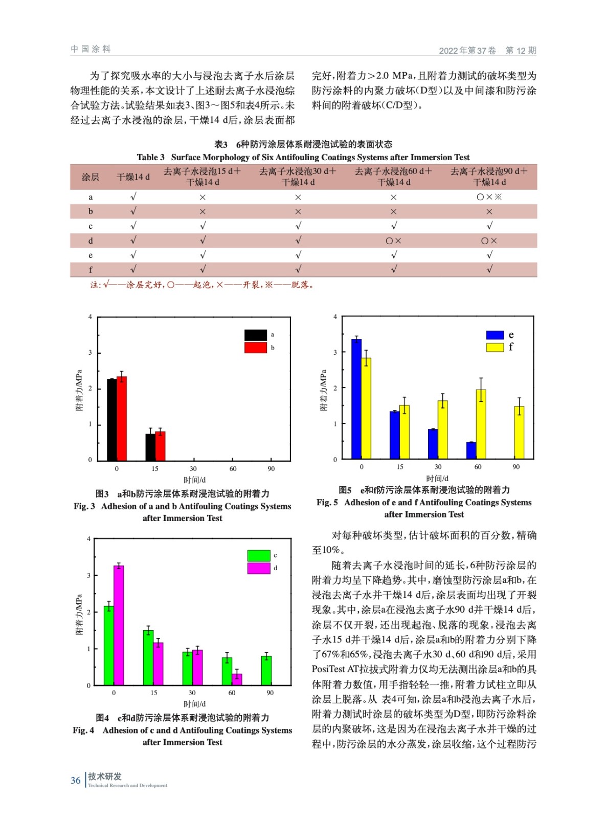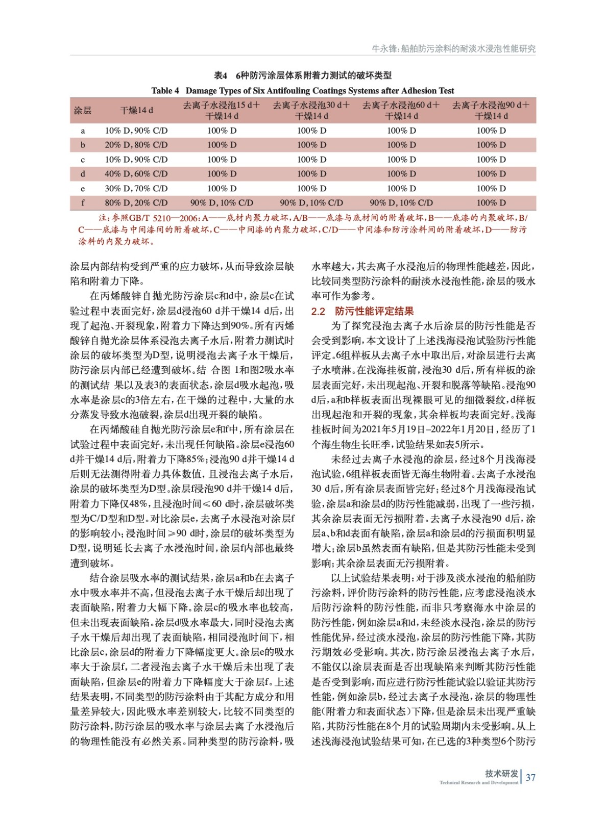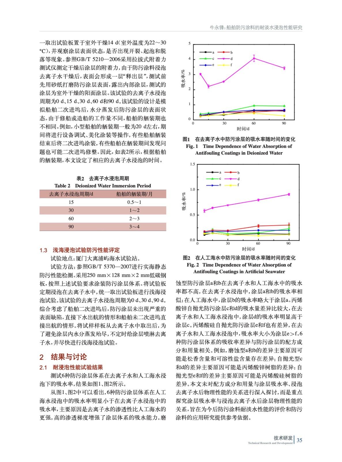 摘要:長期的淡水浸泡會對船舶防污涂層的性能產(chǎn)生影響,選取6種常見的市售防污涂料進(jìn)行耐淡水浸泡性能研究。測量了涂層的吸水率,跟蹤了去離子水浸泡和室外干燥后涂層的附著力變化規(guī)律,通過淺海浸泡試驗(yàn)考察了浸泡去離子水后涂層的防污性能,多角度對防污涂料的耐淡水浸泡性能進(jìn)行研究,為防污涂料產(chǎn)品的開發(fā)應(yīng)用提供參考。