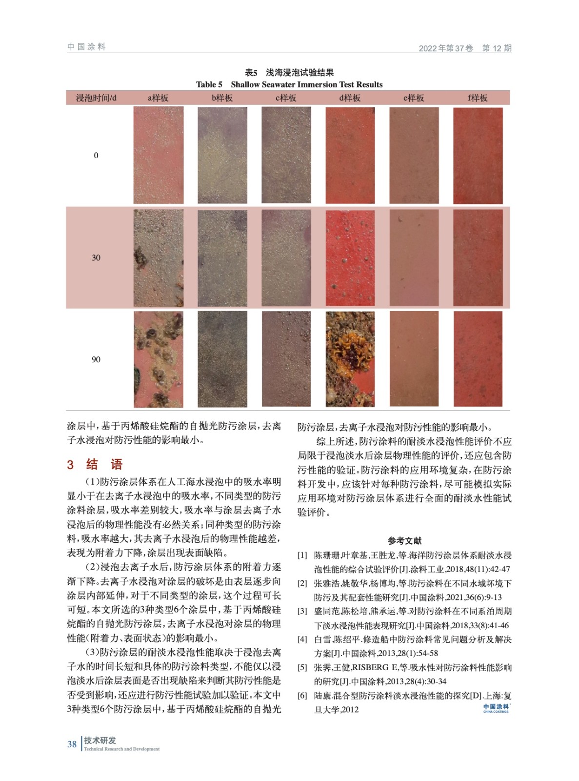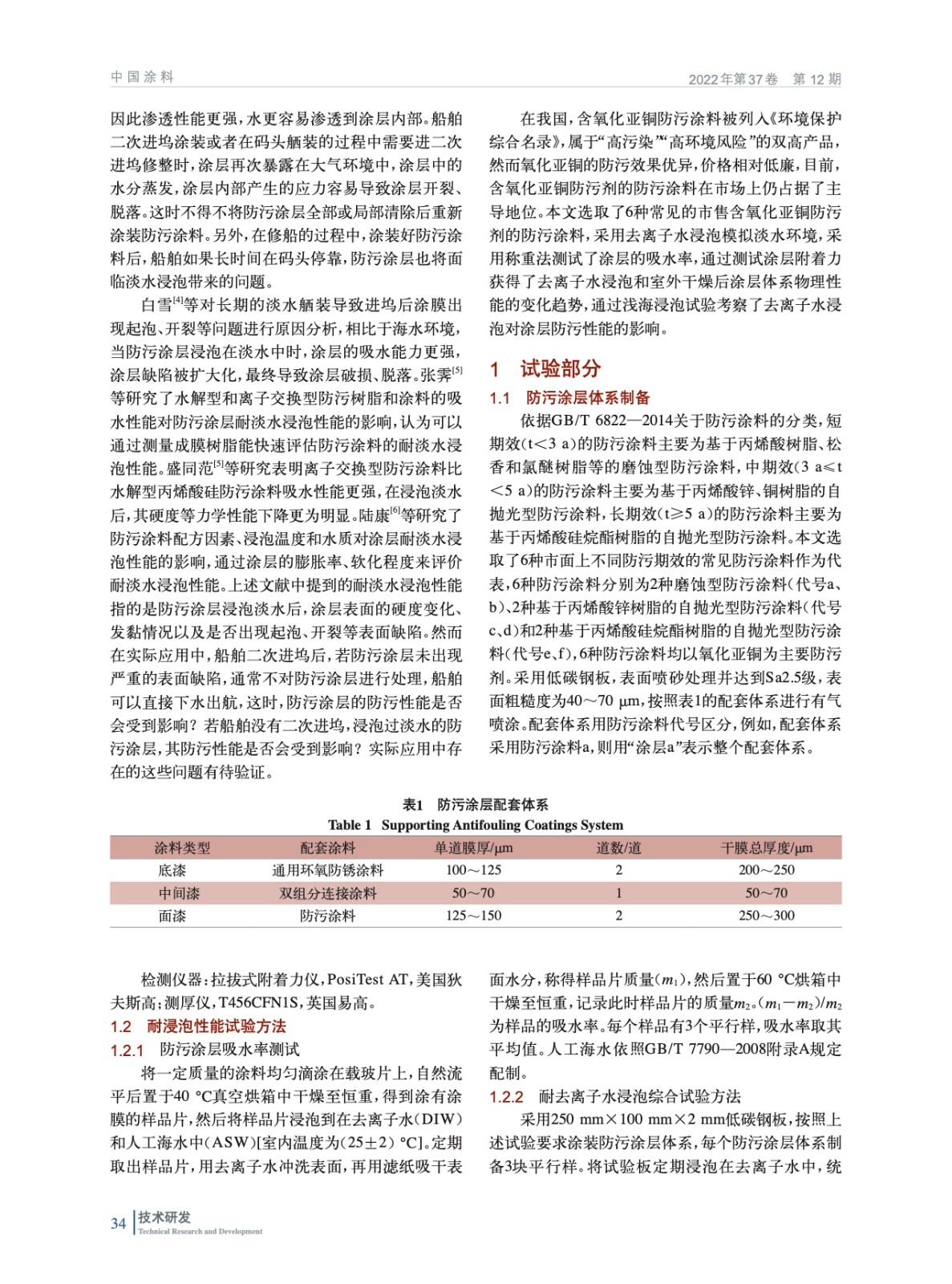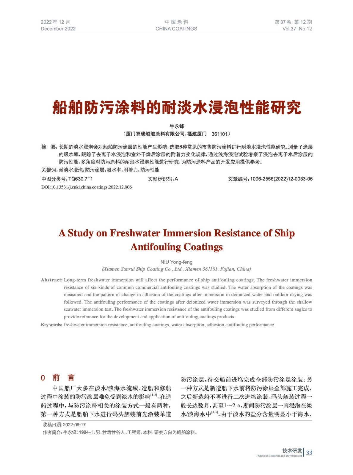 摘要:長期的淡水浸泡會對船舶防污涂層的性能產(chǎn)生影響,選取6種常見的市售防污涂料進(jìn)行耐淡水浸泡性能研究。測量了涂層的吸水率,跟蹤了去離子水浸泡和室外干燥后涂層的附著力變化規(guī)律,通過淺海浸泡試驗(yàn)考察了浸泡去離子水后涂層的防污性能,多角度對防污涂料的耐淡水浸泡性能進(jìn)行研究,為防污涂料產(chǎn)品的開發(fā)應(yīng)用提供參考。