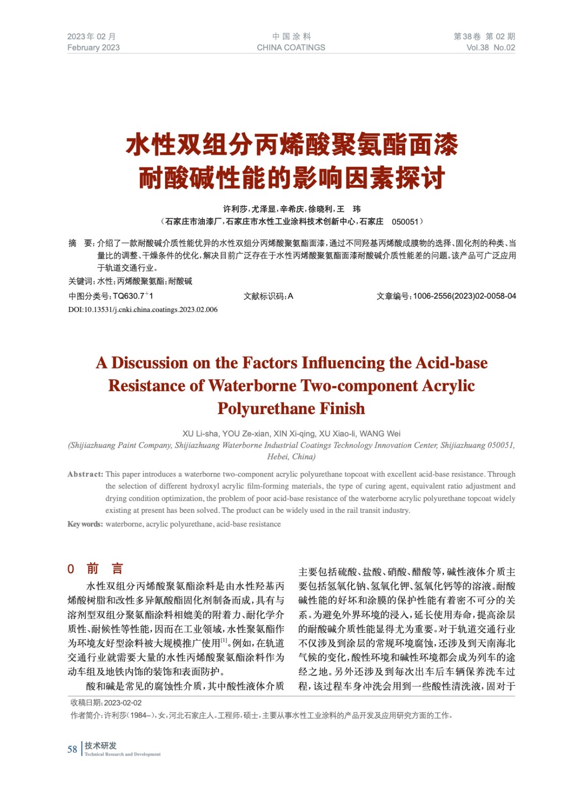 摘要:介紹了一款耐酸堿介質(zhì)性能優(yōu)異的水性雙組分丙烯酸聚氨酯面漆,通過不同羥基丙烯酸成膜物的選擇、固化劑的種類、當(dāng)量比的調(diào)整、干燥條件的優(yōu)化,解決目前廣泛存在于水性丙烯酸聚氨酯面漆耐酸堿介質(zhì)性能差的問題。該產(chǎn)品可廣泛應(yīng)用于軌道交通行業(yè)。