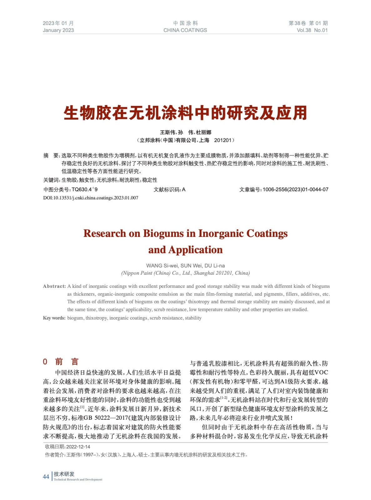 摘要:選取不同種類生物膠作為增稠劑,以有機無機復合乳液作為主要成膜物質(zhì),并添加顏填料、助劑等制得一種性能優(yōu)異、貯存穩(wěn)定性良好的無機涂料。探討了不同種類生物膠對涂料觸變性、熱貯存穩(wěn)定性的影響,同時對涂料的施工性、耐洗刷性、低溫穩(wěn)定性等各方面性能進行研究。
