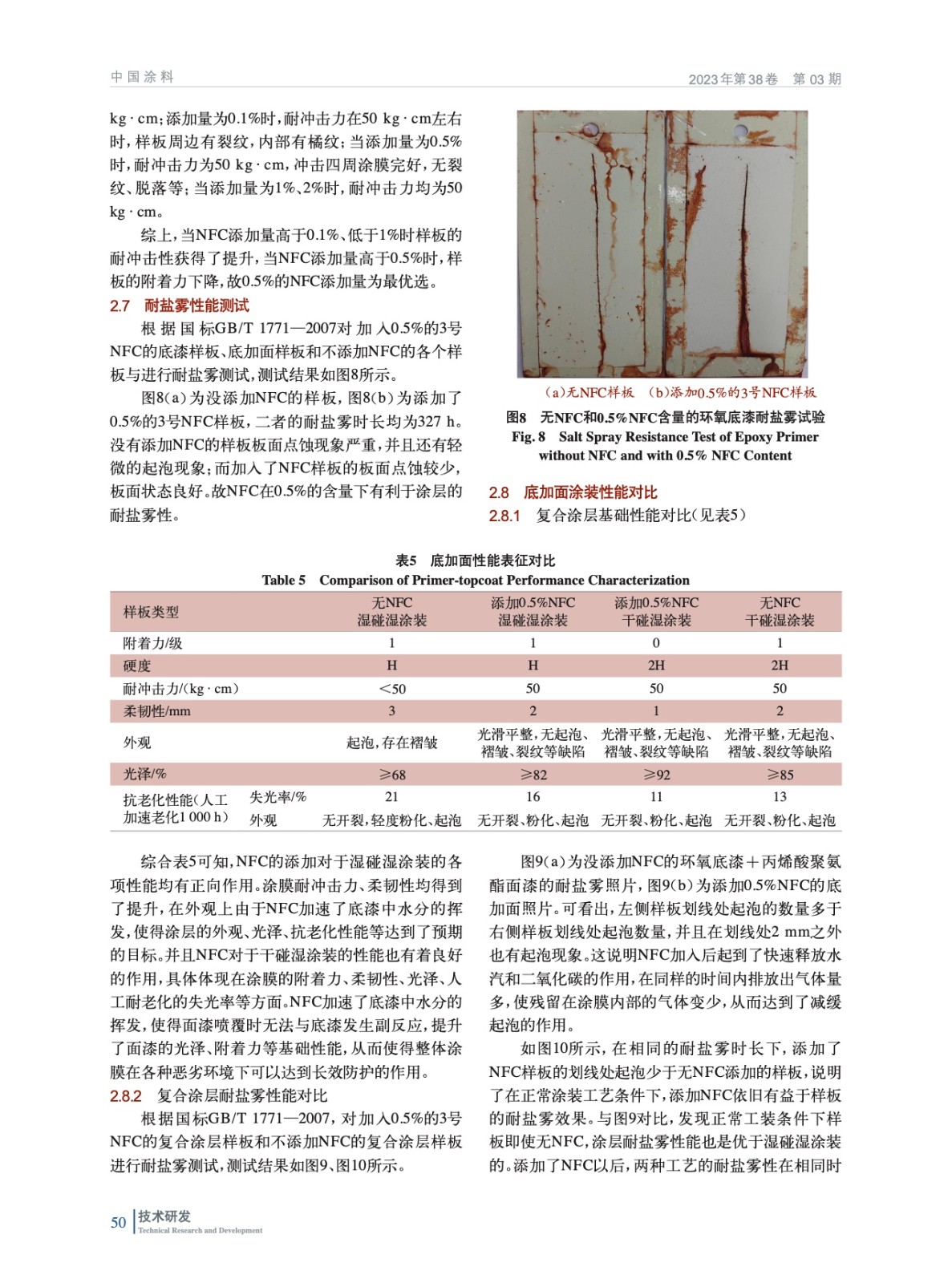 摘要:采用3種固含量不同的納米纖維素(NFC)對涂膜進(jìn)行改性,利用納米纖維素的結(jié)構(gòu)特點,在水性環(huán)氧底漆濕膜中形成通道效應(yīng),加速底漆中水的揮發(fā)??疾炝送磕ぶ蠳FC添加量變化對其干燥速度、耐鹽霧性、附著力、耐沖擊性、表面張力的影響。研究發(fā)現(xiàn),在水性環(huán)氧底漆中引入新型的納米纖維素材料后,可以加快干燥過程中的水分揮發(fā)速率,使其快速表干。同時,隨著NFC添加量的增加,涂膜的耐鹽霧性、附著力、抗沖擊等性能逐漸提升,最終發(fā)現(xiàn)當(dāng)固含量為5.7%NFC添加量為0.5%(質(zhì)量分?jǐn)?shù))的時候涂膜的各項性能達(dá)到最佳。滿足水性環(huán)氧底漆快速表干的條件,并能適應(yīng)“濕碰濕”涂裝需求,大大降低了涂裝間隔時間,復(fù)合涂層涂膜外觀出色。