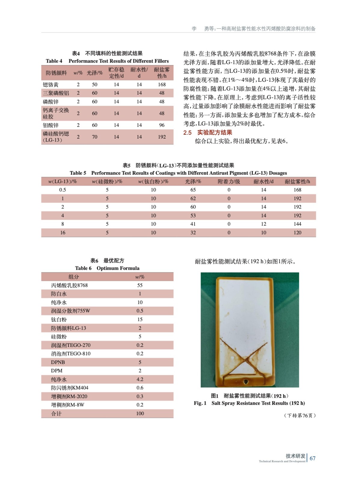 摘要:通過自制防銹顏料來提高配方耐鹽霧性能,優(yōu)選乳液、填料和防銹顏料的添加量,制備了一款環(huán)境友好型單組分水性丙烯酸防腐涂料,其不含重金屬,耐鹽霧性能達(dá)到192 h以上。