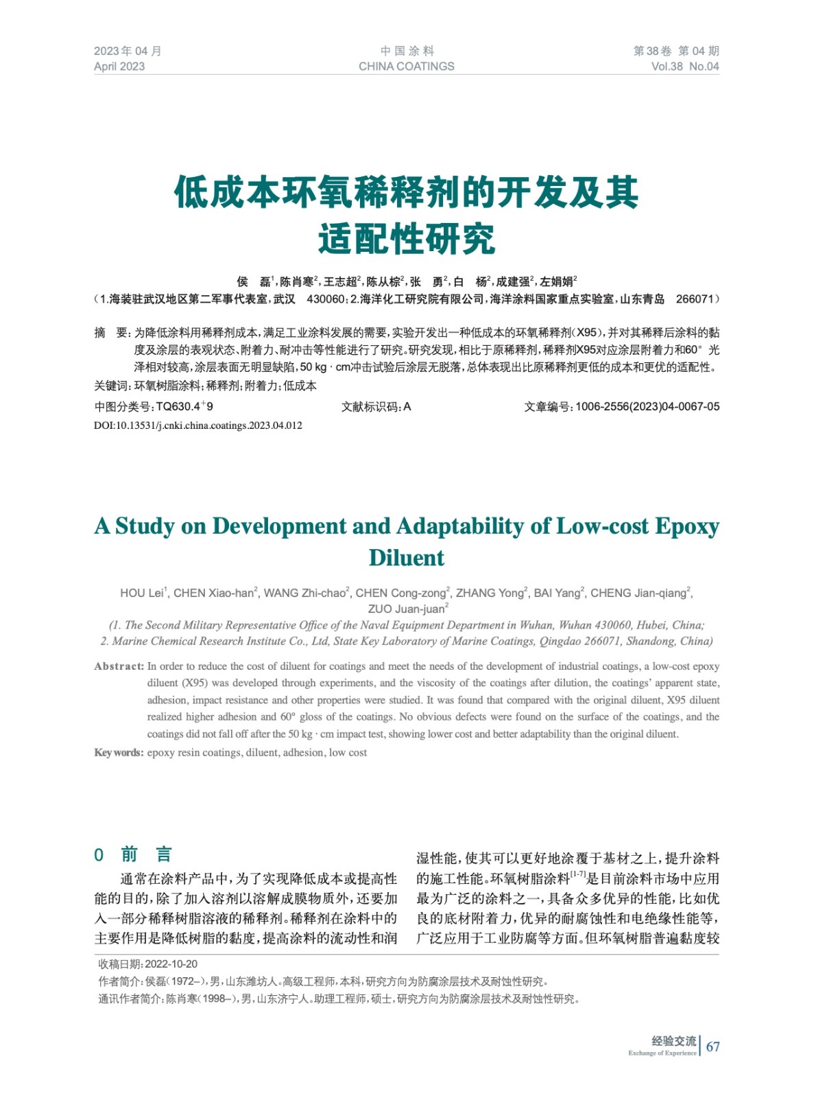 本文系作者@侯 磊,陳肖寒,王志超,陳從棕,張 勇,白 楊,成建強(qiáng),左娟娟 授權(quán)中國涂料網(wǎng)發(fā)表,并經(jīng)中國涂料網(wǎng)編輯,未經(jīng)允許不得轉(zhuǎn)載,如需轉(zhuǎn)載請聯(lián)系chinacoatingnet@vip.163.com