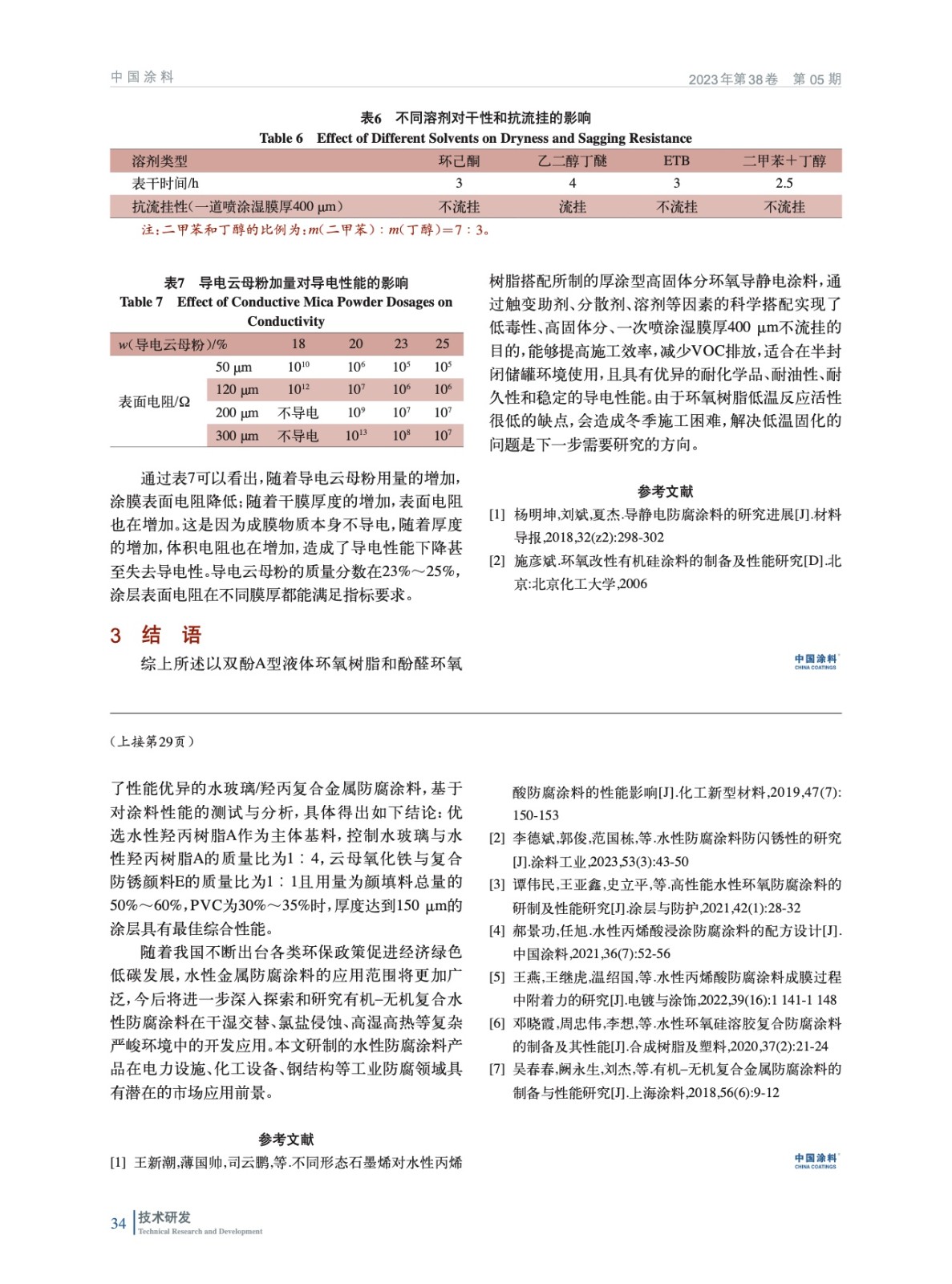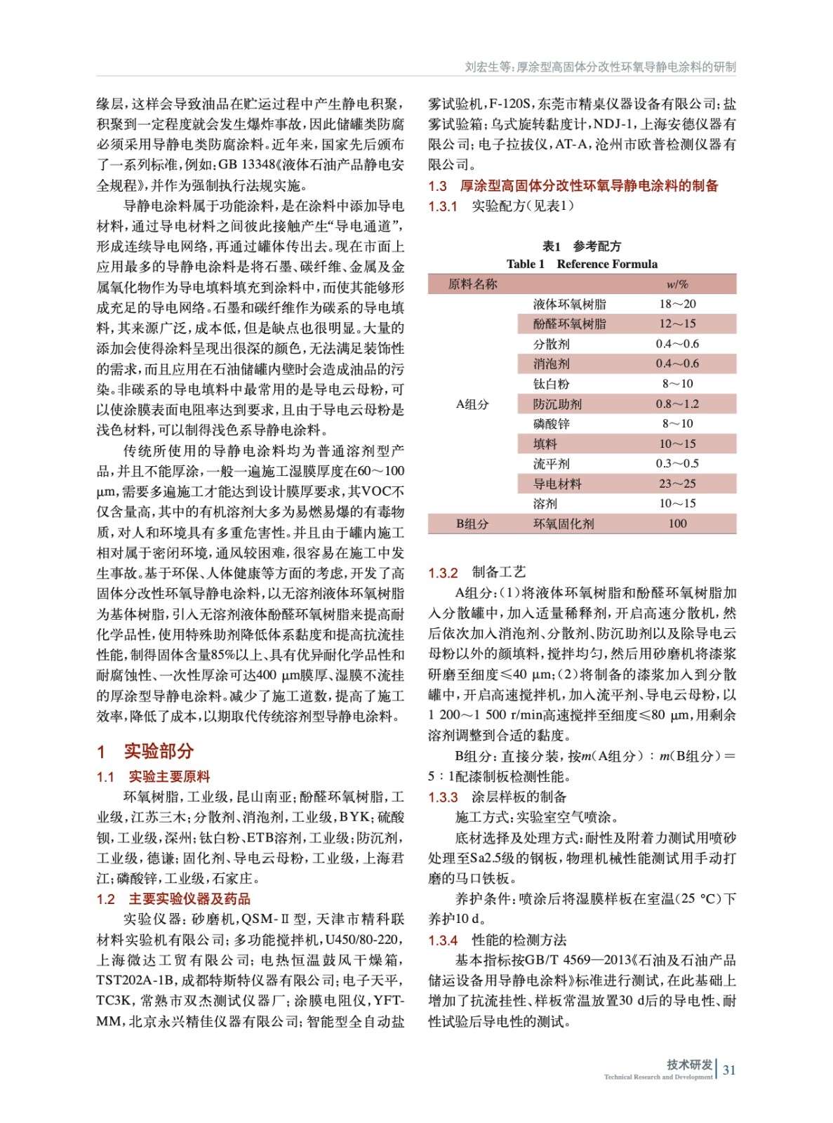 摘要:以液體雙酚A環(huán)氧樹脂和液體酚醛環(huán)氧樹脂為基料,以環(huán)境友好型稀釋劑為溶劑,在功能性導(dǎo)電材料、顏填料和助劑的配合下制備成厚涂型高固體分改性環(huán)氧導(dǎo)靜電涂料,并對涂膜的性能進(jìn)行檢測。結(jié)果表明,采用噴涂施工時(shí),一次性厚涂濕膜400 μm不流掛;實(shí)干后,表面電阻率可達(dá)到106~108 Ω;且涂膜具有優(yōu)良的耐油性、耐鹽霧性、耐化學(xué)品性;經(jīng)耐性測試后,其導(dǎo)電性衰減量很小。