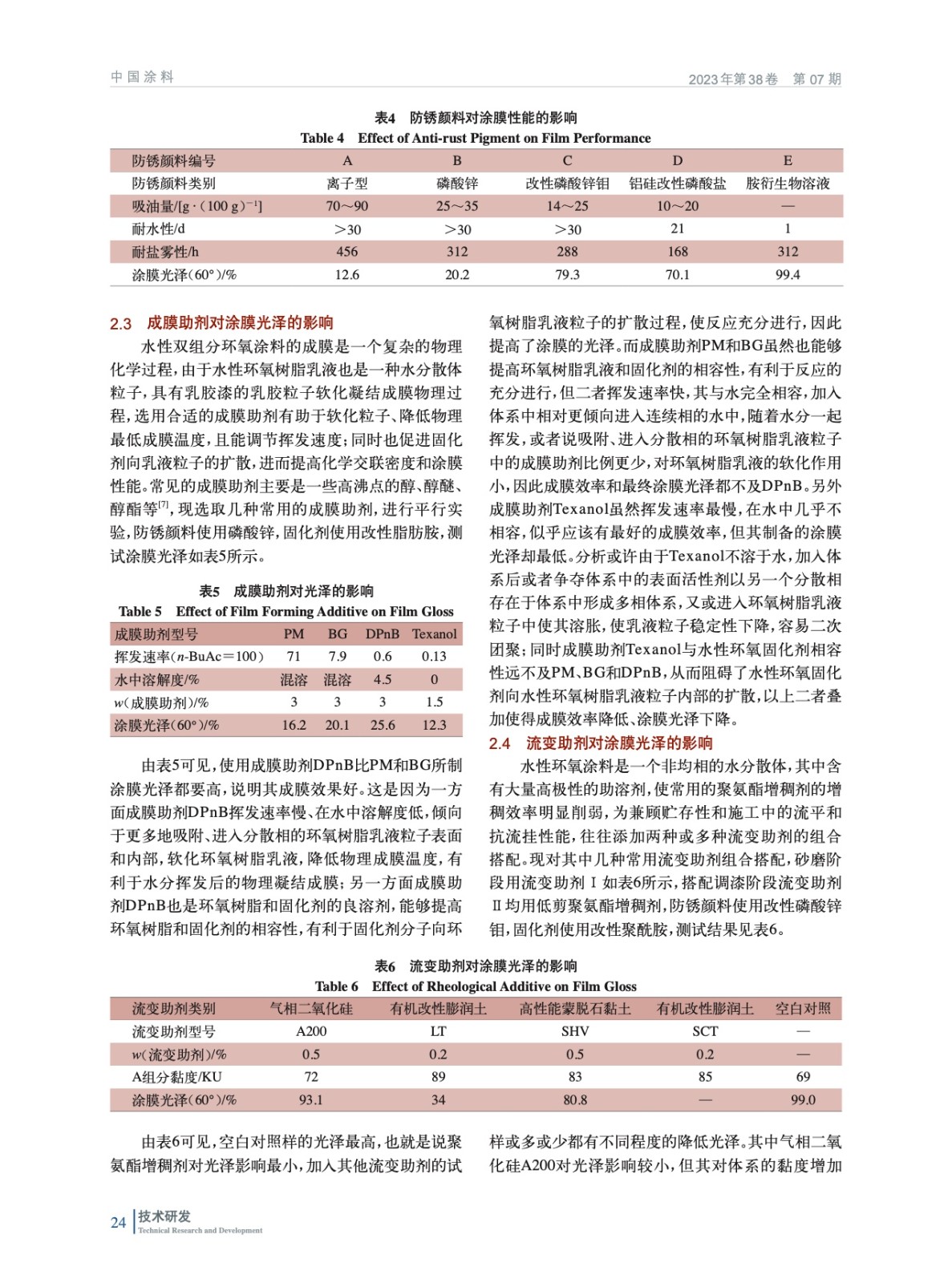 摘要:探討了雙組分水性環(huán)氧防腐蝕涂料光澤的影響因素,分析了在保證耐鹽霧性能的前提下,水性環(huán)氧樹脂乳液粒徑、乳液和固化劑相容性、防銹顏料種類、成膜助劑、流變助劑和涂料細(xì)度等一定程度上對最終涂膜光澤的影響。