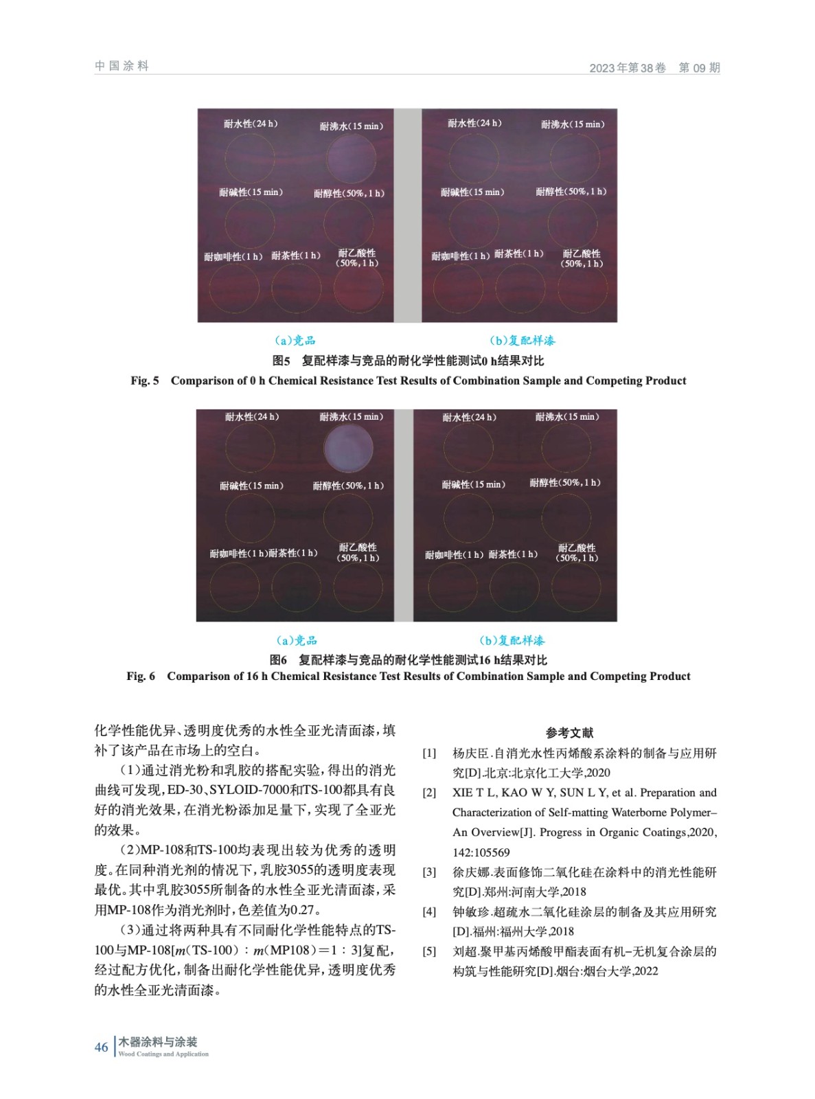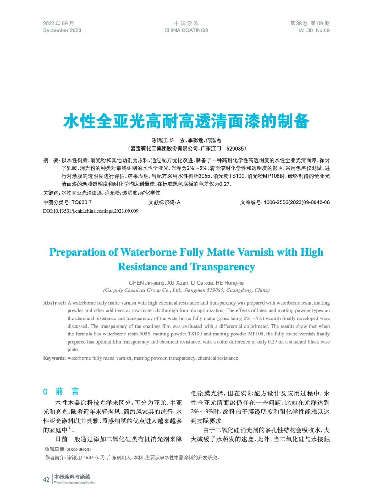 摘要:以水性樹脂、消光粉和其他助劑為原料,通過配方優(yōu)化改進(jìn),制備了一種高耐化學(xué)性高透明度的水性全亞光清面漆。探討了乳膠、消光粉的種類對(duì)最終研制的水性全亞光(光澤為2%~5%)清面漆耐化學(xué)性和透明度的影響,采用色差儀測(cè)試,進(jìn)行對(duì)涂膜的透明度進(jìn)行評(píng)估。結(jié)果表明,當(dāng)配方采用水性樹脂3055、消光粉TS100、消光粉MP108時(shí),最終制得的全亞光清面漆的涂膜透明度和耐化學(xué)均達(dá)到最佳,在標(biāo)準(zhǔn)黑色底板的色差僅為0.27。