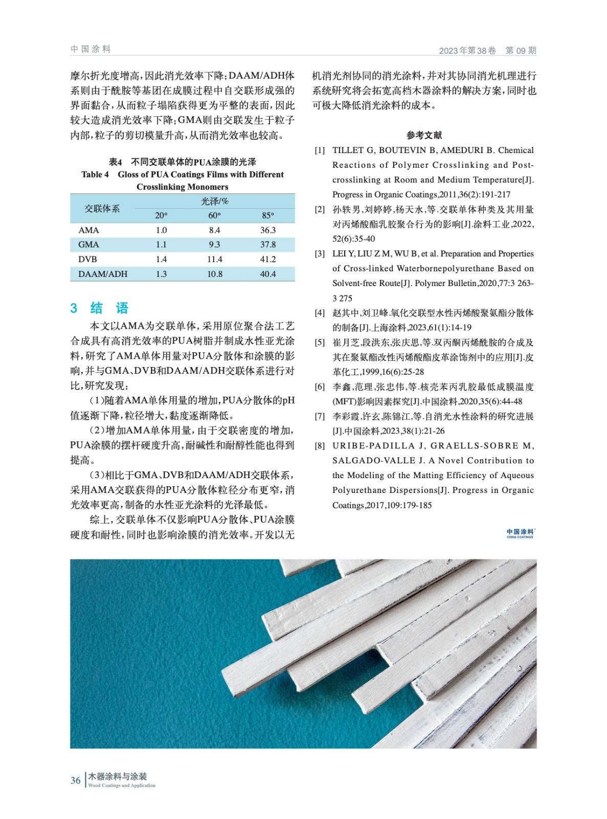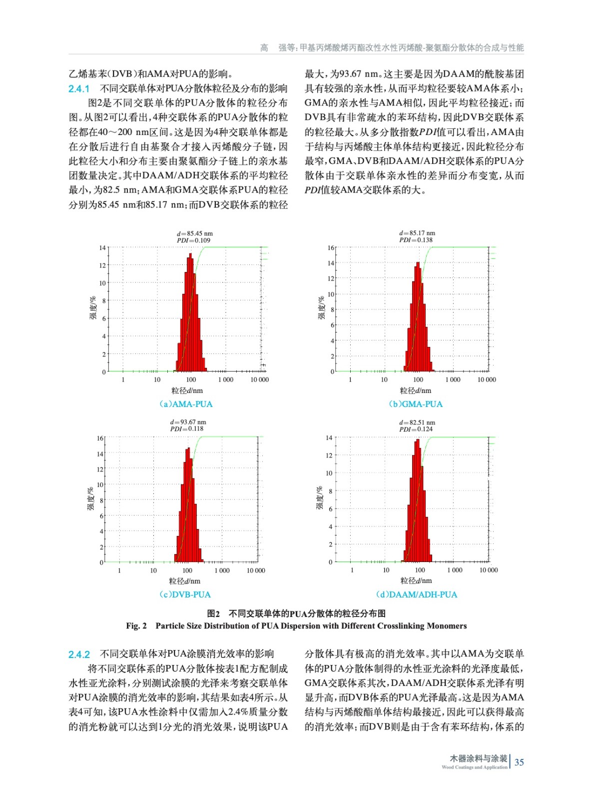 摘要:以甲基丙烯酸烯丙酯(AMA)為交聯(lián)單體,采用原位聚合法工藝合成具有高消光效率的水性丙烯酸–聚氨酯(PUA)分散體并制成水性亞光涂料。通過紅外光譜確定了PUA分散體的合成。研究了AMA單體用量對(duì)PUA分散體和涂膜性能的影響,并對(duì)比了AMA與甲基丙烯酸縮水甘油酯(GMA)、二乙烯基苯(DVB)、雙丙酮丙烯酰胺/己二酰肼(DAAM/ADH)交聯(lián)體系對(duì)PUA分散體的粒徑、粒徑分布以及PUA涂膜消光效率的影響。研究發(fā)現(xiàn):隨著AMA單體用量的增加,PUA分散體的pH值逐漸下降,粒徑增大,黏度逐漸降低。由于交聯(lián)密度的增加,PUA涂膜的擺桿硬度升高,耐堿和耐醇性能也得到提高。采用AMA交聯(lián)獲得的PUA分散體粒徑分布更窄,消光效率更高,制備的水性亞光涂料的光澤最低。