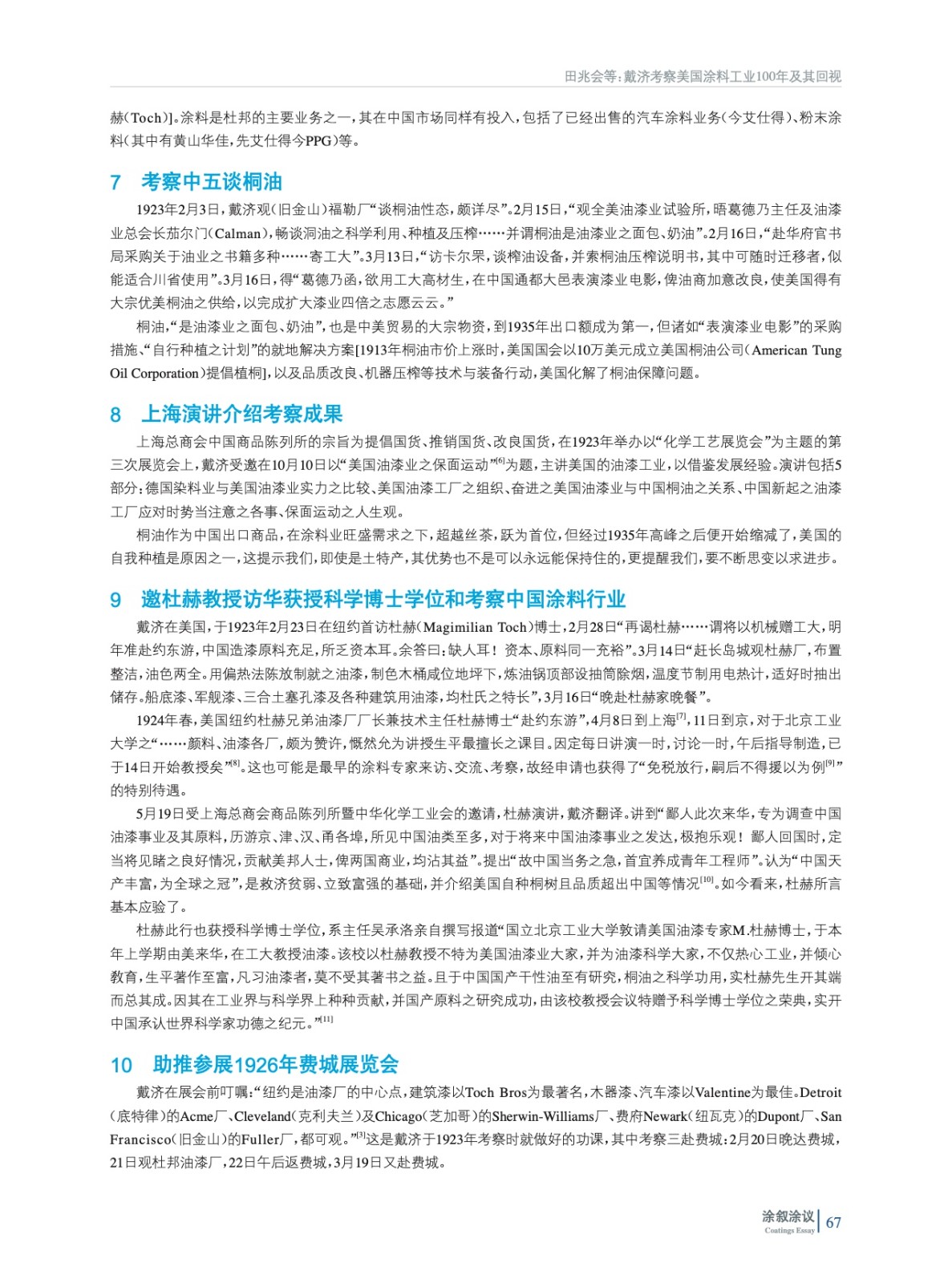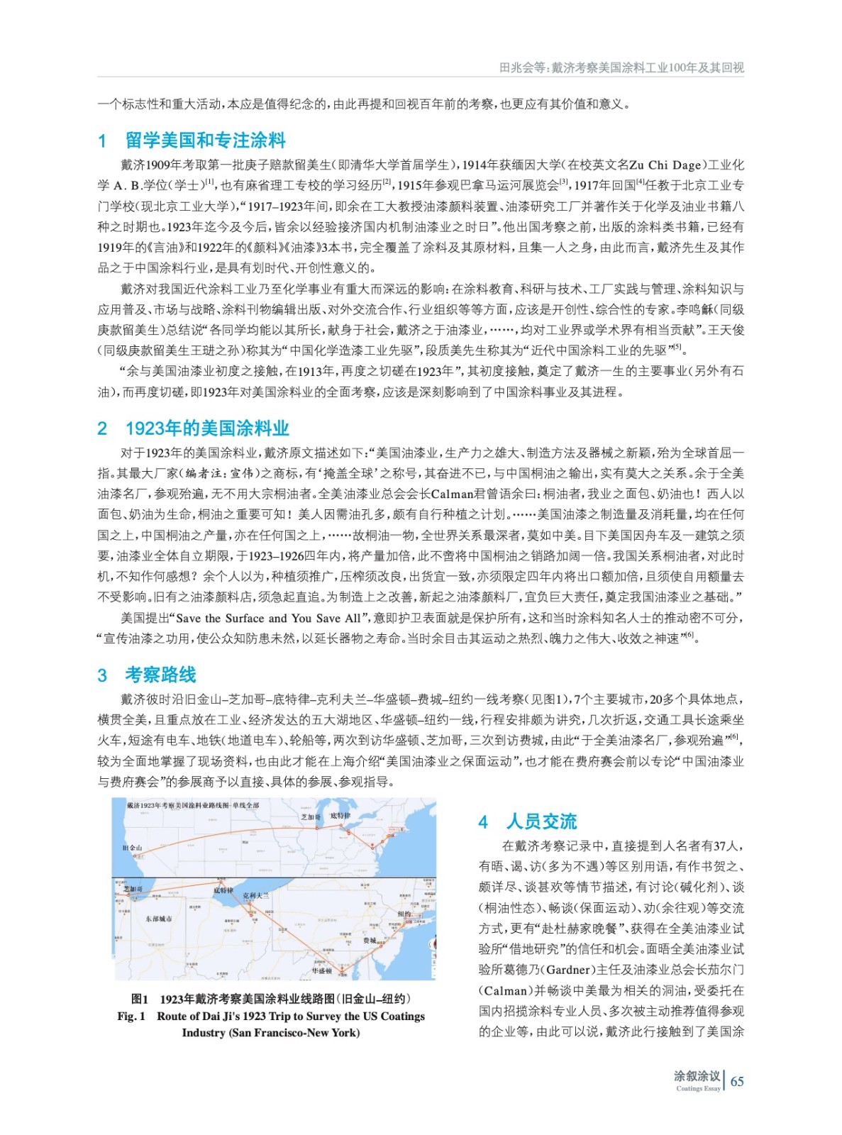 摘要:100年前的1923年,戴濟(jì)(字汝楫)考察美國涂料業(yè),時(shí)間跨度為1月31日至4月13日,歷時(shí)73天,主要沿舊金山–紐約一線,參觀至少34家工廠、13處公共機(jī)構(gòu),會(huì)晤37人,并寫成《游美紀(jì)程》一文,收錄在《油漆季刊(費(fèi)府賽會(huì)號(hào))》中,在10月10日于上??偵虝?huì)商品陳列所第三次展覽會(huì)暨化學(xué)工藝展覽會(huì)(1923年)上,發(fā)表題為“美國油漆業(yè)之保面運(yùn)動(dòng)”的演講,促成杜赫于1924年來華“專為調(diào)查中國油漆事業(yè)及其原料”,也由此開啟和奠定中美涂料業(yè)的相互交流的基礎(chǔ)。當(dāng)初這第一步走出去之時(shí),正值我國從原始大漆、桐油開始轉(zhuǎn)型、現(xiàn)代涂料工業(yè)起步之際。此行作為中國涂料發(fā)展歷程的一個(gè)標(biāo)志性和重大活動(dòng),本應(yīng)是值得紀(jì)念的,由此再提和回視百年前的考察,也更應(yīng)有其價(jià)值和意義。