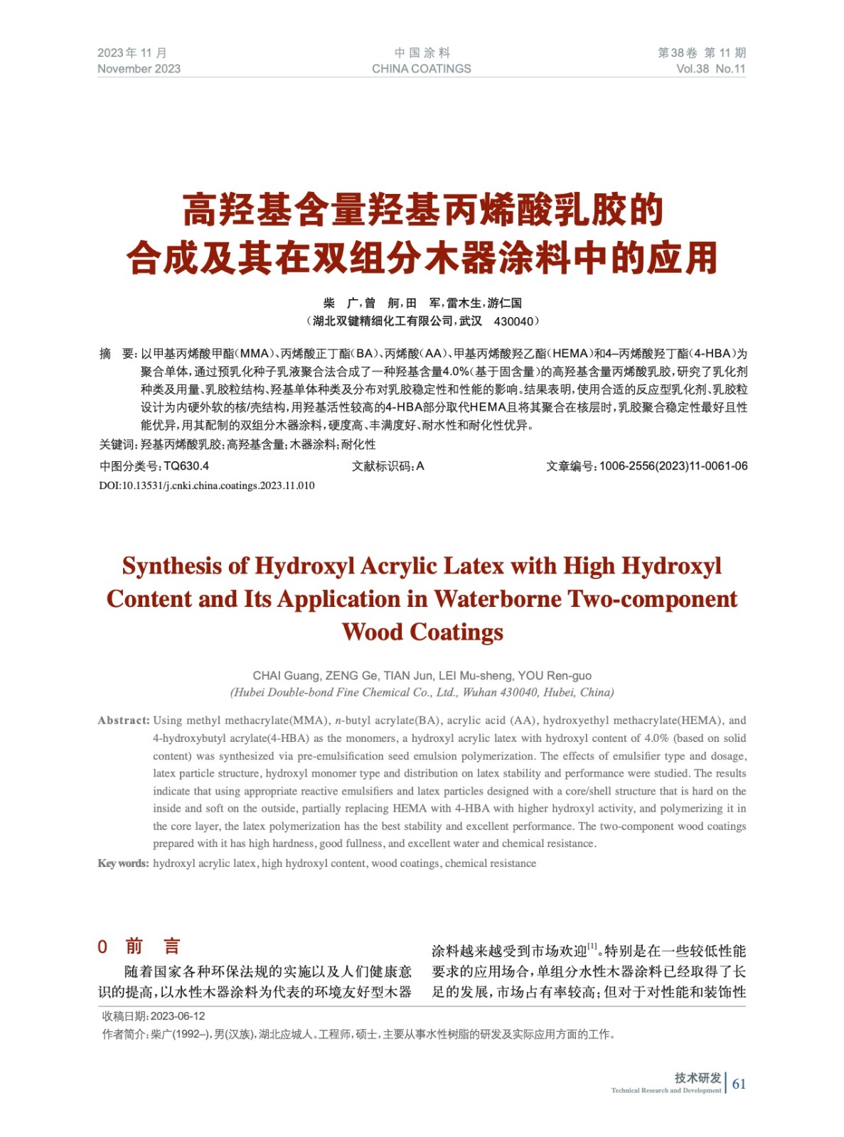 高羥基含量羥基丙烯酸乳膠的合成及其在雙組分木器涂料中的應(yīng)用