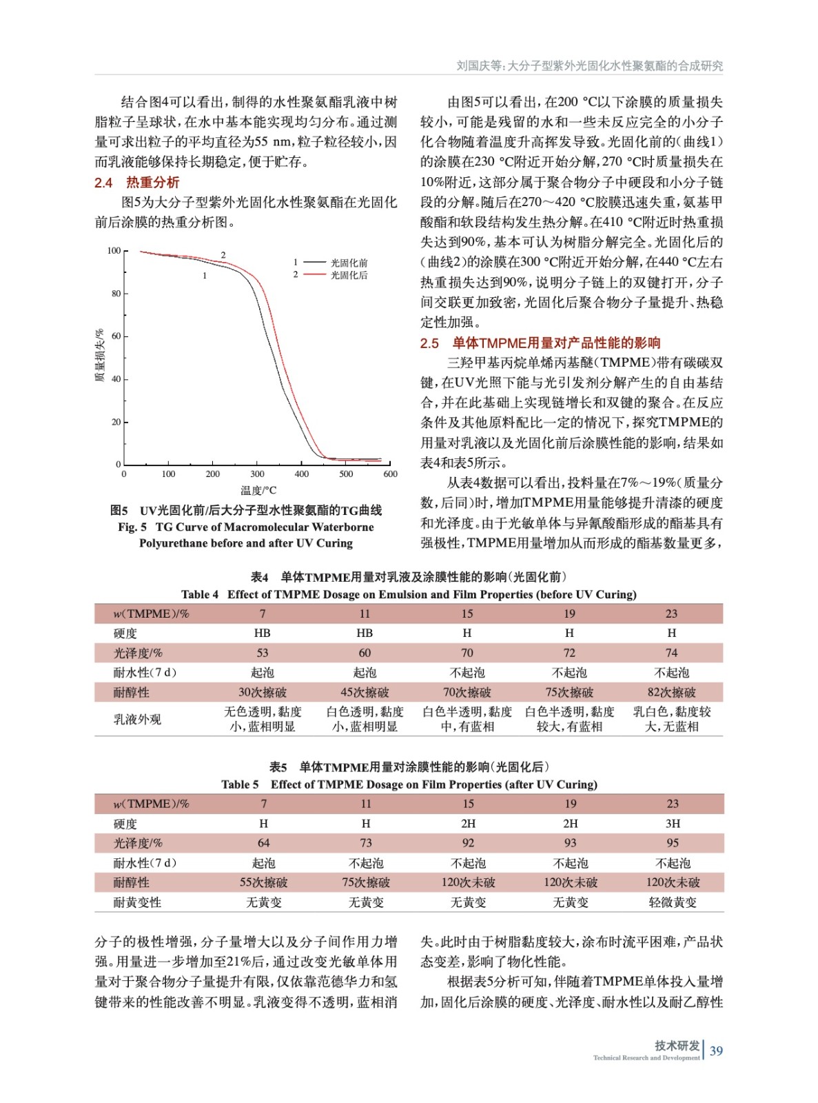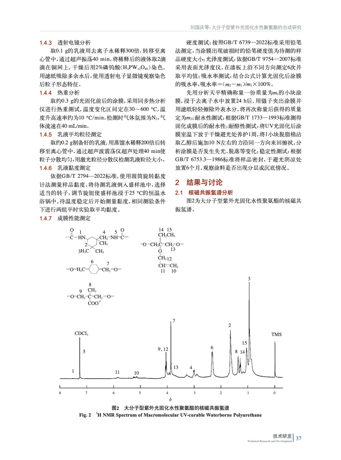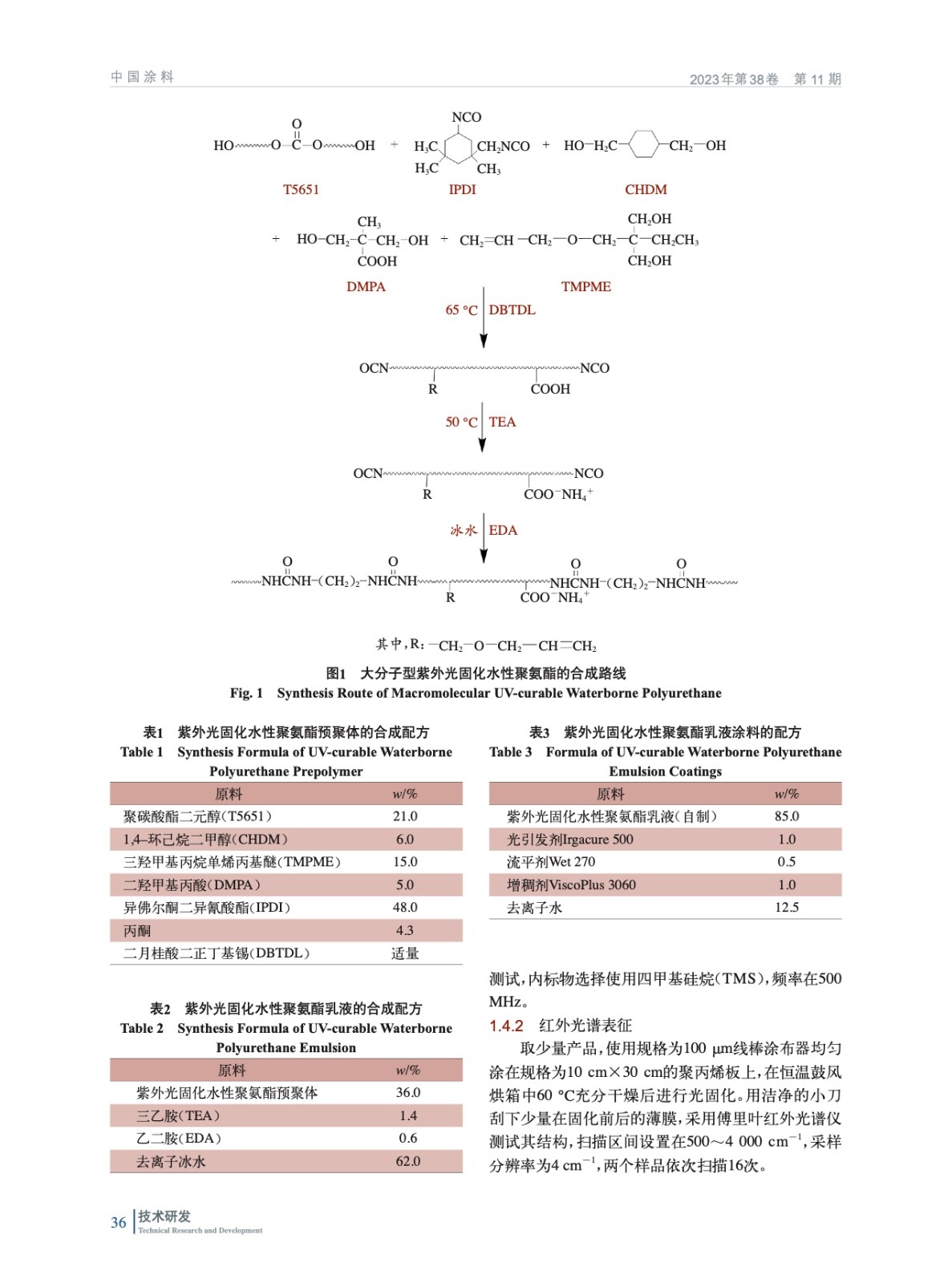 摘要:采用異佛爾酮二異氰酸酯(IPDI)以及1,4–環(huán)己烷二甲醇(CHDM)充當硬段,線性聚碳酸酯二元醇(T5651)作為軟段,三羥甲基丙烷單烯丙基醚(TMPME)充當光敏單體,二羥甲基丙酸(DMPA)為親水單體,通過擴鏈合成了大分子型紫外光固化水性聚氨酯(UV-WPU)。結(jié)合核磁共振波譜(NMR)、傅里葉紅外光譜(FT-IR)、透射電鏡(TEM)、熱重分析(TGA)以及激光粒度分析儀對合成的乳液及涂膜的結(jié)構(gòu)與性能進行了表征,探討了TMPME、DMPA、CHDM用量和光固化工藝對于樹脂乳液以及成膜后性能的影響。結(jié)果表明:當TMPME質(zhì)量分數(shù)為15%,CHDM、DMPA質(zhì)量分數(shù)分別為6%、5%時制得的聚氨酯乳液貯存穩(wěn)定、性能優(yōu)異;經(jīng)紫外光固化35 s后涂膜硬度高、不黃變,耐溶劑性好。