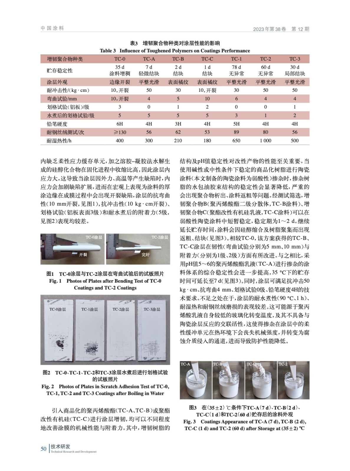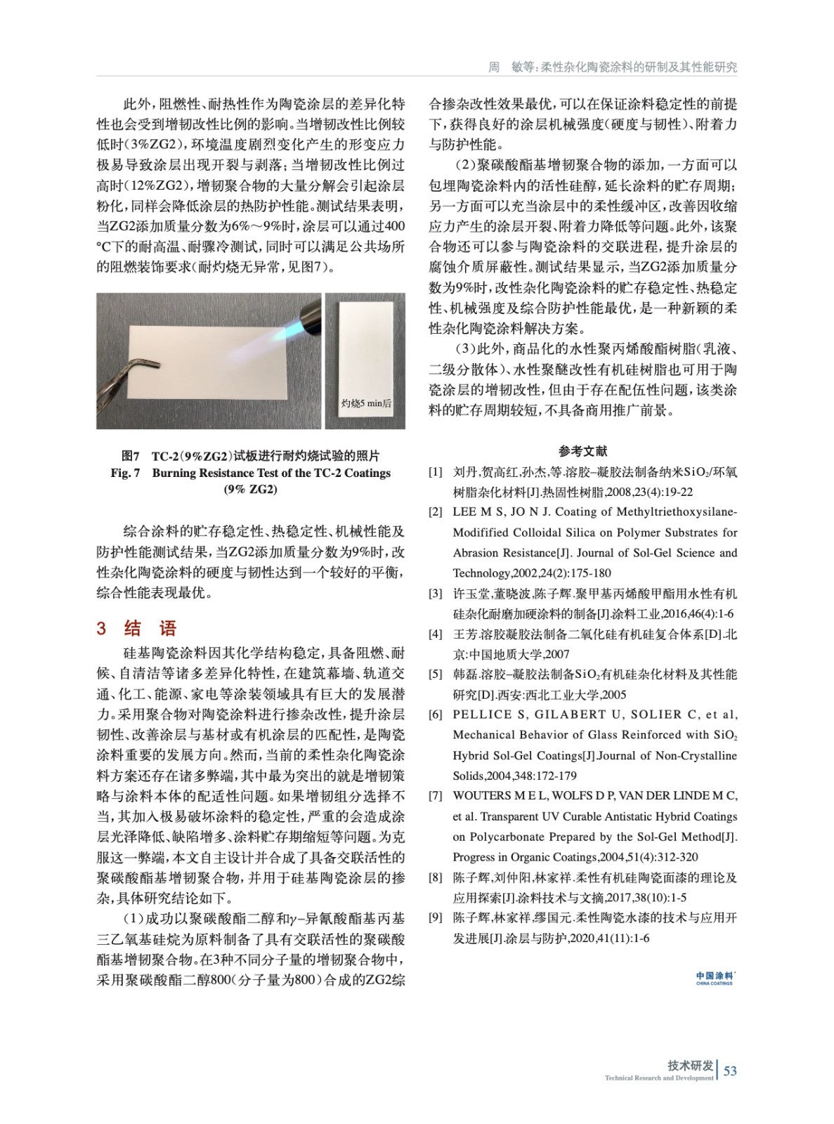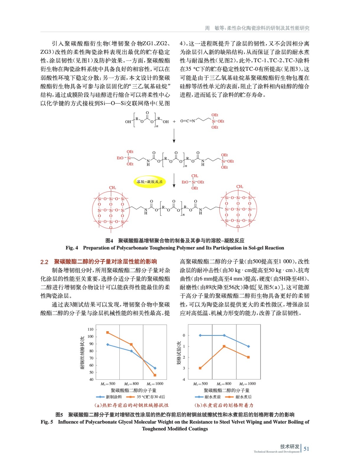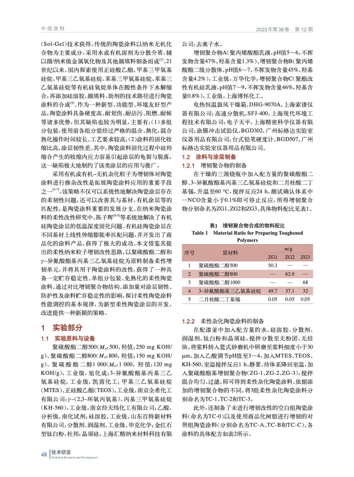 摘要:以聚碳酸酯二醇和γ–異氰酸酯基丙基三乙氧基硅烷為原料,制備了具有良好硅烷相容性與貯存穩(wěn)定性的活性增韌聚合物ZG2,并將其應用于陶瓷涂料的柔性改性。實驗結果顯示,聚碳酸酯基增韌聚合物ZG2的摻雜,一方面可以包埋涂料中的活性硅醇,延長涂料的貯存周期;另一方面可以充當涂層中的柔性緩沖區(qū),改善因收縮應力而產(chǎn)生的涂層開裂、附著力低等問題。此外,ZG2還可以參與陶瓷涂料的交聯(lián)進程,提升涂層的腐蝕介質屏蔽性。當ZG2的摻雜質量分數(shù)為9%時,所得改性雜化陶瓷涂料的貯存穩(wěn)定性、熱穩(wěn)定性、機械強度及綜合防護性能最優(yōu),具備市場化推廣潛力。