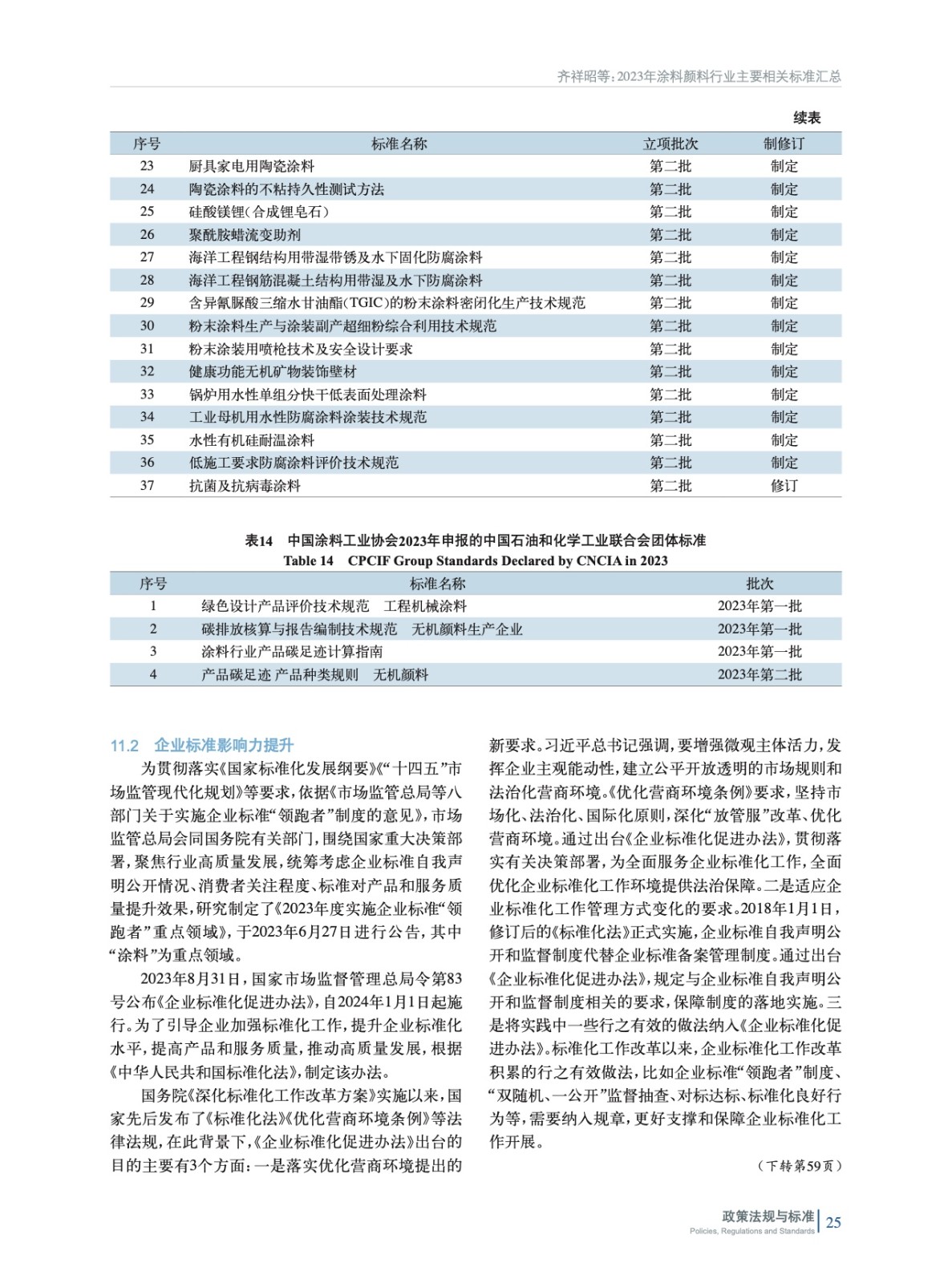 摘要:2023年,涂料、顏料相關(guān)標(biāo)準(zhǔn)得以進(jìn)一步完善。國家標(biāo)準(zhǔn)年度復(fù)審工作有序進(jìn)行,推進(jìn)標(biāo)準(zhǔn)更新升級(jí);標(biāo)準(zhǔn)體系進(jìn)一步優(yōu)化,持續(xù)提高標(biāo)準(zhǔn)質(zhì)量水平;持續(xù)完善國家標(biāo)準(zhǔn)樣品體系;推動(dòng)推薦性國家標(biāo)準(zhǔn)采信團(tuán)體標(biāo)準(zhǔn),引領(lǐng)團(tuán)體標(biāo)準(zhǔn)高水平供給,提高團(tuán)體標(biāo)準(zhǔn)公信力。推動(dòng)實(shí)施標(biāo)準(zhǔn)創(chuàng)新型企業(yè)梯度培育工作,積極培育標(biāo)準(zhǔn)創(chuàng)新型企業(yè);開展企業(yè)標(biāo)準(zhǔn)“領(lǐng)跑者”認(rèn)證工作,引導(dǎo)企業(yè)爭創(chuàng)一批高質(zhì)量標(biāo)準(zhǔn)。