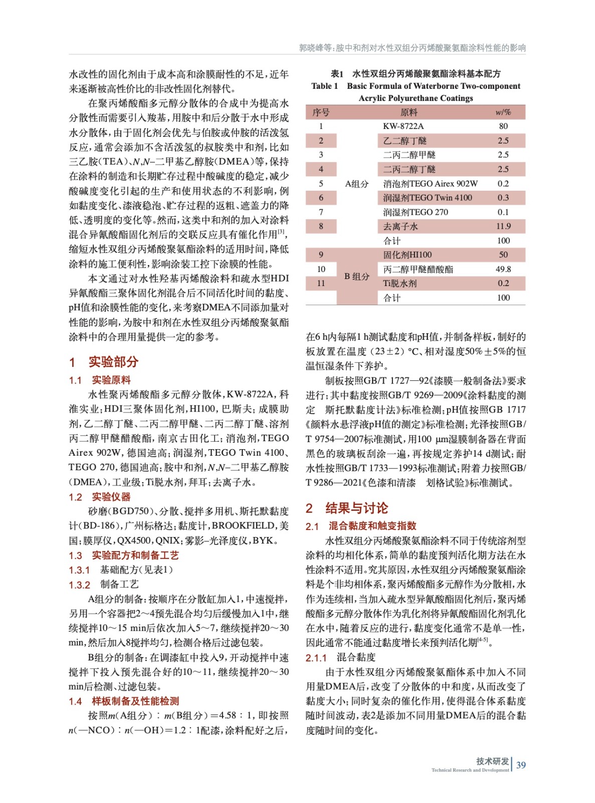 胺中和劑對(duì)水性雙組分丙烯酸聚氨酯涂料性能的影響