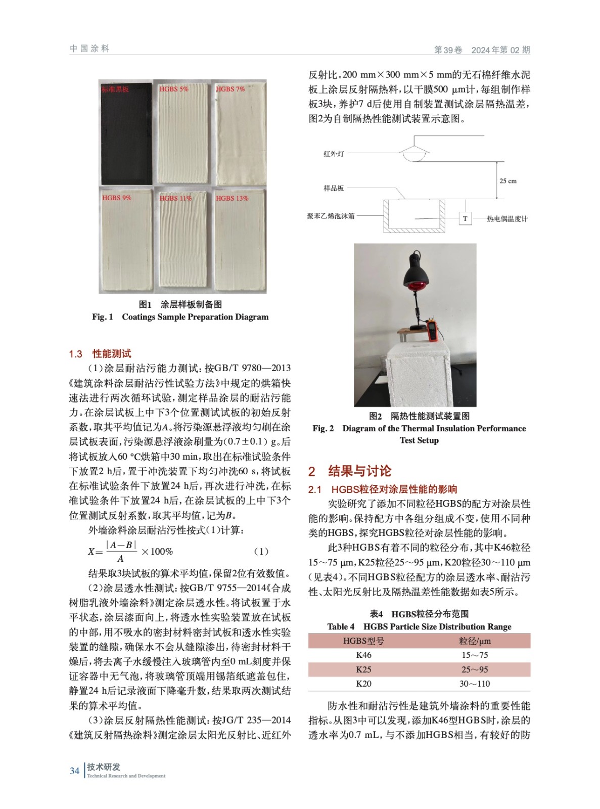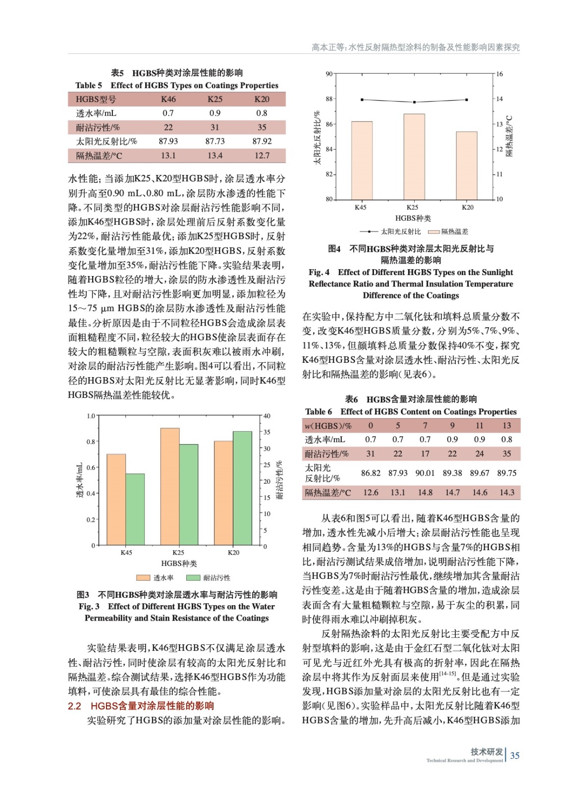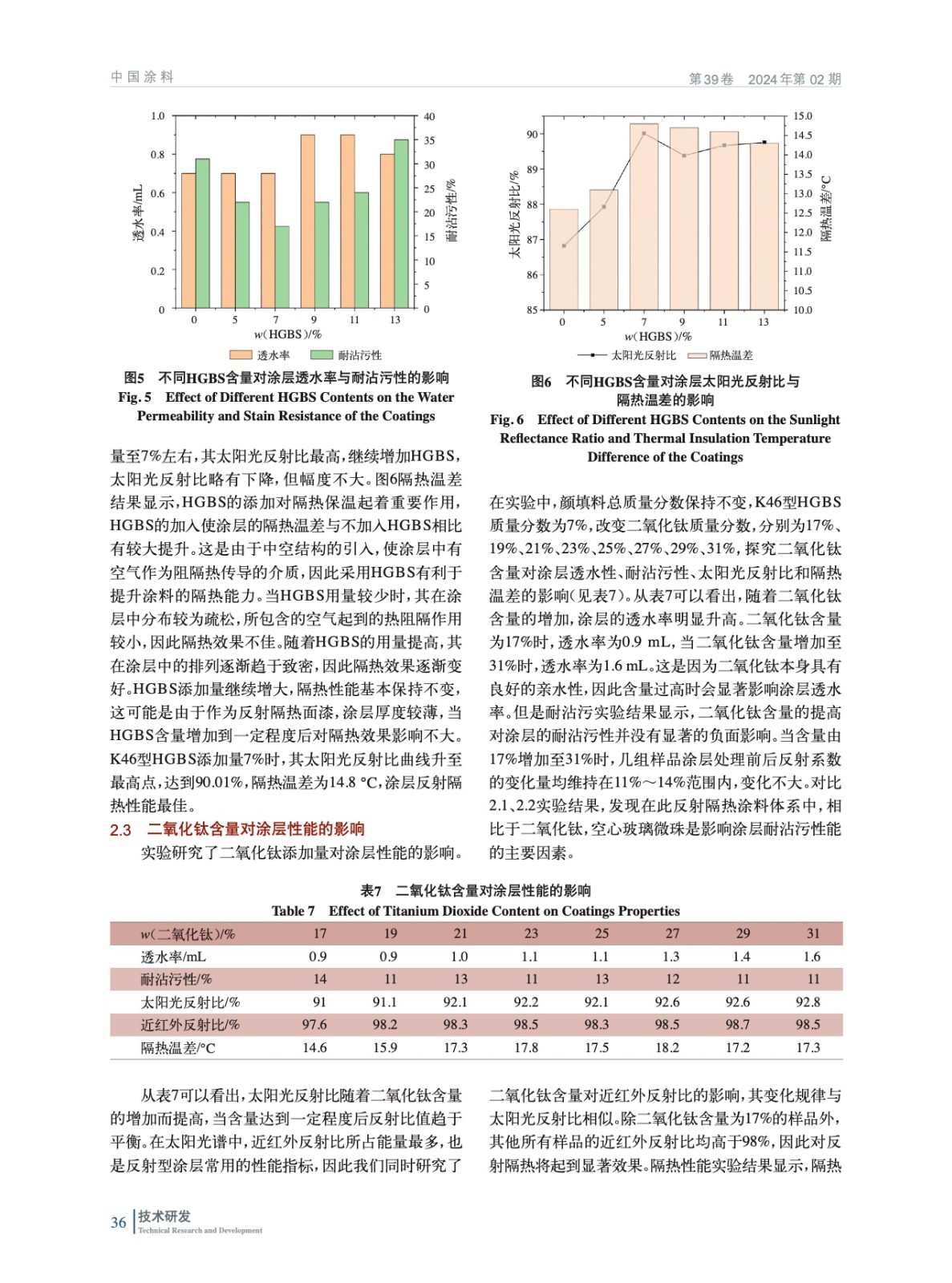 摘要:研究了反射隔熱涂料中重要組分對其性能的影響規(guī)律。以純丙乳膠作為成膜物,空心玻璃微珠和金紅石型二氧化鈦?zhàn)鳛楣δ芴盍?,在基本配方體系基礎(chǔ)上,通過單一變量控制法研究了空心玻璃微珠、金紅石型二氧化鈦的尺寸及添加量等因素對反射隔熱涂料透水及耐沾污性、太陽光反射性能和隔熱性能的影響規(guī)律,并制備得到綜合性能優(yōu)異的水性反射隔熱涂料。研究結(jié)果表明,反射隔熱填料不僅影響涂層的太陽光反射和隔熱性能,對于涂層的耐水和耐沾污性也有顯著影響。