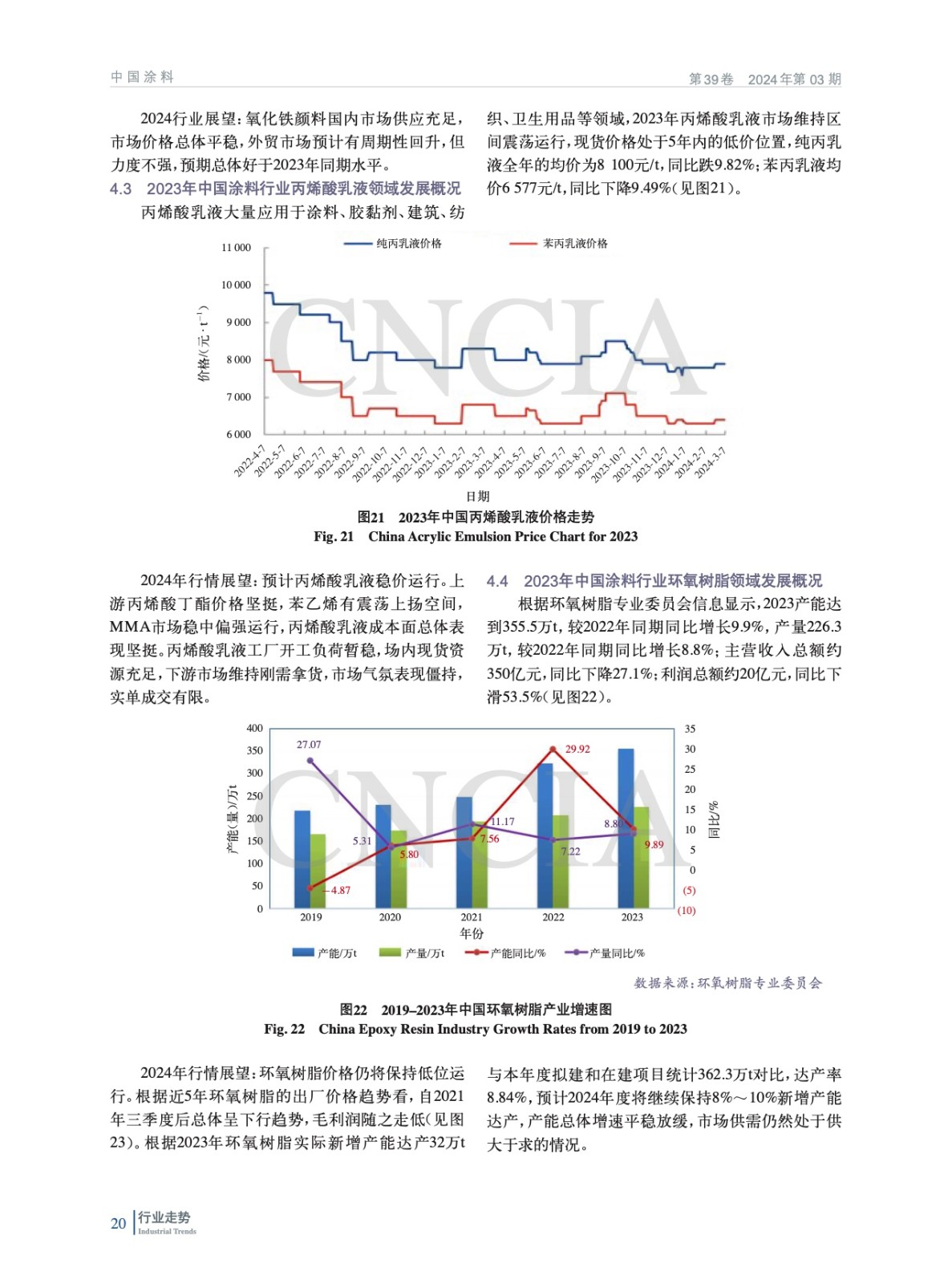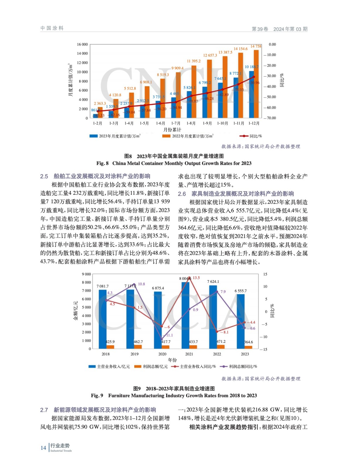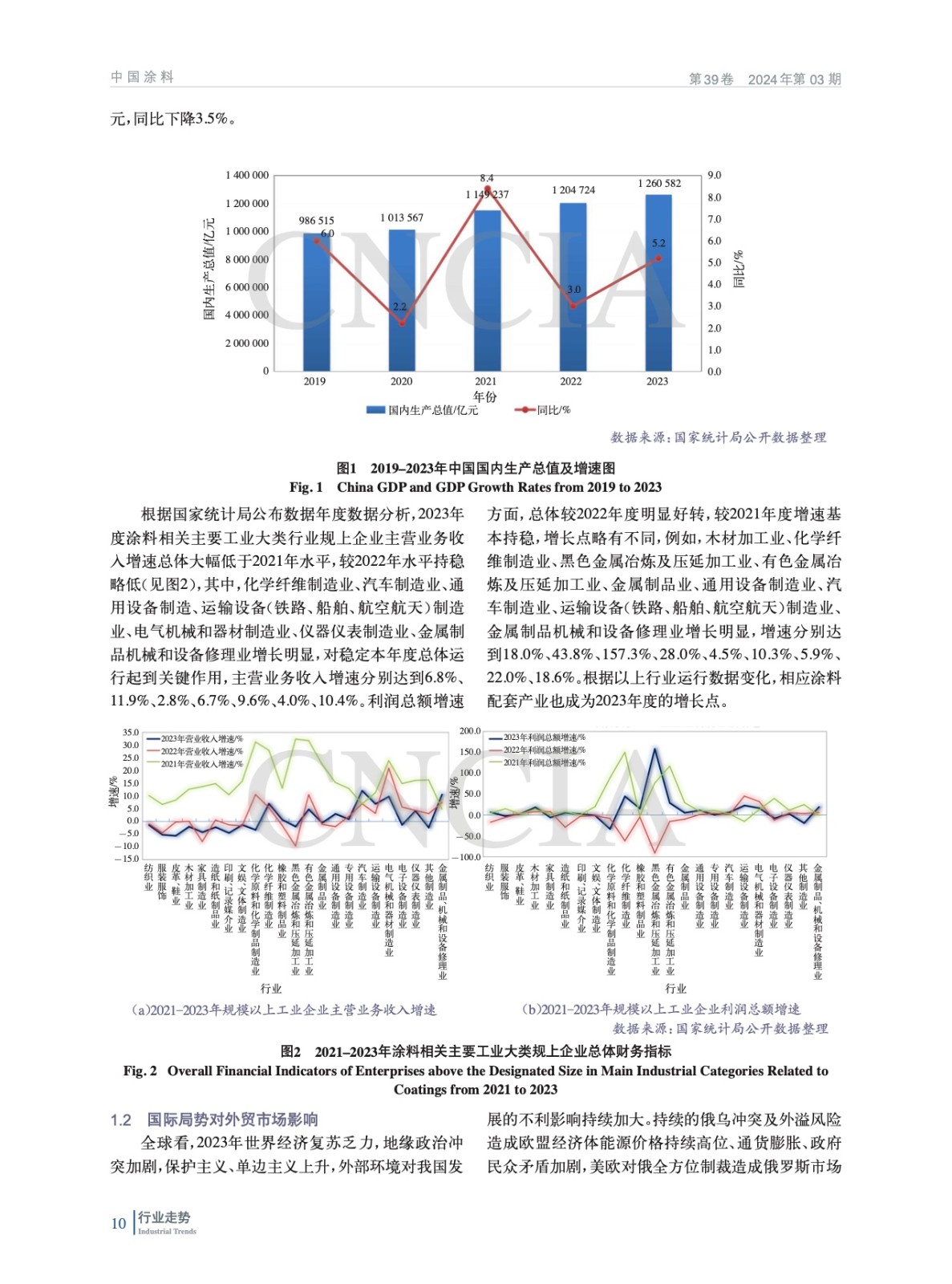 摘要:簡(jiǎn)析了2023年中國(guó)宏觀(guān)經(jīng)濟(jì)及外部環(huán)境發(fā)展情況,概括介紹了2023年涂料重點(diǎn)下游、新興領(lǐng)域發(fā)展概況及對(duì)涂料行業(yè)的影響,重點(diǎn)分析了2023年度中國(guó)涂料行業(yè)發(fā)展和進(jìn)出口情況,并對(duì)上游鈦白粉、氧化鐵、丙烯酸乳液和環(huán)氧樹(shù)脂領(lǐng)域發(fā)展情況進(jìn)行了概述。最后對(duì)中國(guó)涂料行業(yè)特征和發(fā)展趨勢(shì)進(jìn)行了分析和預(yù)測(cè)。