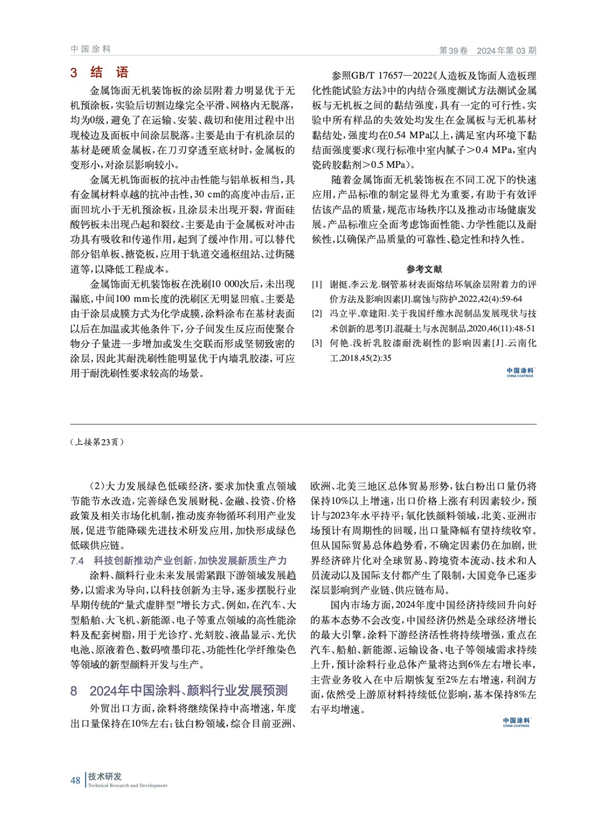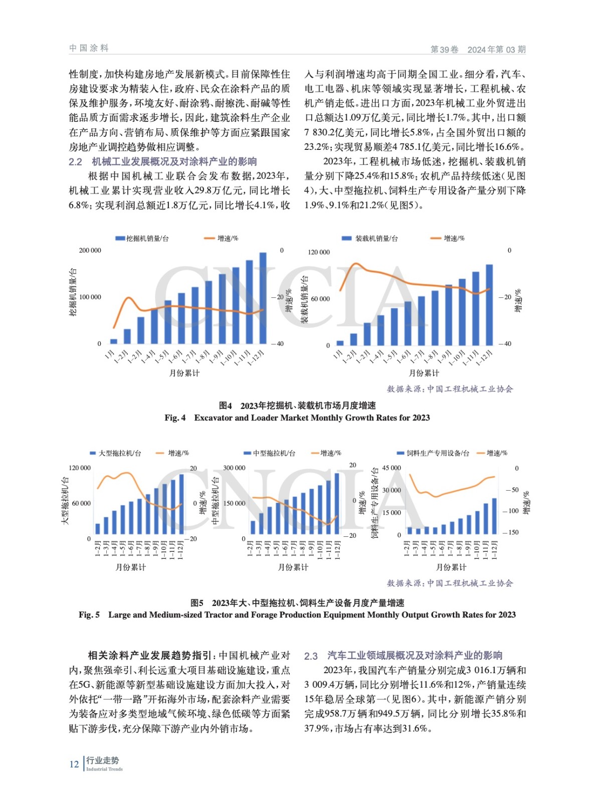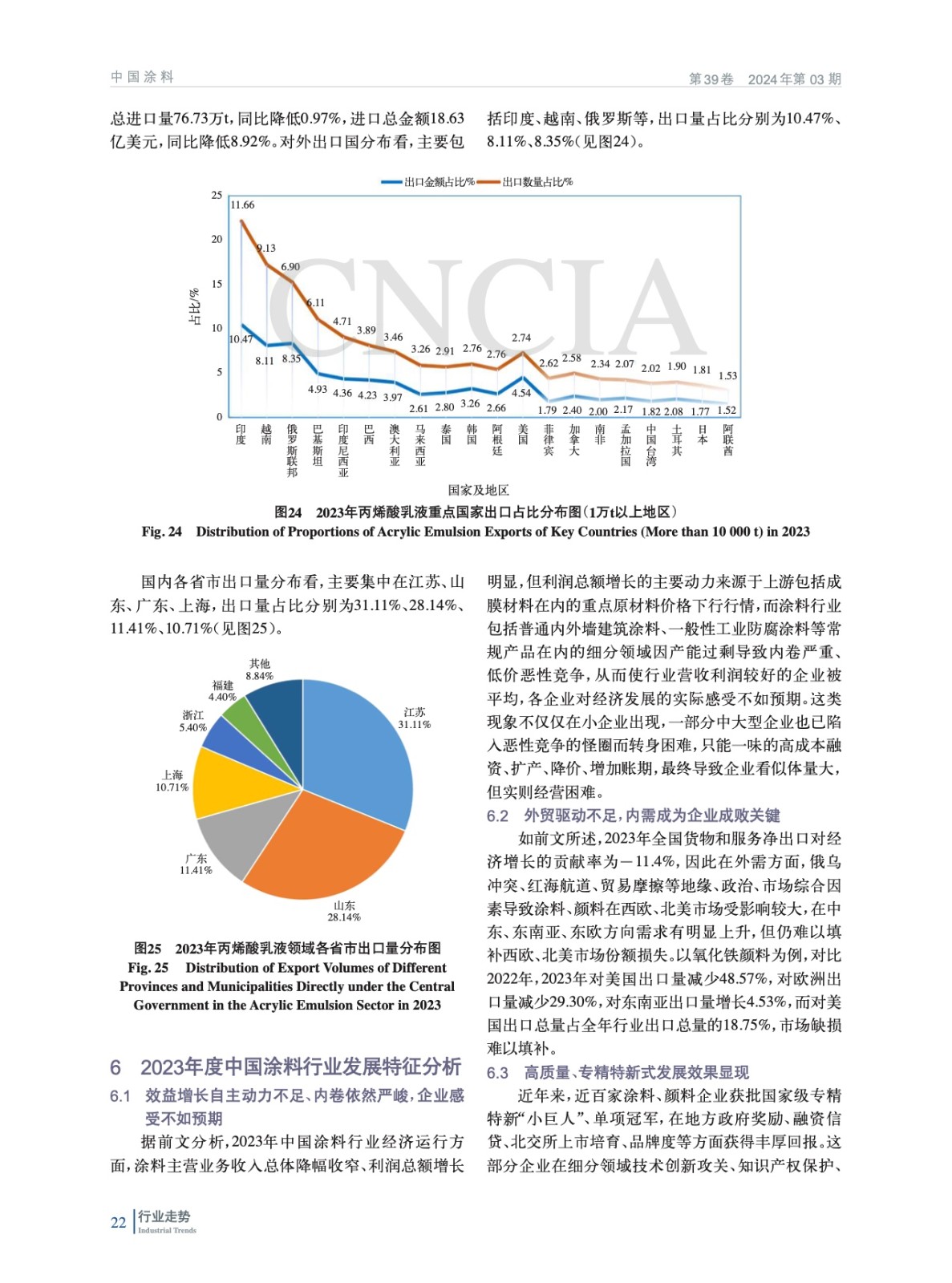 摘要:簡(jiǎn)析了2023年中國(guó)宏觀(guān)經(jīng)濟(jì)及外部環(huán)境發(fā)展情況,概括介紹了2023年涂料重點(diǎn)下游、新興領(lǐng)域發(fā)展概況及對(duì)涂料行業(yè)的影響,重點(diǎn)分析了2023年度中國(guó)涂料行業(yè)發(fā)展和進(jìn)出口情況,并對(duì)上游鈦白粉、氧化鐵、丙烯酸乳液和環(huán)氧樹(shù)脂領(lǐng)域發(fā)展情況進(jìn)行了概述。最后對(duì)中國(guó)涂料行業(yè)特征和發(fā)展趨勢(shì)進(jìn)行了分析和預(yù)測(cè)。