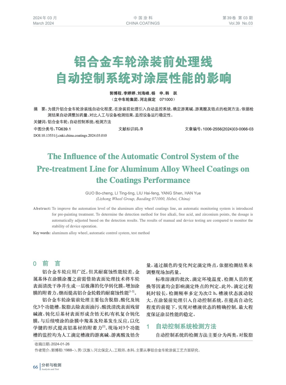 摘要:為提升鋁合金車輪涂裝線自動化程度,在涂裝前處理引入自動監(jiān)控系統(tǒng)。確定游離堿、游離酸及鋯點的檢測方法,依據(jù)檢測結(jié)果自動調(diào)整加藥量。對比人工與設(shè)備檢測結(jié)果,監(jiān)控設(shè)備運行穩(wěn)定性。