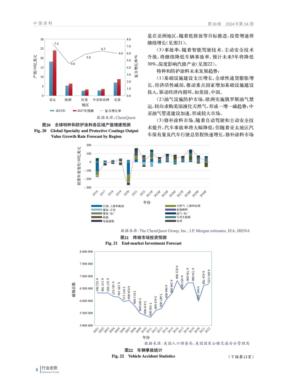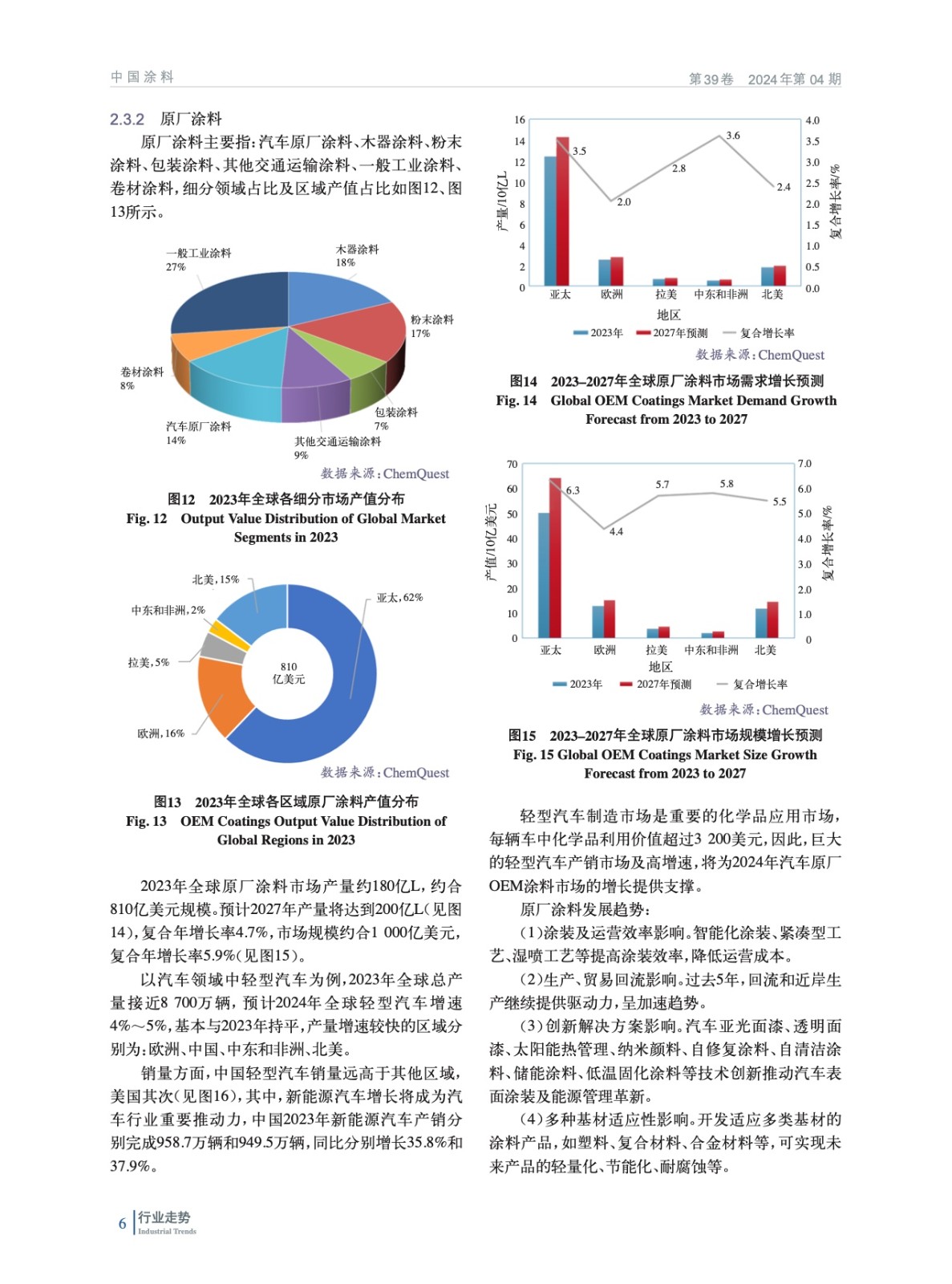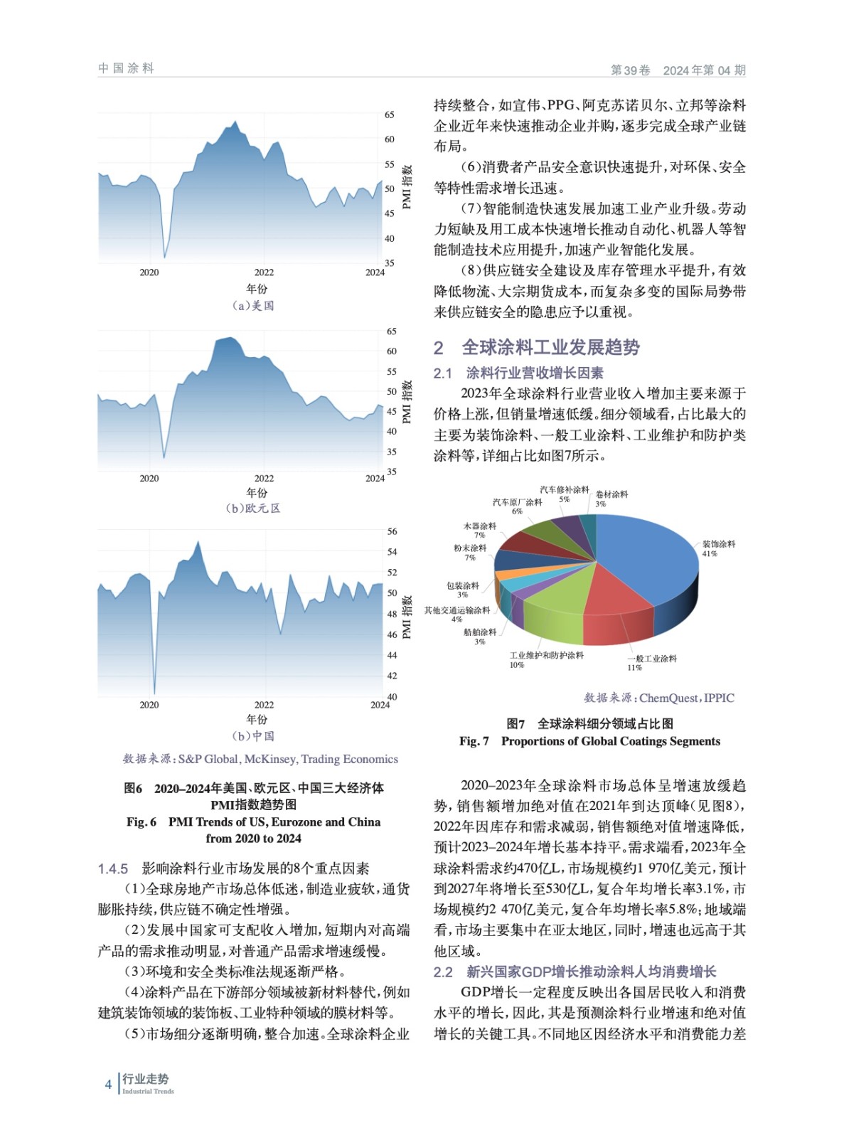摘要:綜述了全球經(jīng)濟(jì)概況、全球通脹和貿(mào)易對(duì)于涂料行業(yè)的影響,國際涂料行業(yè)整體動(dòng)態(tài)。闡述了涂料行業(yè)營收增長因素、新興國家GDP增長推動(dòng)涂料人均消費(fèi)增長概況,著重分析了建筑裝飾涂料、原廠涂料、特種與防護(hù)涂料等重點(diǎn)涂料細(xì)分領(lǐng)域發(fā)展趨勢。并從全球經(jīng)濟(jì)發(fā)展重要驅(qū)動(dòng)方向?qū)θ蛲苛瞎I(yè)未來發(fā)展進(jìn)行了展望。