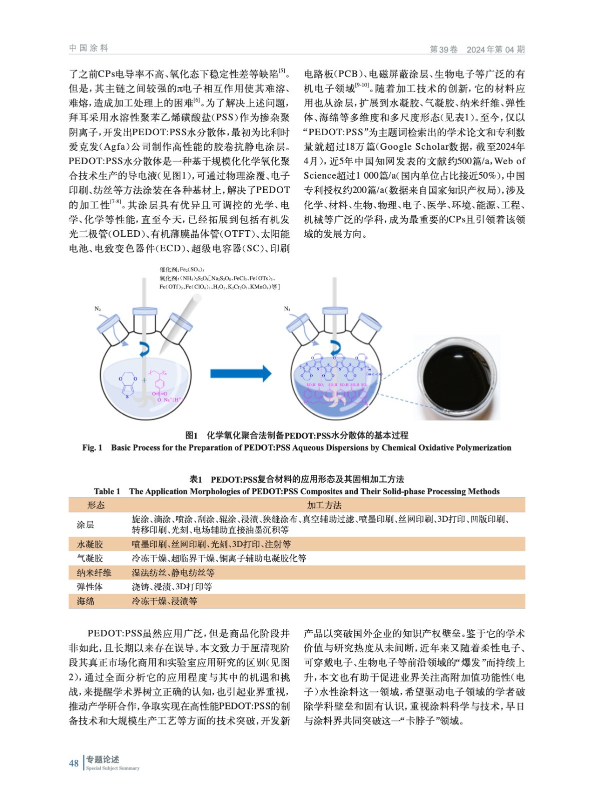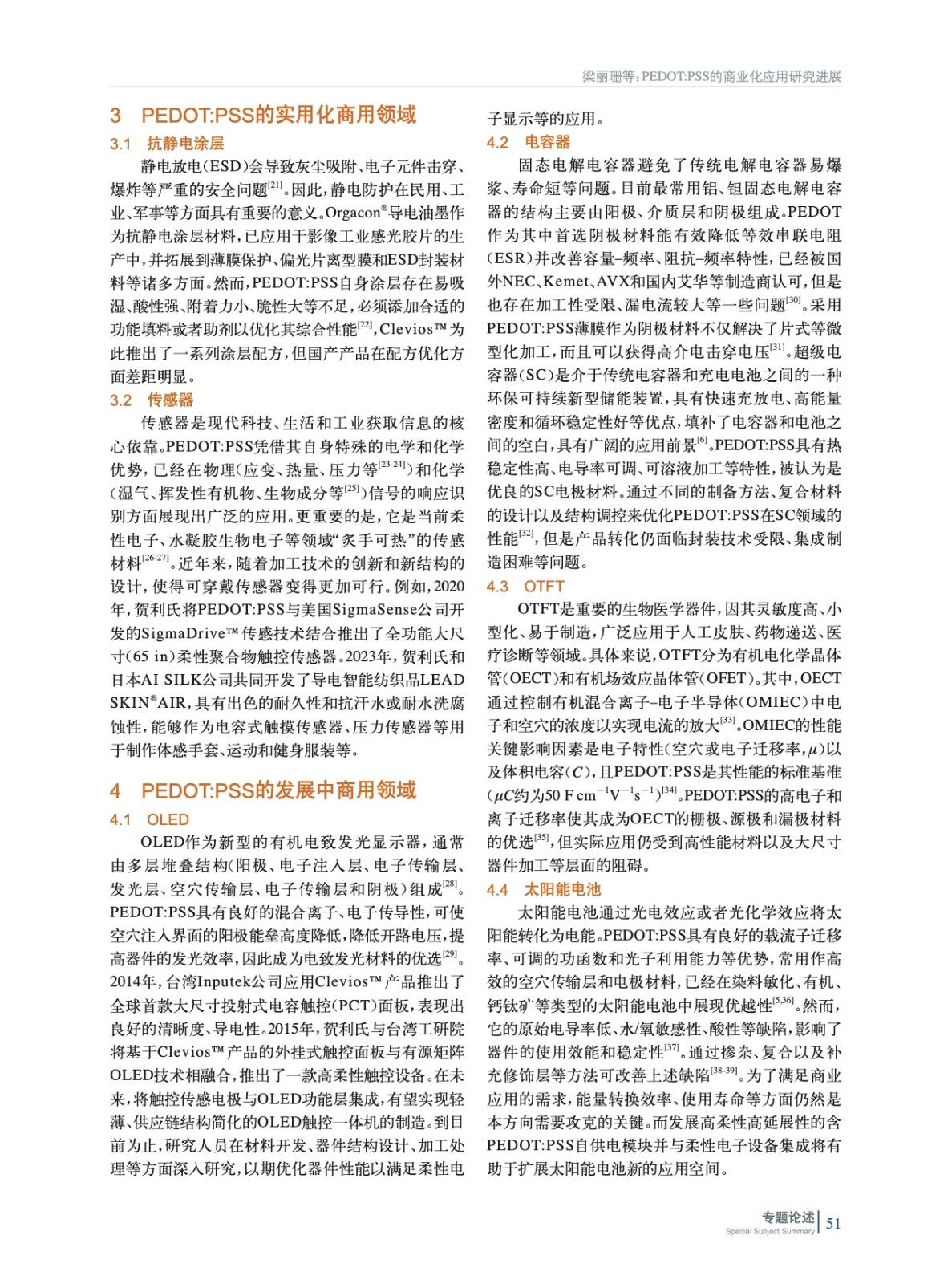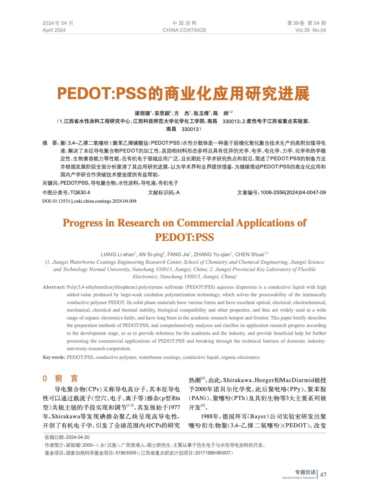 摘要:聚(3,4–乙撐二氧噻吩):聚苯乙烯磺酸鹽(PEDOT:PSS)水性分散體是一種基于規(guī)?;趸酆霞夹g(shù)生產(chǎn)的高附加值導(dǎo)電液,解決了本征導(dǎo)電聚合物PEDOT的加工性,其固相材料形態(tài)多樣且具有優(yōu)異的光學(xué)、電學(xué)、電化學(xué)、力學(xué)、化學(xué)和熱學(xué)穩(wěn)定性、生物兼容能力等性能,在有機(jī)電子領(lǐng)域應(yīng)用廣泛,且長期處于學(xué)術(shù)研究熱點(diǎn)和前沿。簡述了PEDOT:PSS的制備方法并根據(jù)發(fā)展階段全面分析厘清了其應(yīng)用研究進(jìn)展,以為學(xué)術(shù)界和業(yè)界提供借鑒,為繼續(xù)推動(dòng)PEDOT:PSS的商業(yè)化應(yīng)用和國內(nèi)產(chǎn)學(xué)研合作突破技術(shù)壁壘提供有益幫助。