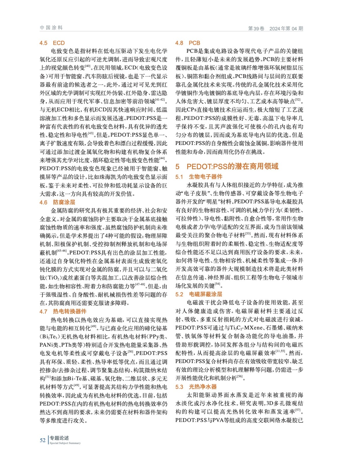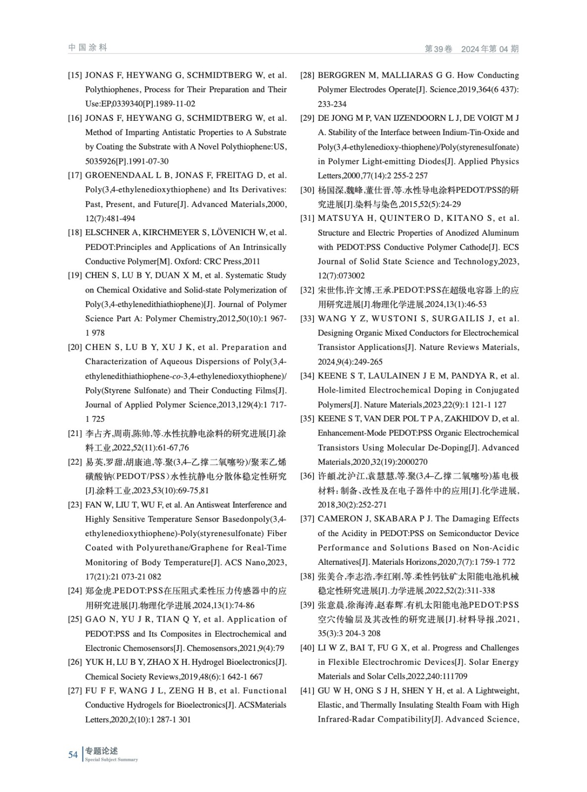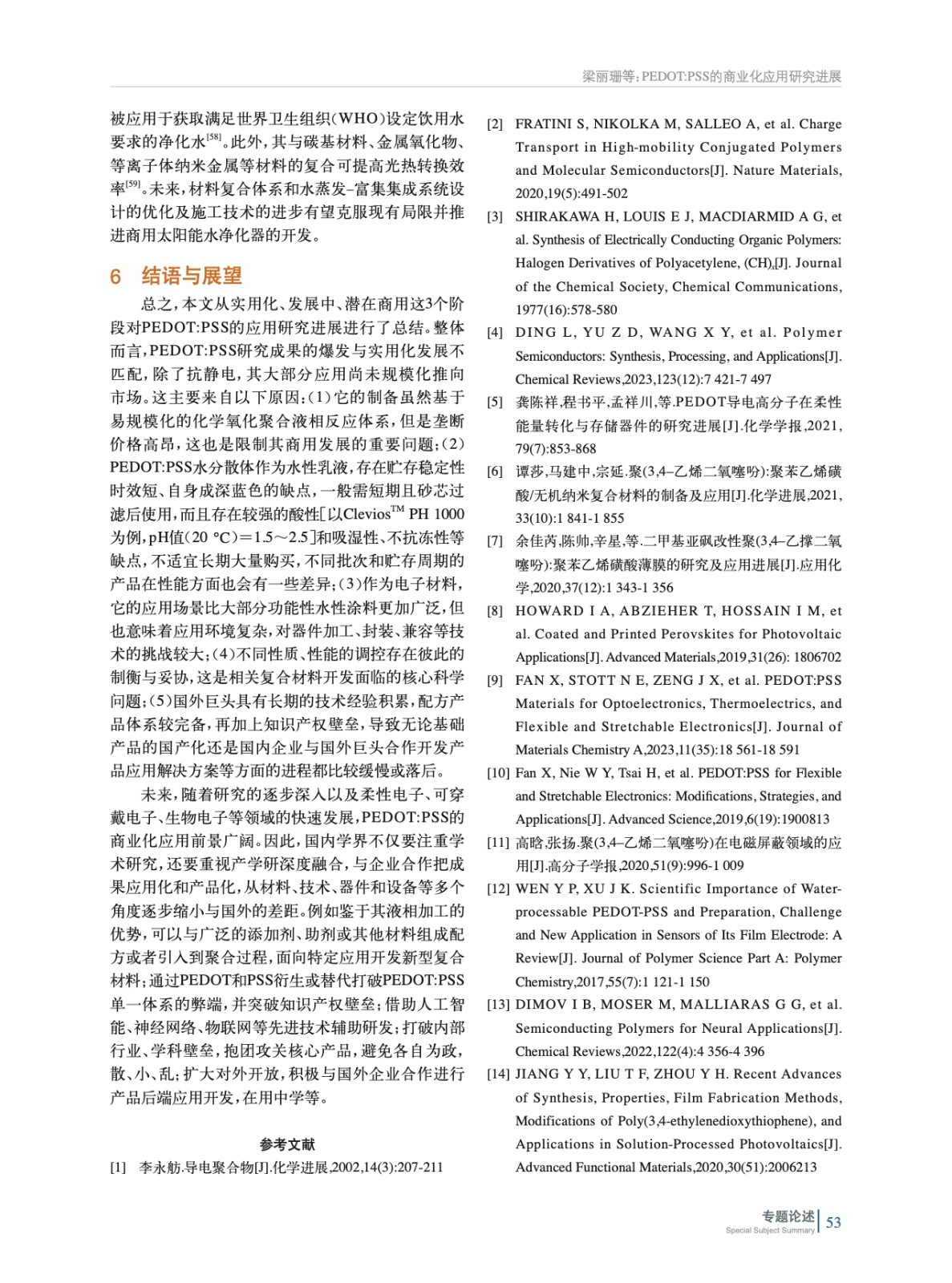 摘要:聚(3,4–乙撐二氧噻吩):聚苯乙烯磺酸鹽(PEDOT:PSS)水性分散體是一種基于規(guī)?;趸酆霞夹g(shù)生產(chǎn)的高附加值導(dǎo)電液,解決了本征導(dǎo)電聚合物PEDOT的加工性,其固相材料形態(tài)多樣且具有優(yōu)異的光學(xué)、電學(xué)、電化學(xué)、力學(xué)、化學(xué)和熱學(xué)穩(wěn)定性、生物兼容能力等性能,在有機(jī)電子領(lǐng)域應(yīng)用廣泛,且長期處于學(xué)術(shù)研究熱點(diǎn)和前沿。簡述了PEDOT:PSS的制備方法并根據(jù)發(fā)展階段全面分析厘清了其應(yīng)用研究進(jìn)展,以為學(xué)術(shù)界和業(yè)界提供借鑒,為繼續(xù)推動(dòng)PEDOT:PSS的商業(yè)化應(yīng)用和國內(nèi)產(chǎn)學(xué)研合作突破技術(shù)壁壘提供有益幫助。