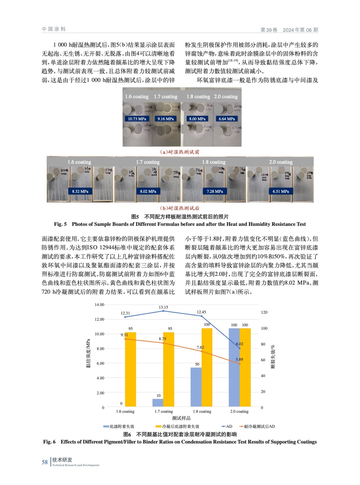 摘要:在80%鋅含量環(huán)氧涂料中,以長石粉作為另一種輔助顏填料,通過改變總顏填料與基料的比例(即顏基比),制備了臨界狀態(tài)附近4種不同顏基比(1.6、1.7、1.8以及2.0)的涂料樣品,并探究了顏基比對涂膜形成結構以及涂膜防腐蝕性能的影響。測試結果顯示,隨著顏基比的增加,4種測試涂層的吸水率增大,96 h泡水測試后,顏基比為2.0的涂層吸水率約為1.6顏基比涂層的7.8倍;電化學測試Bode圖中低頻阻抗模量(Z0.01 Hz)減小,1.6顏基比涂層的阻抗值約為2.0顏基比涂層阻抗值的10倍,意味著涂層的阻隔性能減弱;連續(xù)冷凝、耐鹽霧以及耐濕熱防腐測試后涂膜的附著力均有所降低,表明了涂膜的防腐性能降低。盡管顏基比越高涂料的價格降低,但從環(huán)氧富鋅底漆應具備良好的防銹性能再追求性價比的角度考慮,顏基比建議不高于2.0,以確保防腐測試后涂層仍具有優(yōu)異的附著力(不低于5 MPa)。